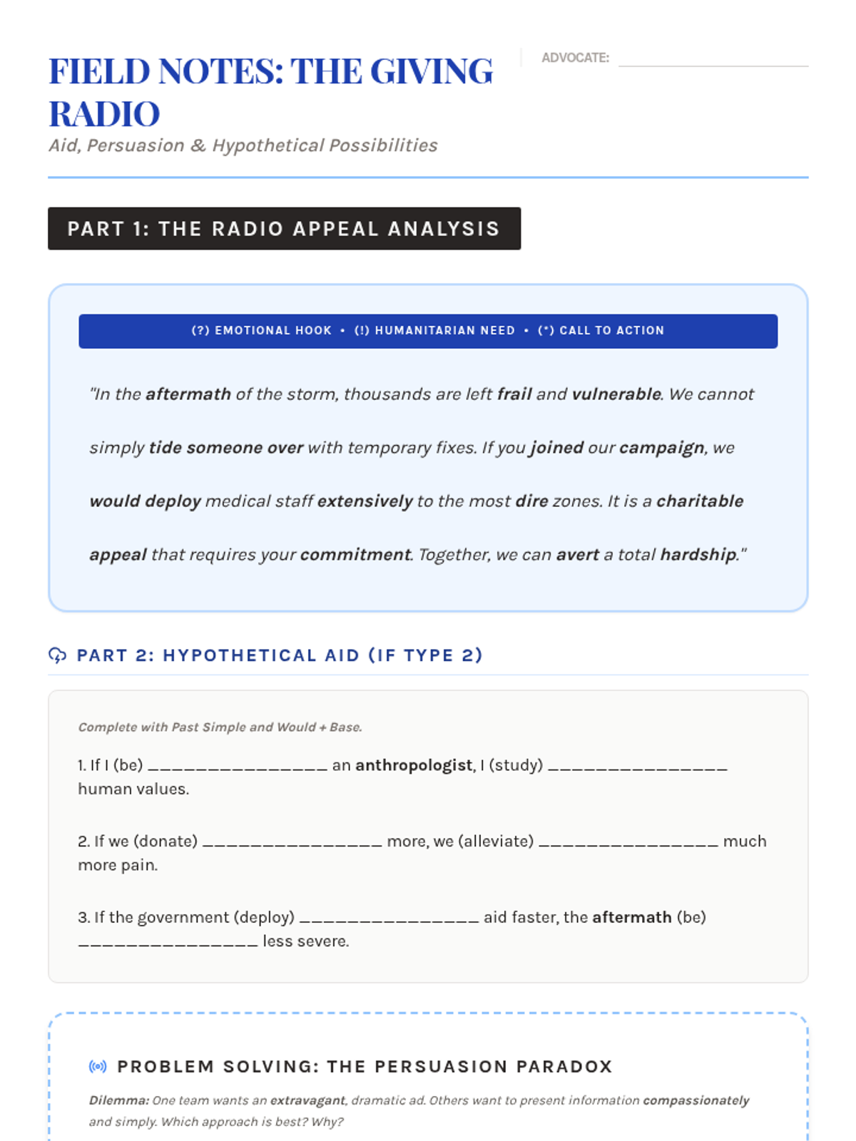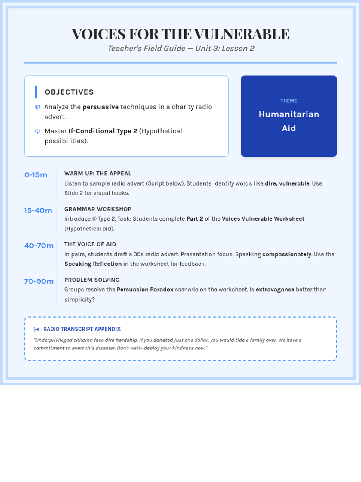 A focus on humanitarian aid and the power of persuasion. Students analyze charity radio adverts, practice presenting information compassionately, and use If-conditional Type 2 to explore hypothetical possibilities.