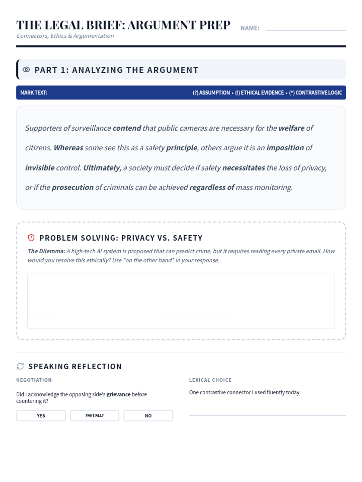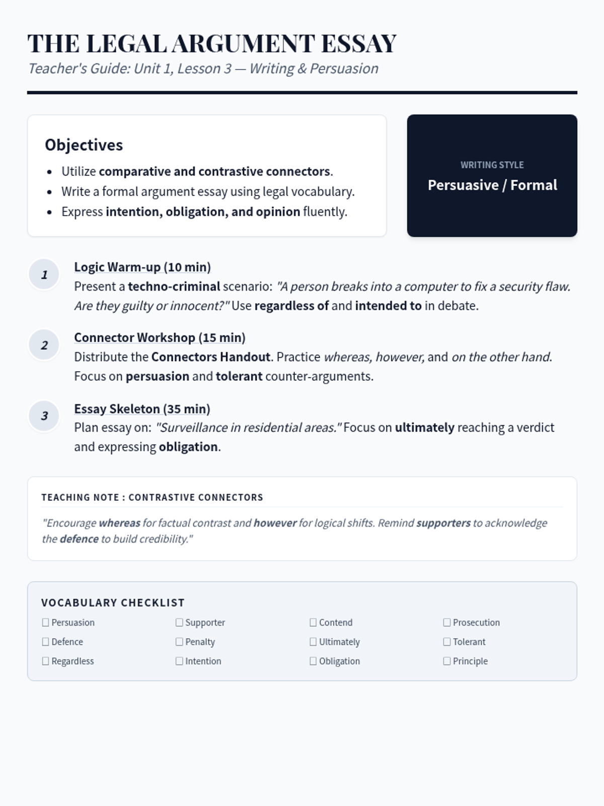 A focus on persuasive writing and formal argumentation. Students use contrastive connectors to build a balanced legal essay and engage in a mock trial to practice expressing obligation and opinion.