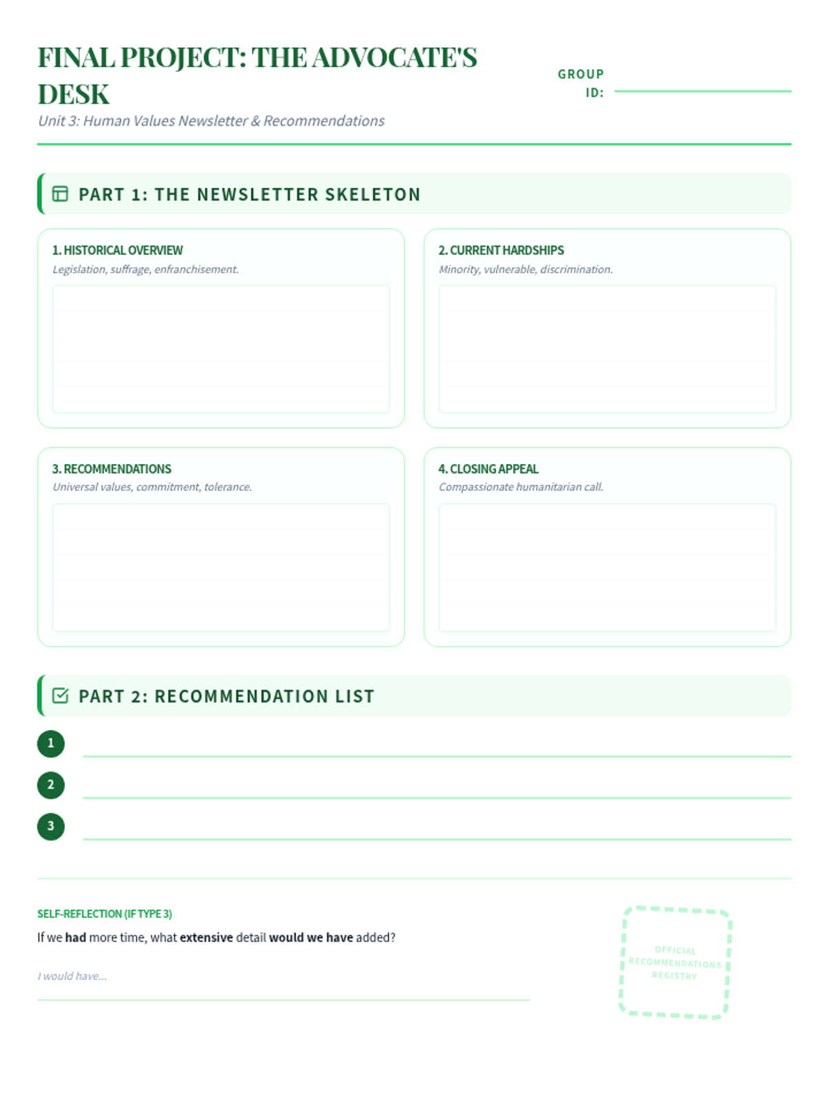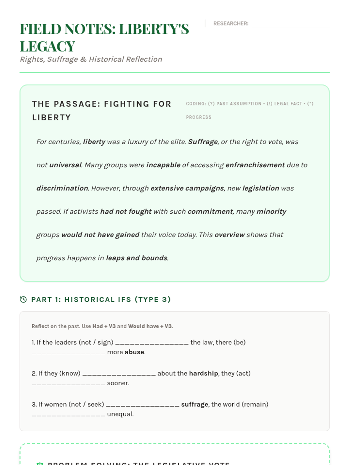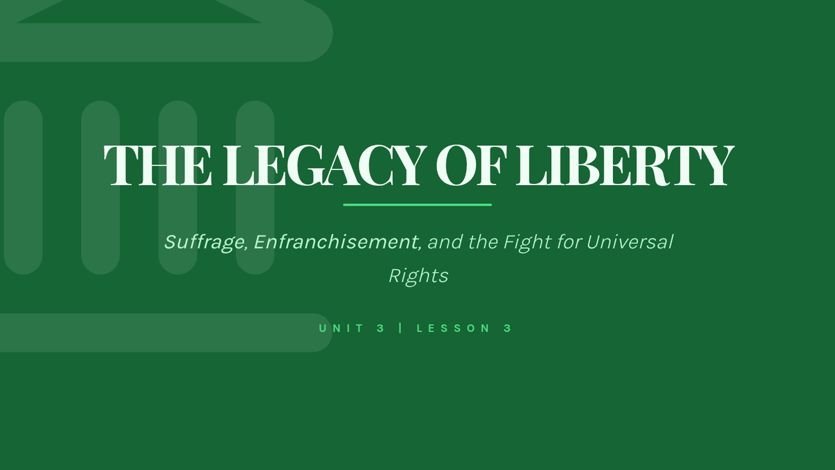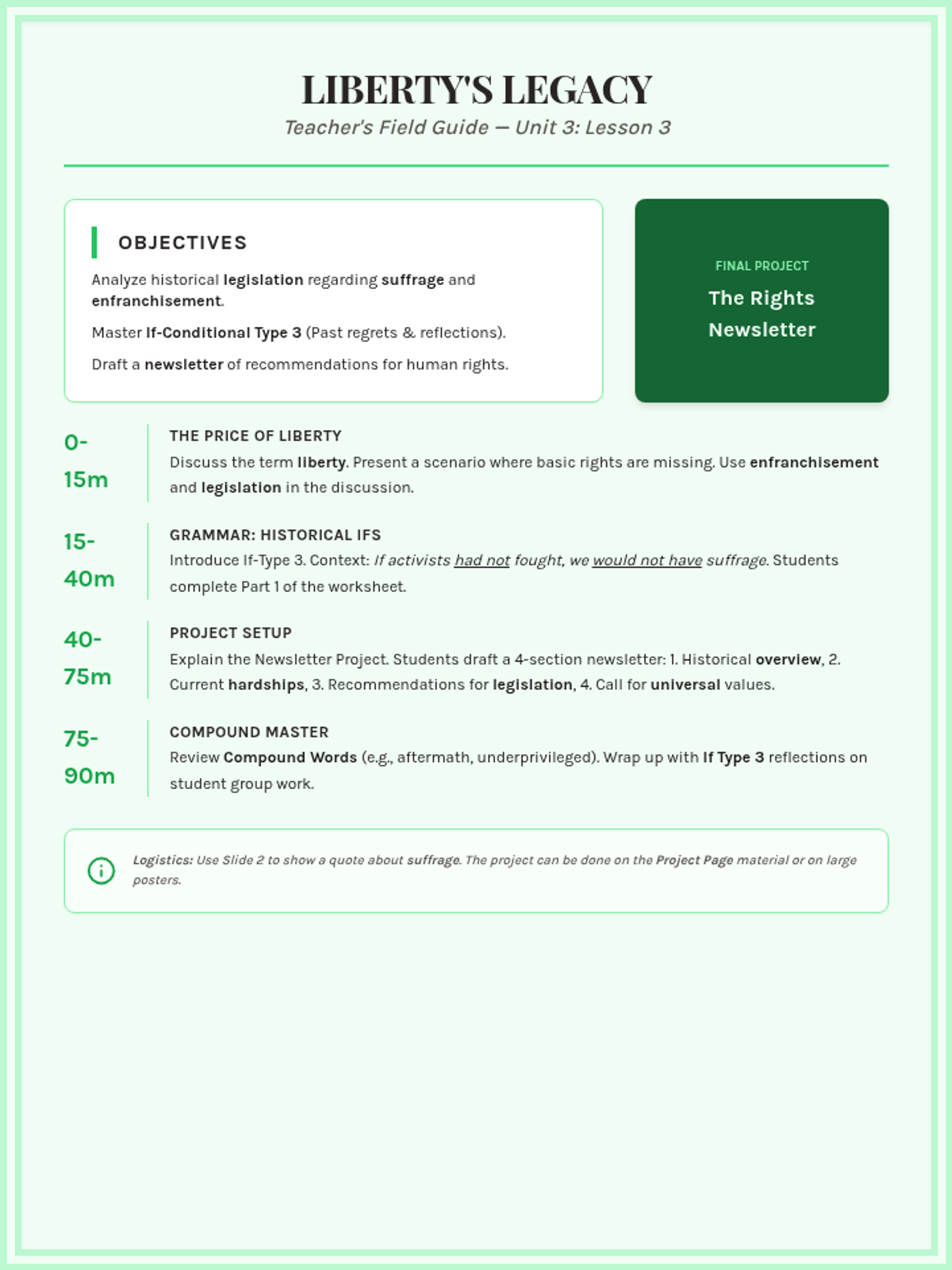 An exploration of human rights, suffrage, and the legislative process. Students draft a newsletter of recommendations, master If-conditional Type 3 for historical reflection, and discuss the value of liberty.