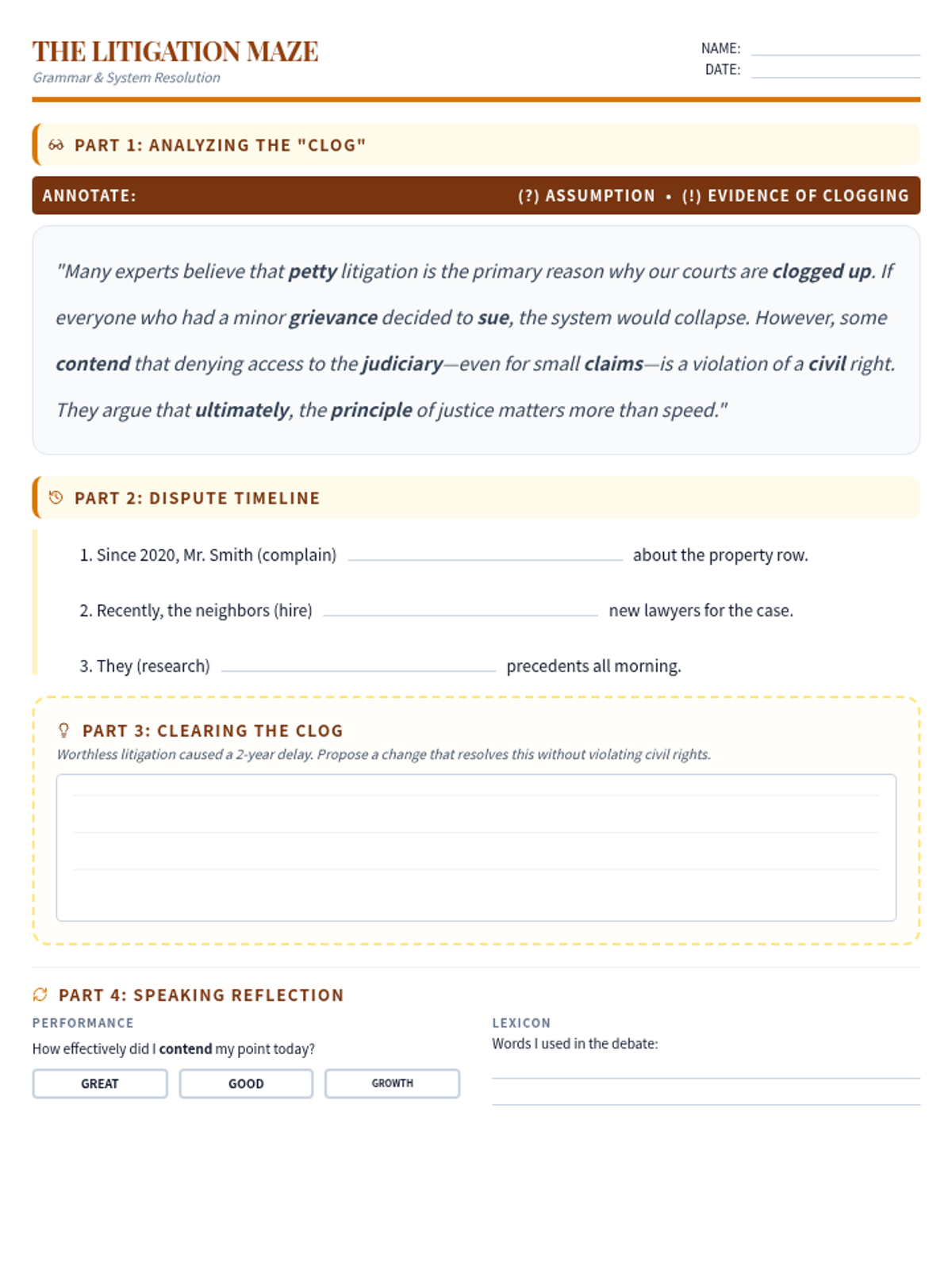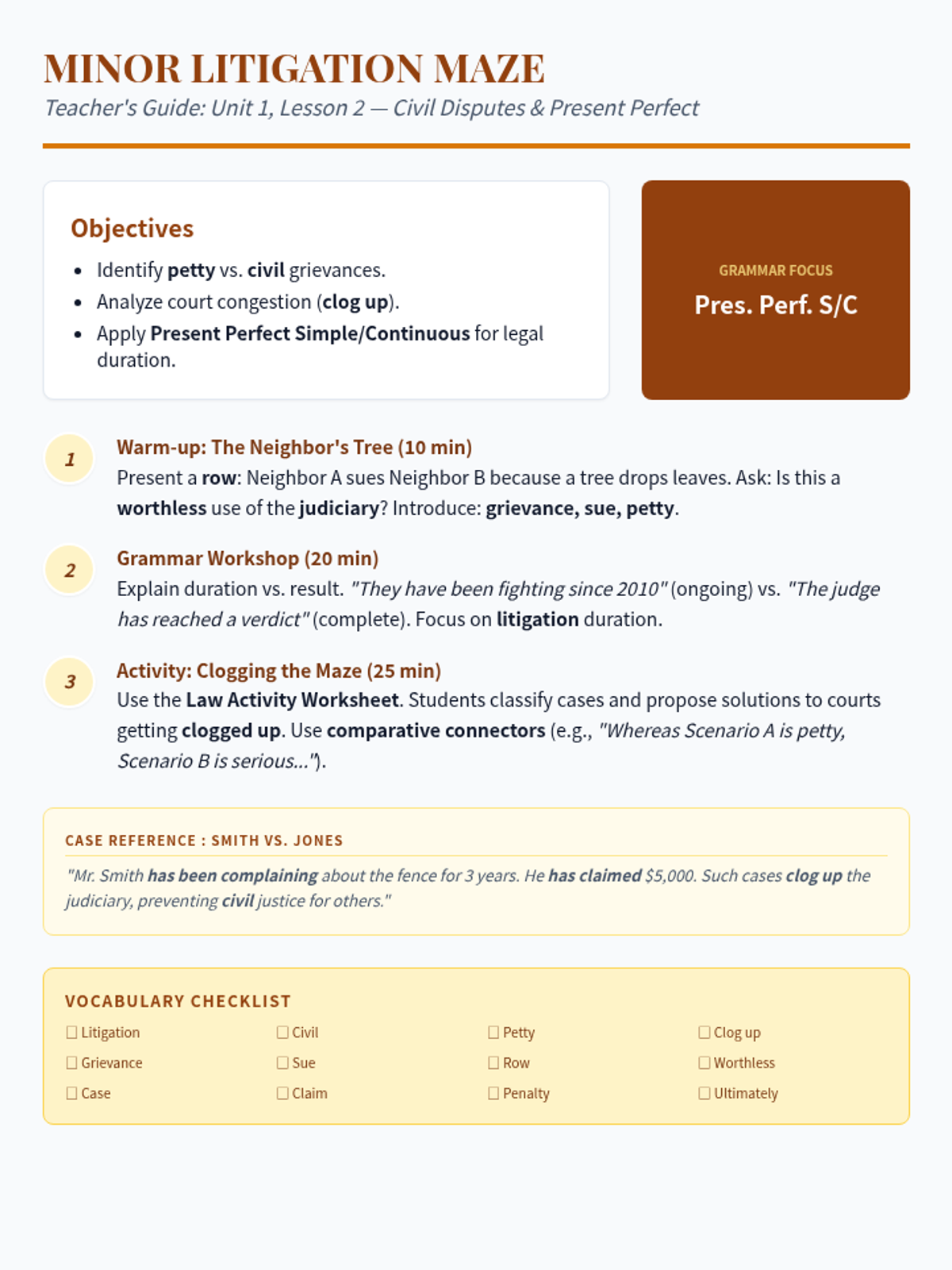 An exploration of minor litigation and civil law. Students analyze the 'clogged' legal system and master the Present Perfect Simple and Continuous to describe ongoing legal disputes.