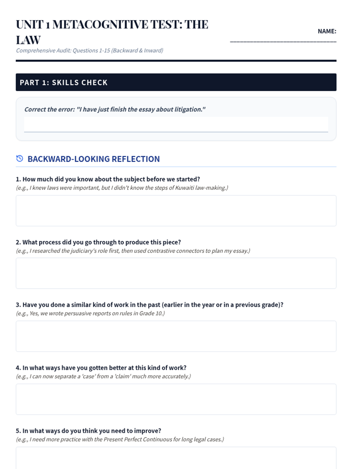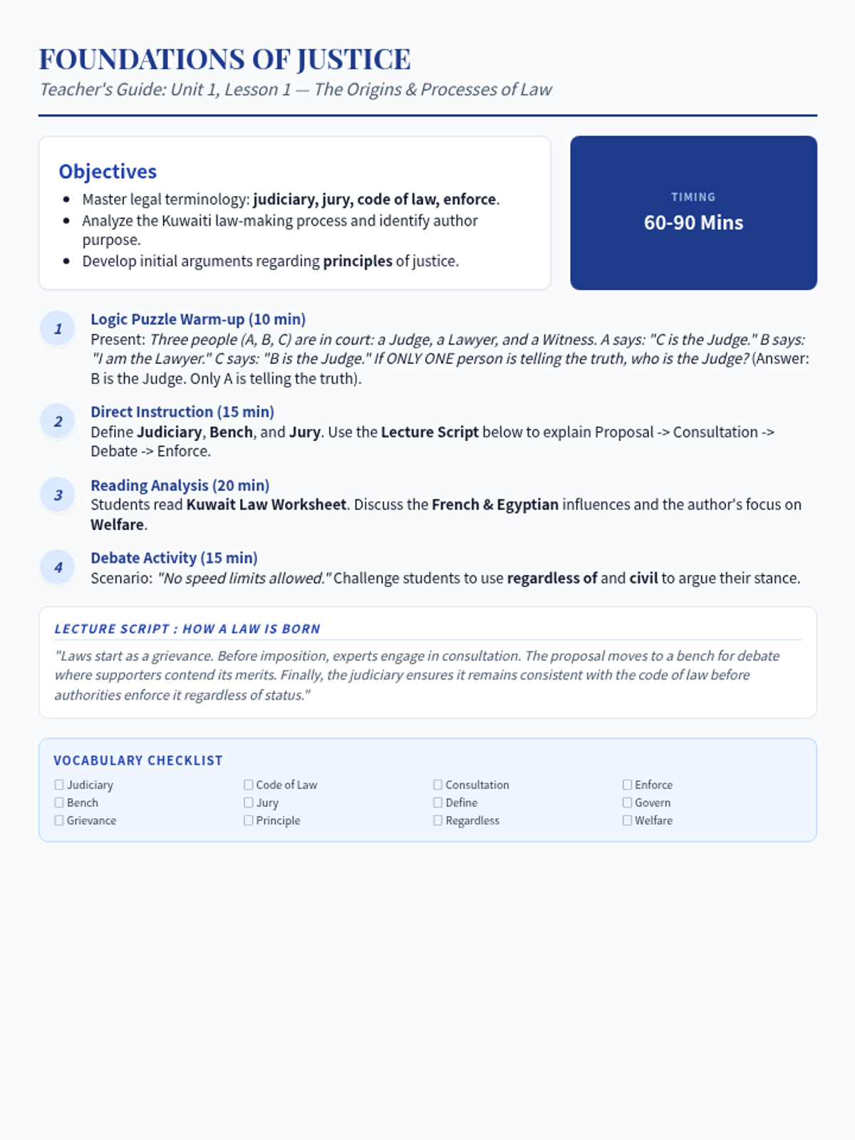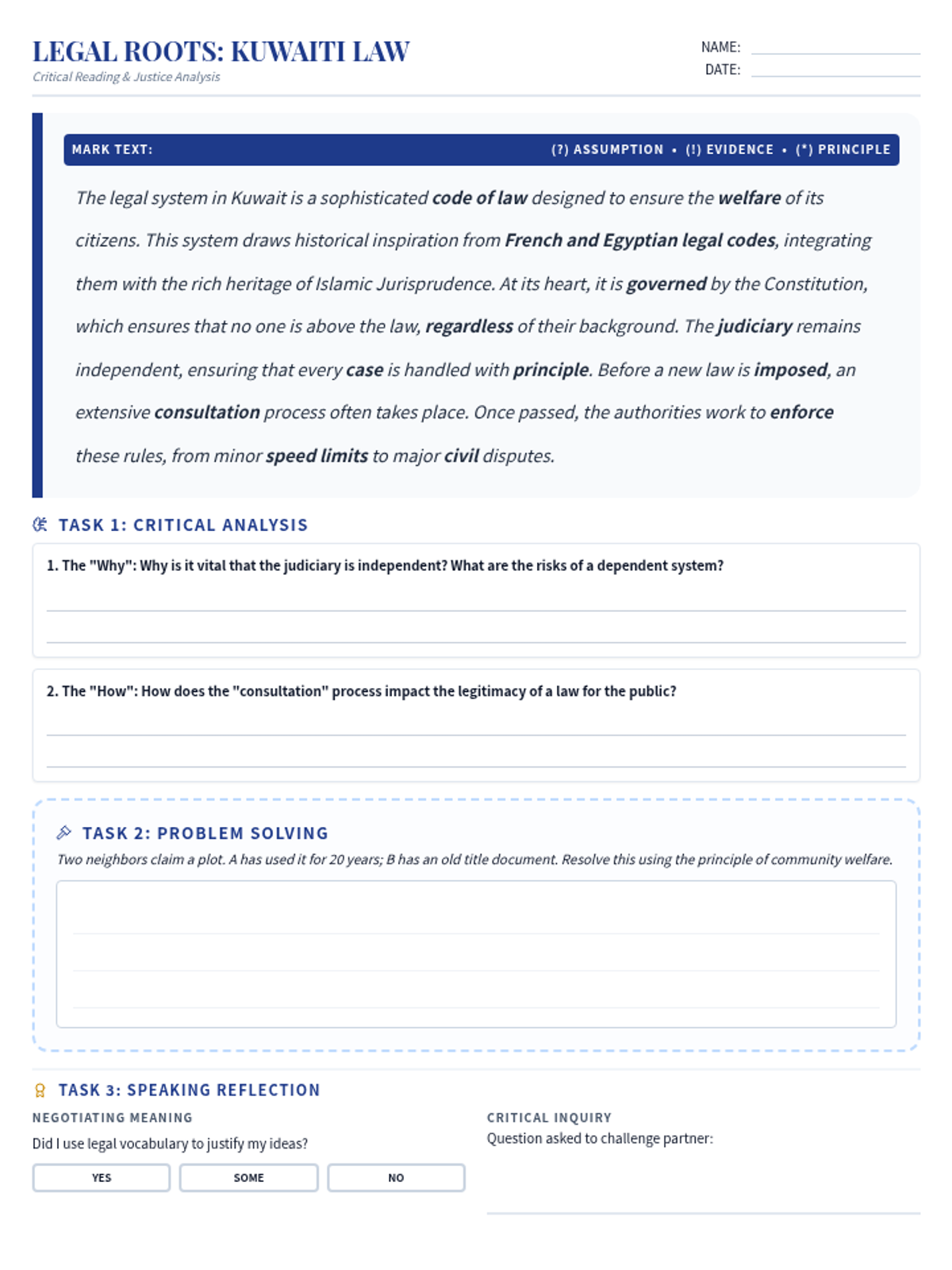 An introduction to the origins and functions of legal systems, focusing on the law-making process and Kuwaiti legal history. Students build a foundation in legal vocabulary and identify author purpose in technical texts.