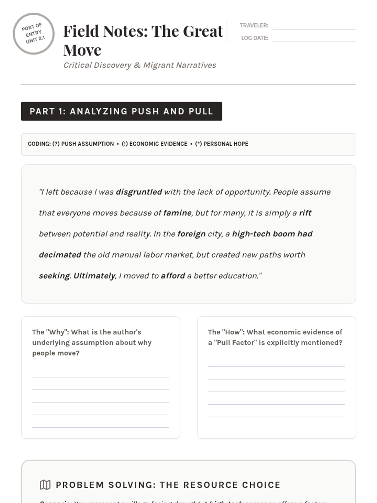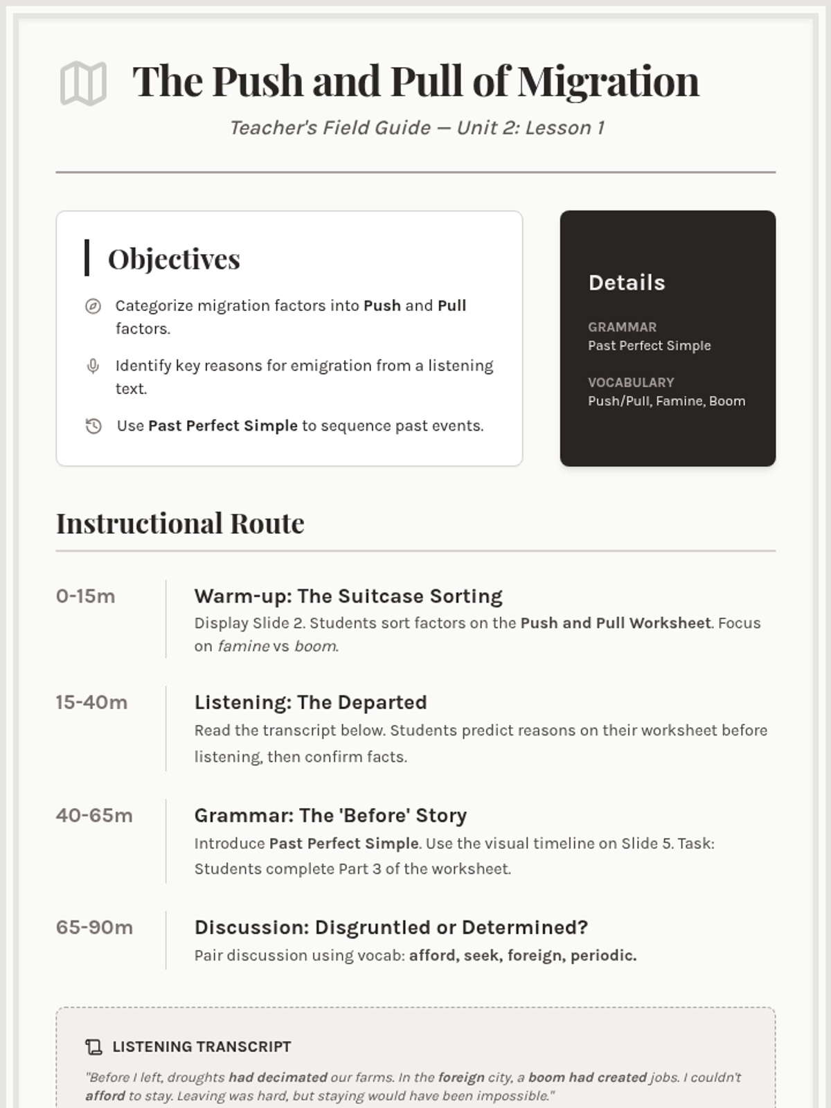 An exploration of the reasons why people move, focusing on push and pull factors like famine and economic booms. Students practice listening skills and begin using the past perfect to describe events leading up to emigration.