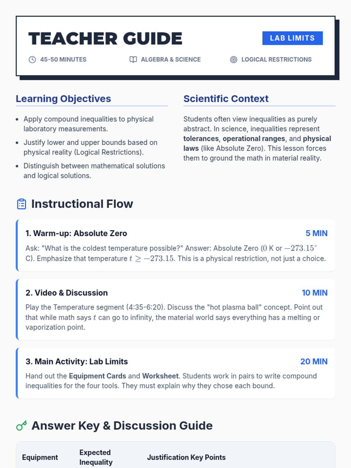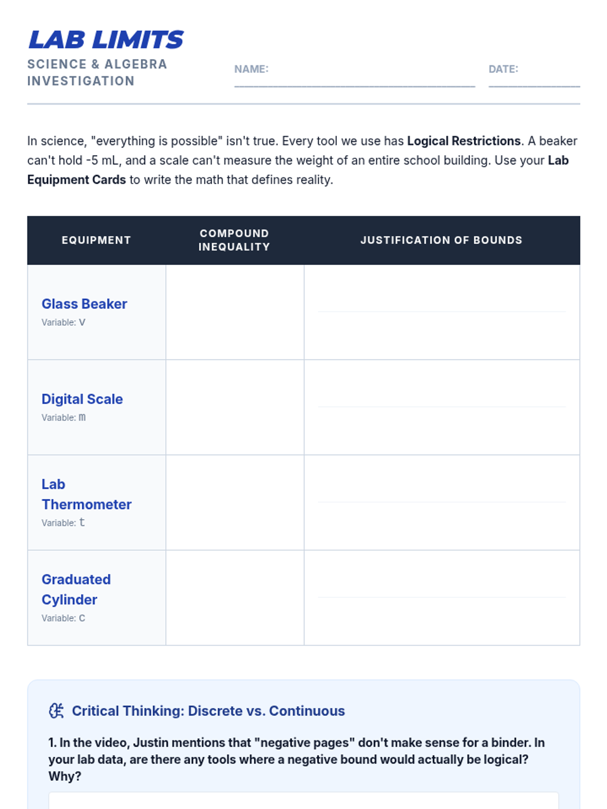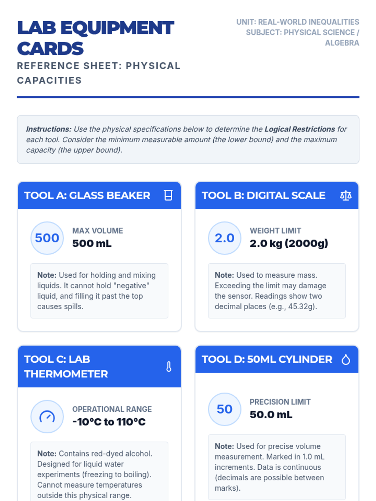 Students bridge algebra and science by applying inequality restrictions to real-world laboratory measurement tools, exploring concepts like absolute zero, equipment capacity, and logical limits.