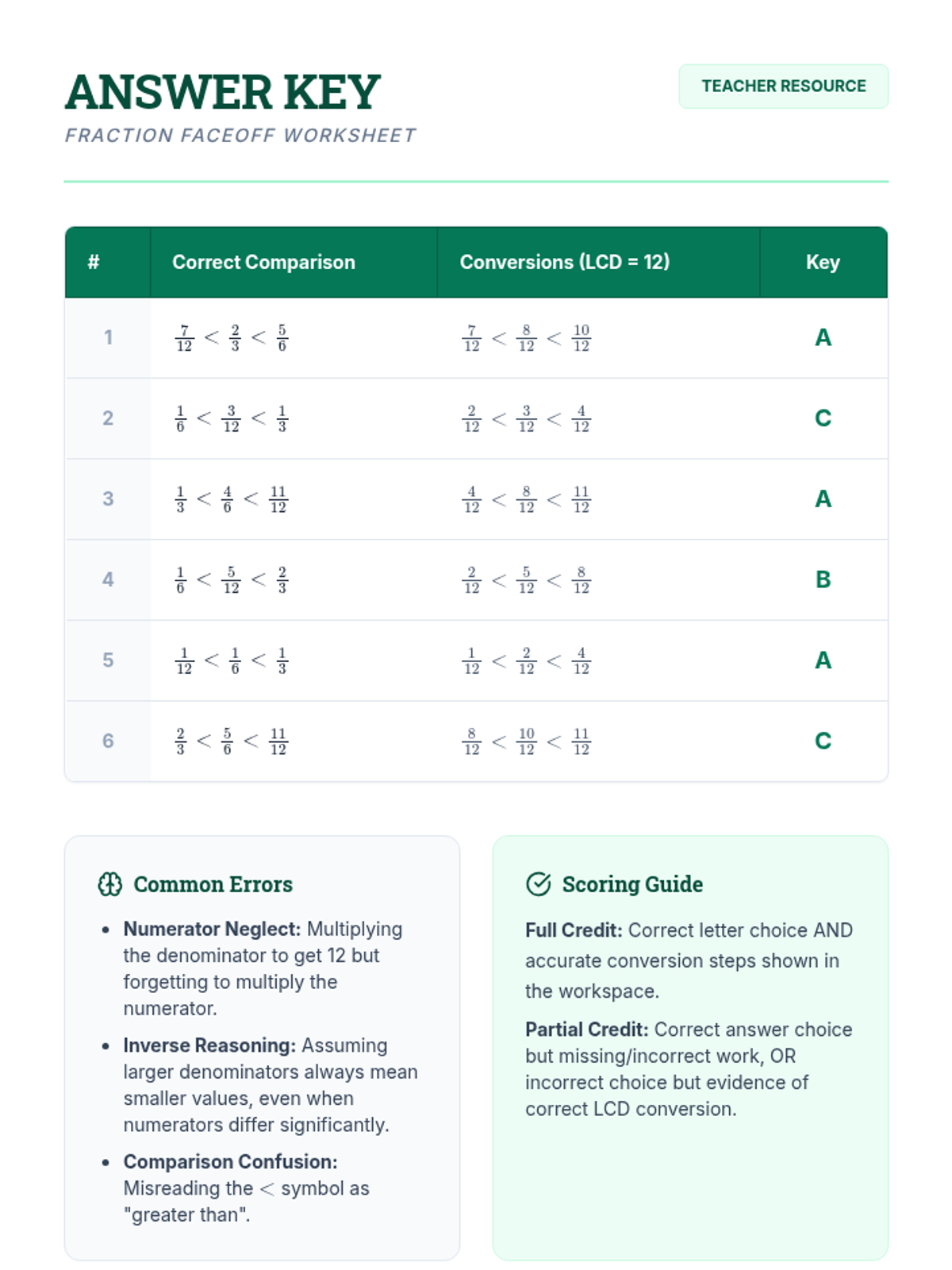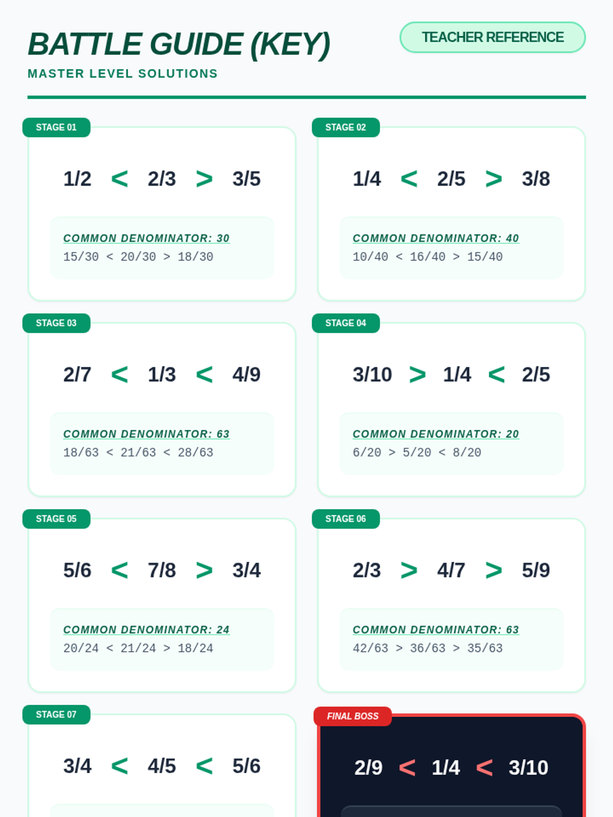 A high-stakes math challenge where students compare three fractions with unrelated denominators to defeat the 'Fraction Boss'. Includes a practice worksheet and a detailed answer key.
