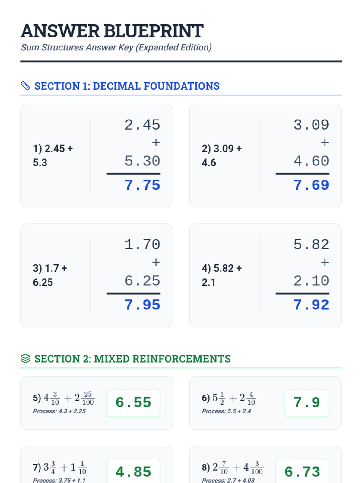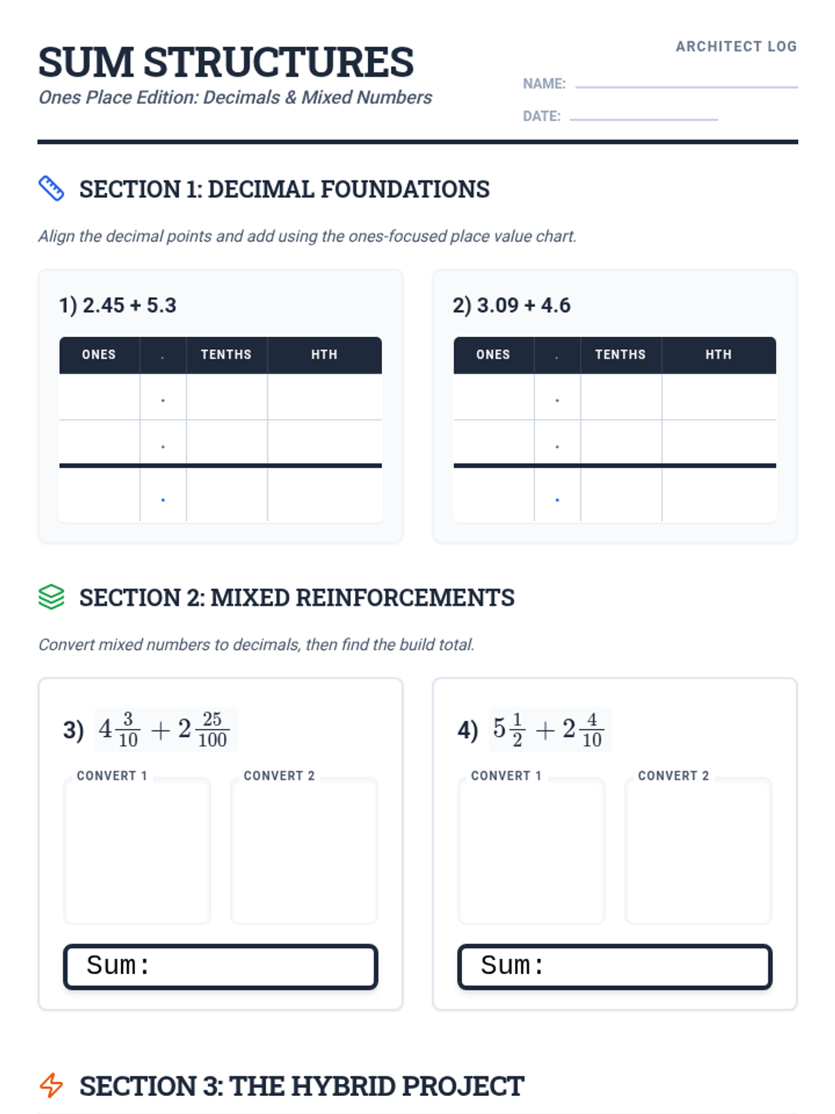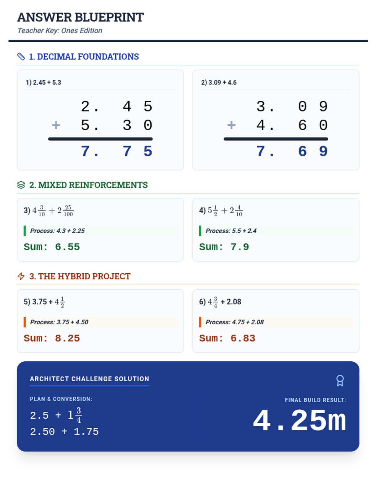 A comprehensive lesson on adding decimals, mixed numbers, and their combinations using place value strategies and 'blueprint' visualizations.