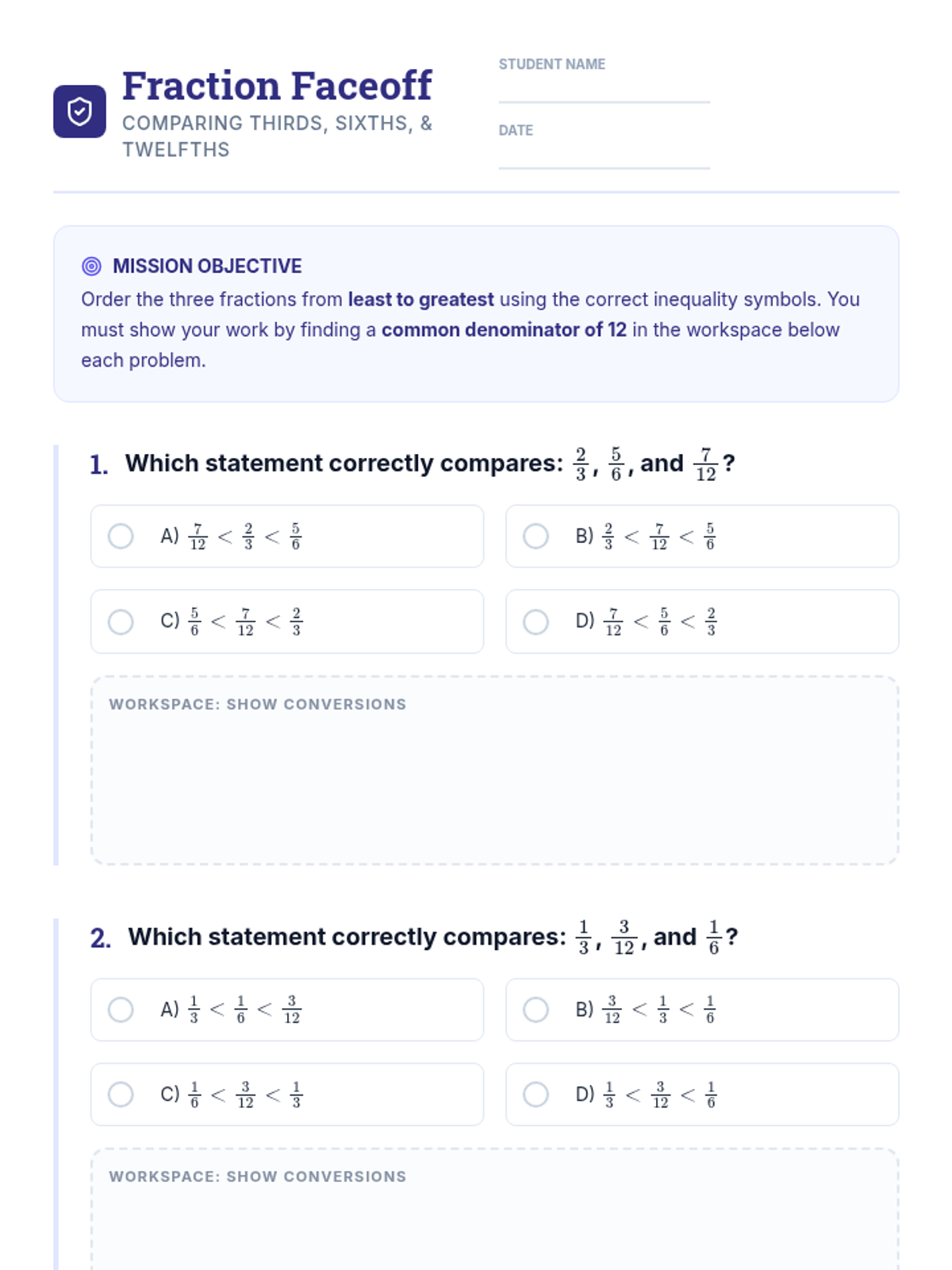 A lesson focused on comparing and ordering fractions with unlike denominators (thirds, sixths, and twelfths) through mathematical reasoning and common denominator conversion.