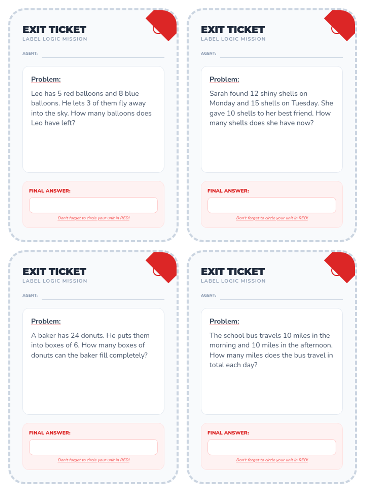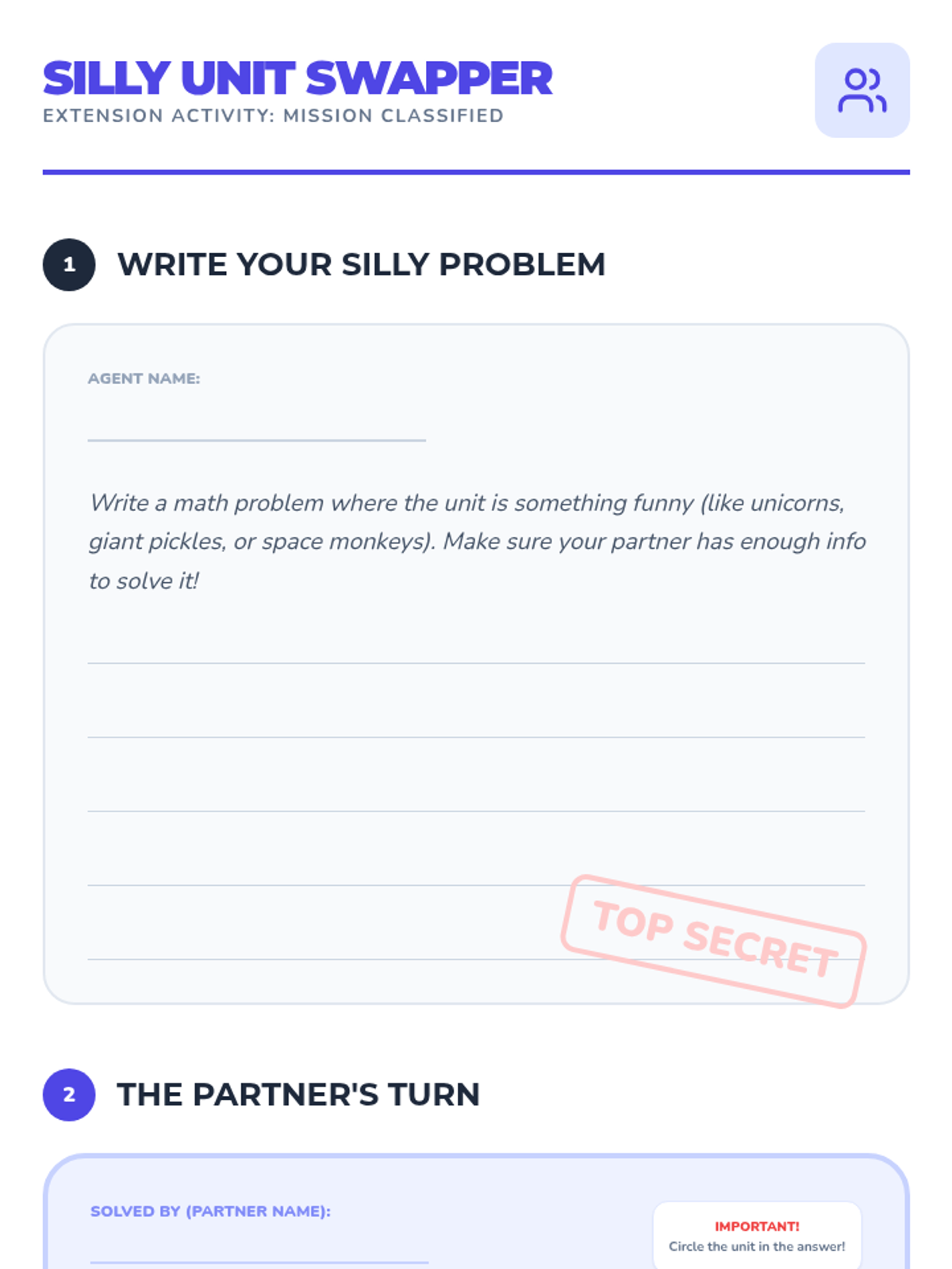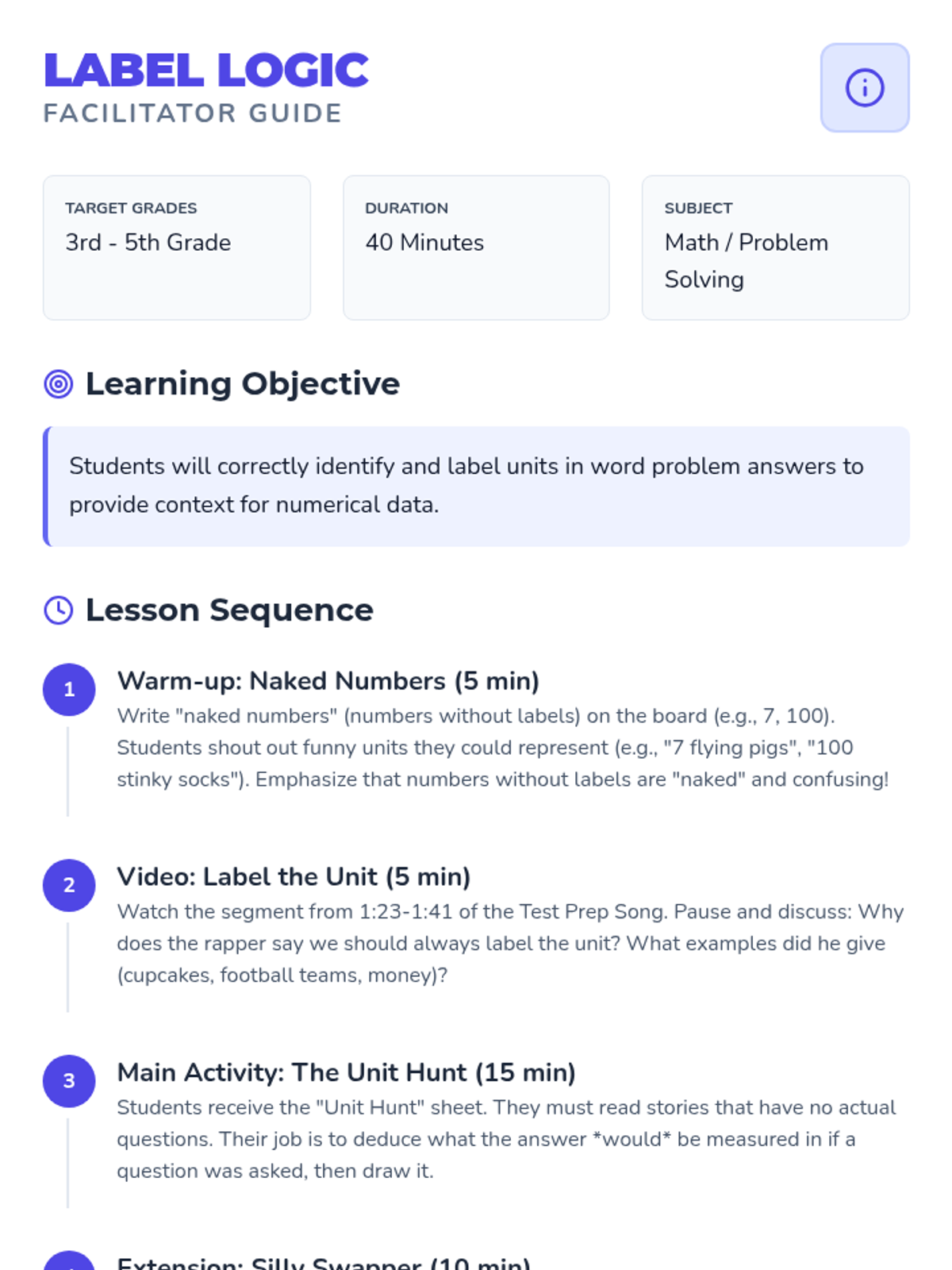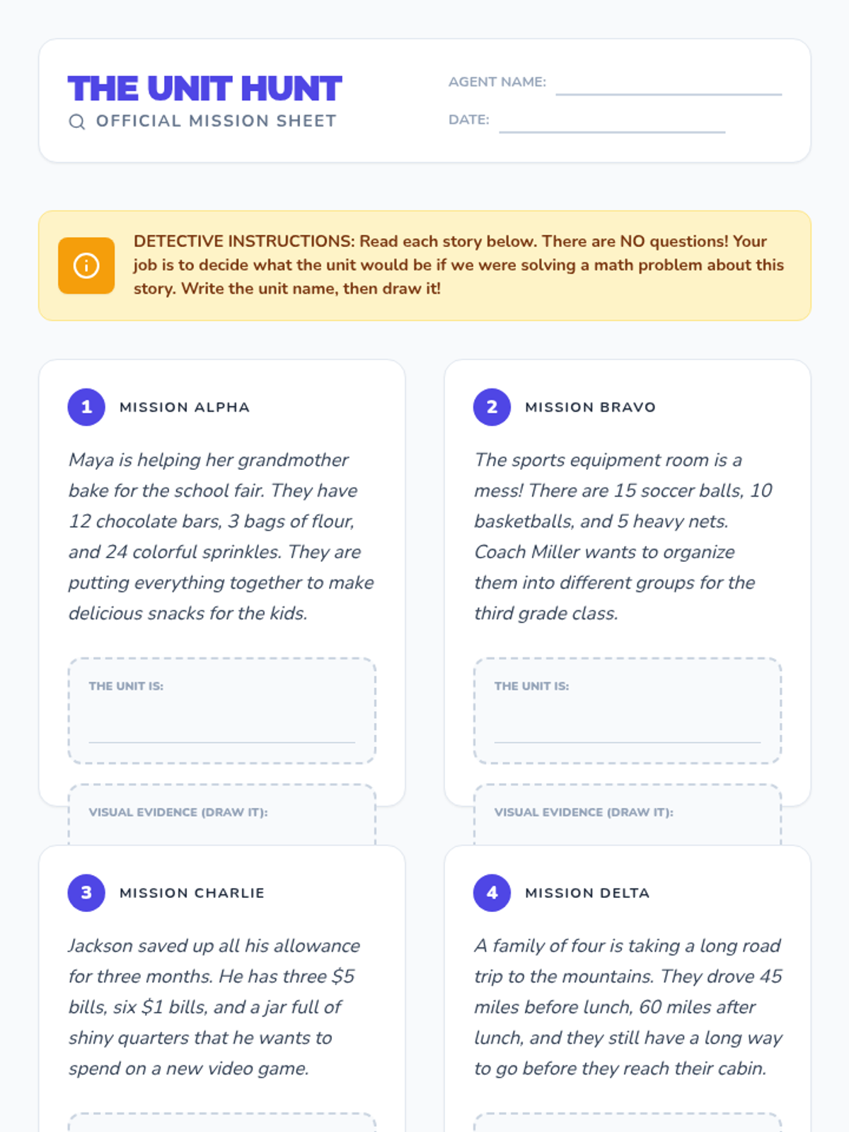 A math lesson for grades 3-5 focused on identifying and correctly labeling units in word problem answers using a detective-style theme. Students practice 'The Unit Hunt' by deducing units from stories without questions and creating visual representations of those units.