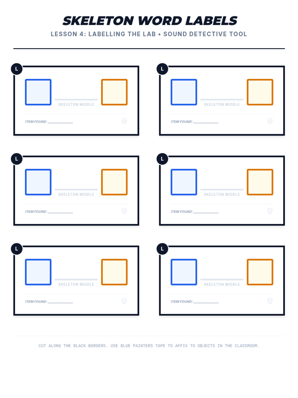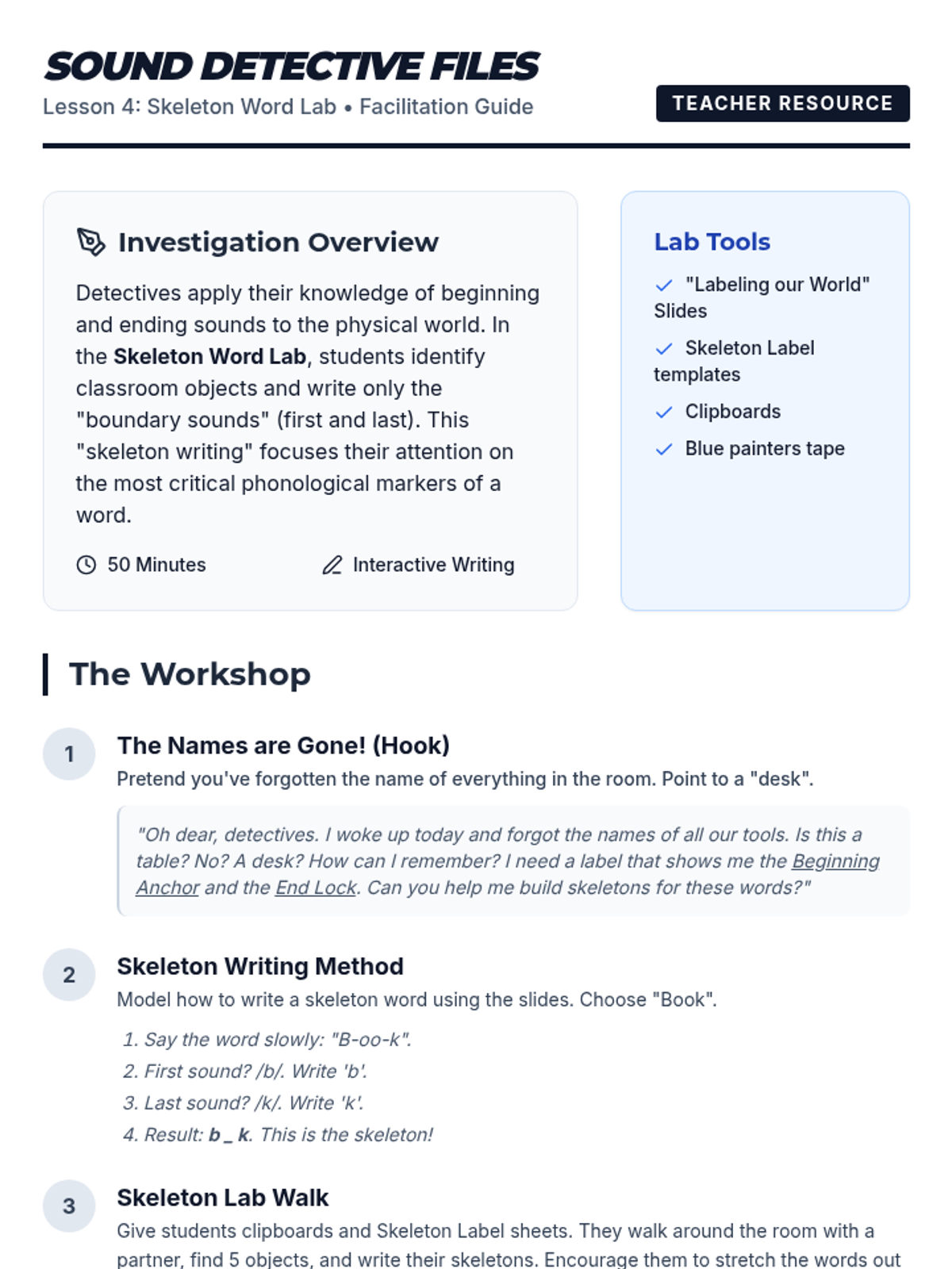 Students practice 'skeleton writing' by identifying and writing only the first and last sounds of classroom objects.