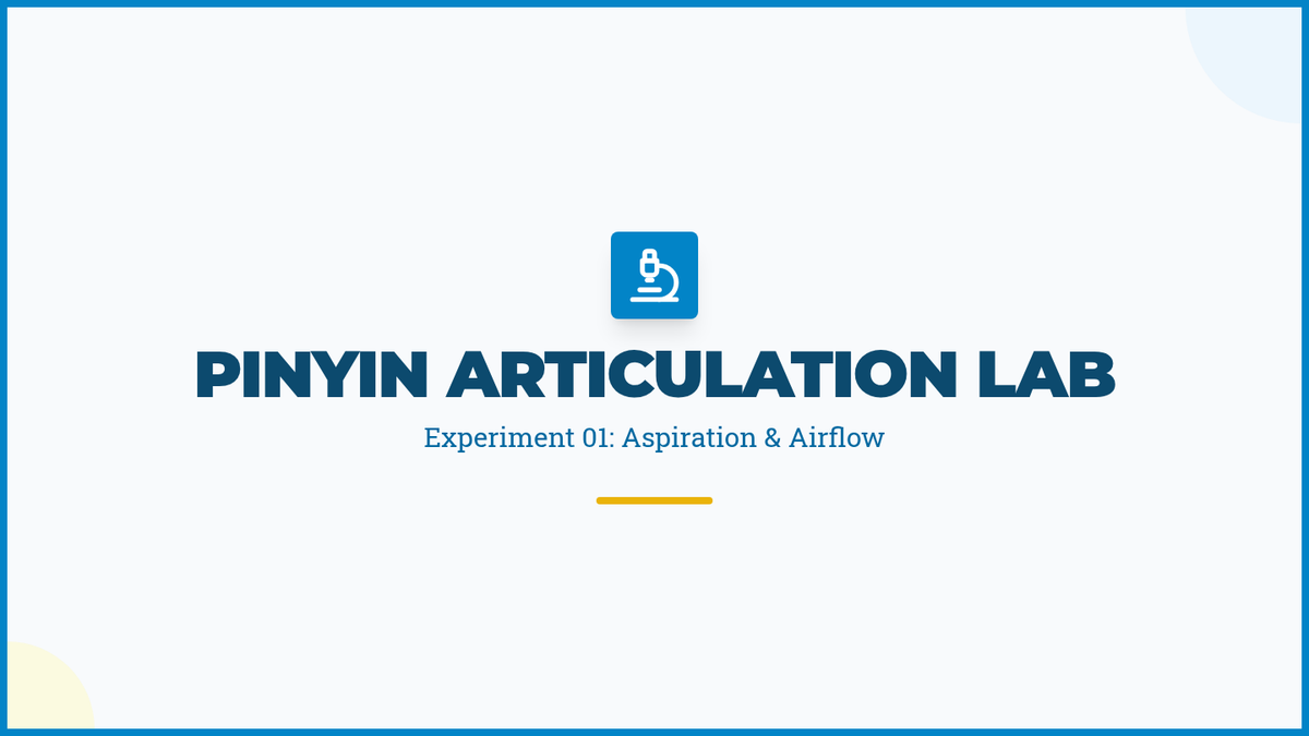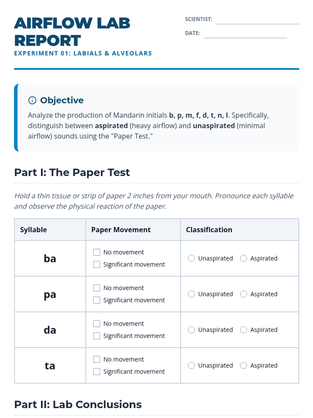 Introduces the most accessible Pinyin initials (b, p, m, f, d, t, n, l) through the lens of aspiration. Students use the 'Paper Test' to physically visualize the difference between aspirated and unaspirated sounds.