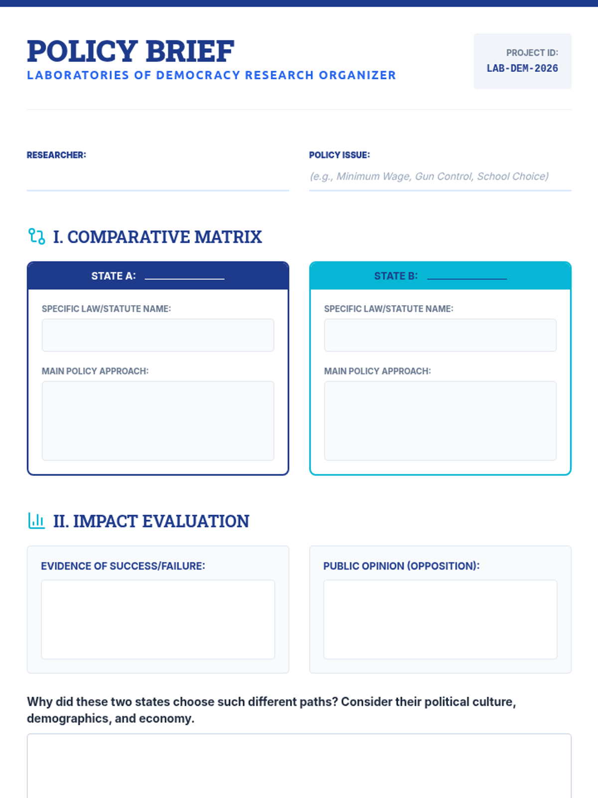 Investigate how states act as laboratories of democracy by implementing diverse policy solutions to shared national challenges.