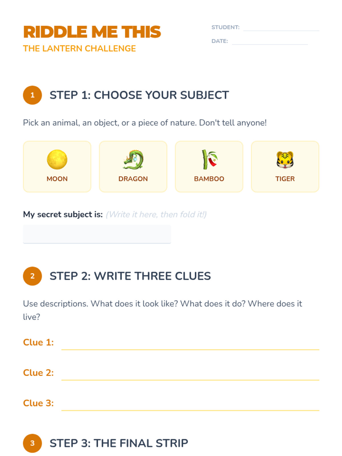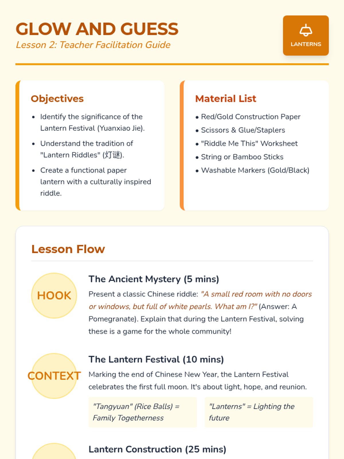 Focusing on the Lantern Festival, students construct paper lanterns and write riddles, connecting art with linguistic wordplay.