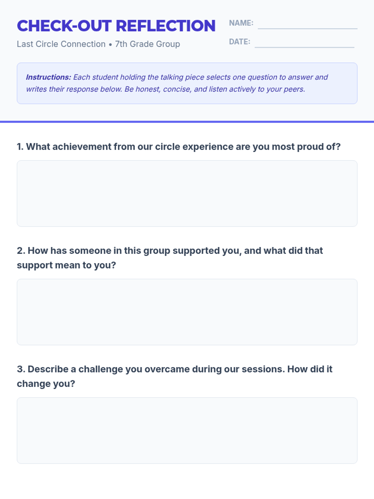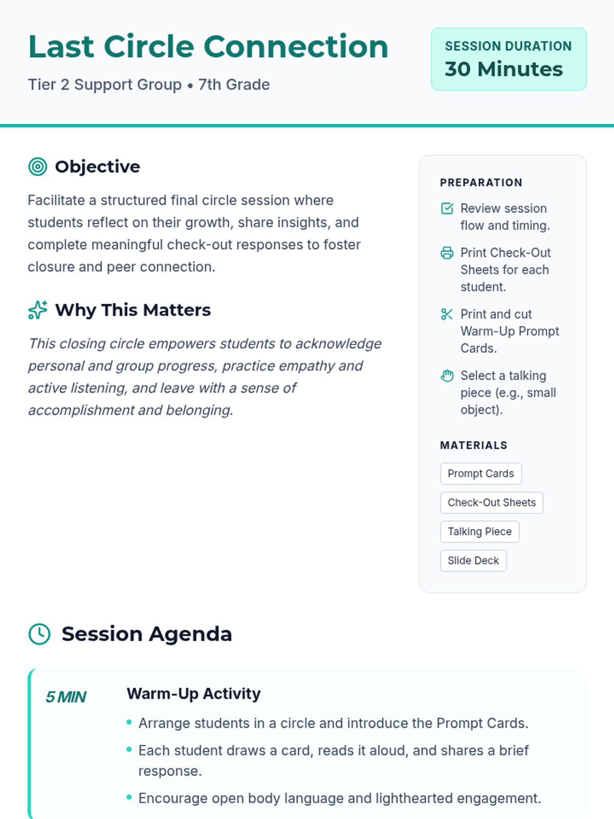 A 30-minute Tier 2 circle group session for 7th graders to reflect on their journey, strengthen bonds, and achieve closure through structured discussion and check-out activities.