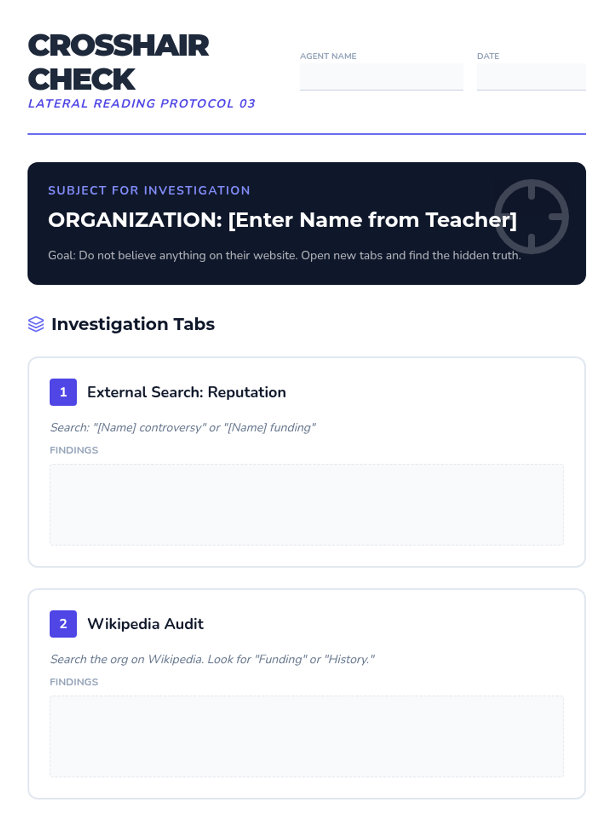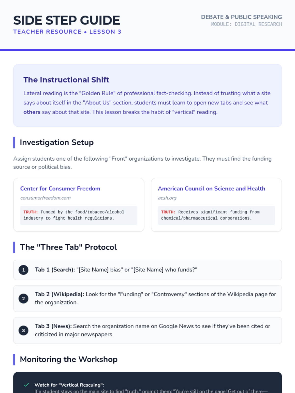 Introduces the professional fact-checking technique of lateral reading. Students learn to leave a webpage to verify its claims, author, and funding through outside sources, moving beyond surface-level evaluation.