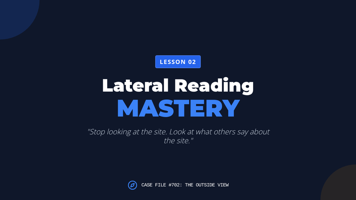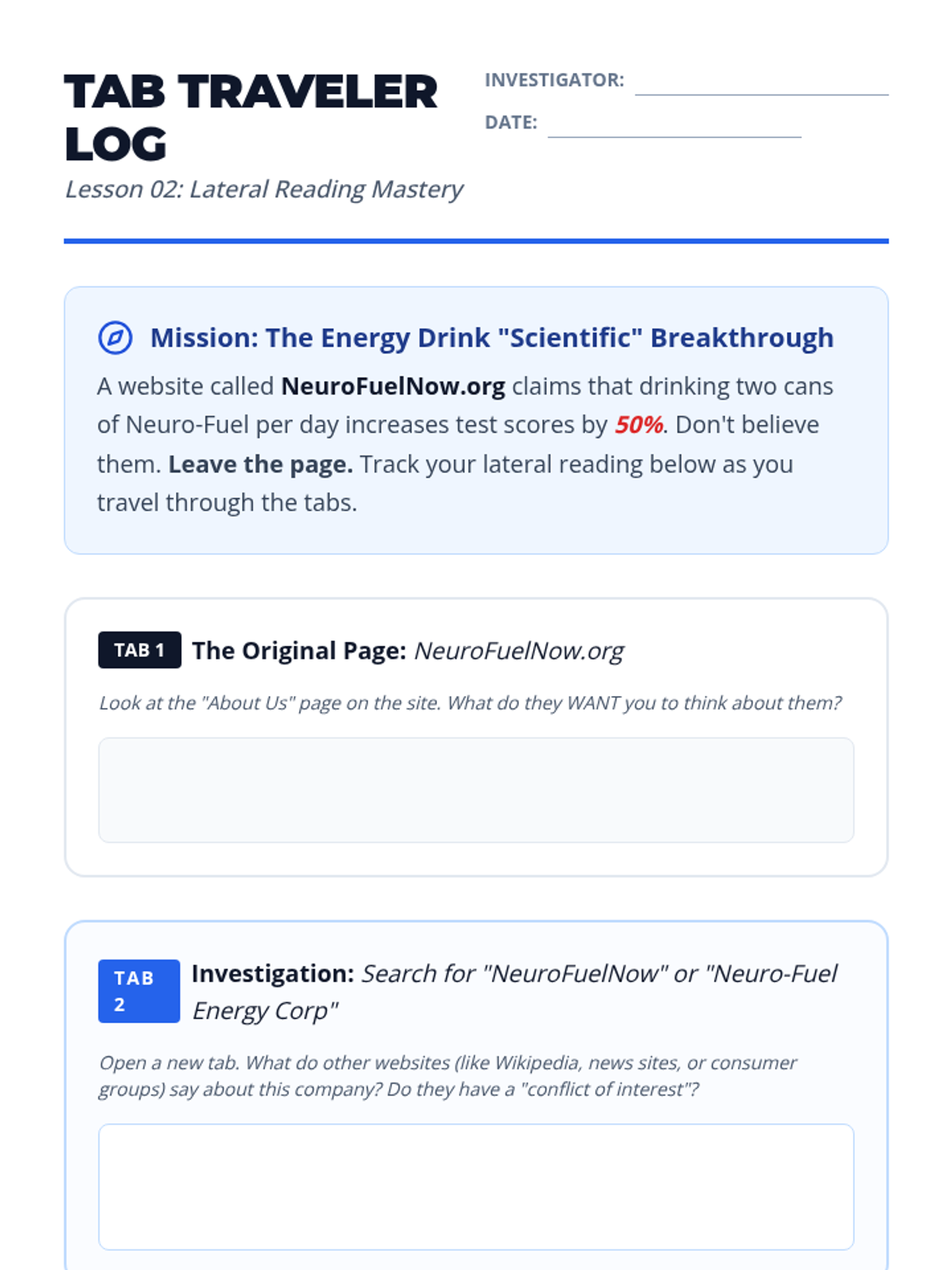 Students learn the strategy of 'leaving the page' to verify information through lateral reading, investigating the organization behind a website rather than its 'About Us' page.