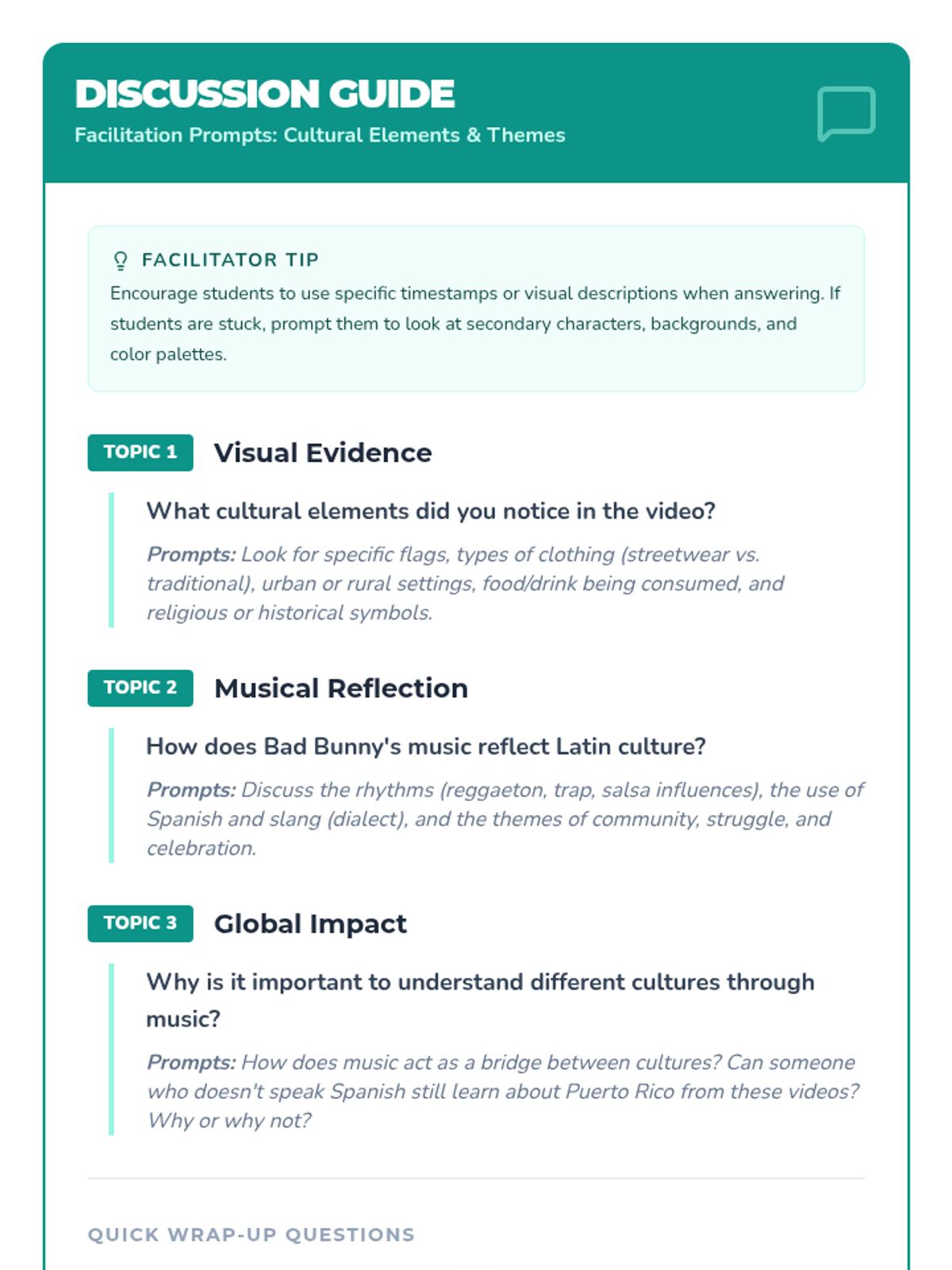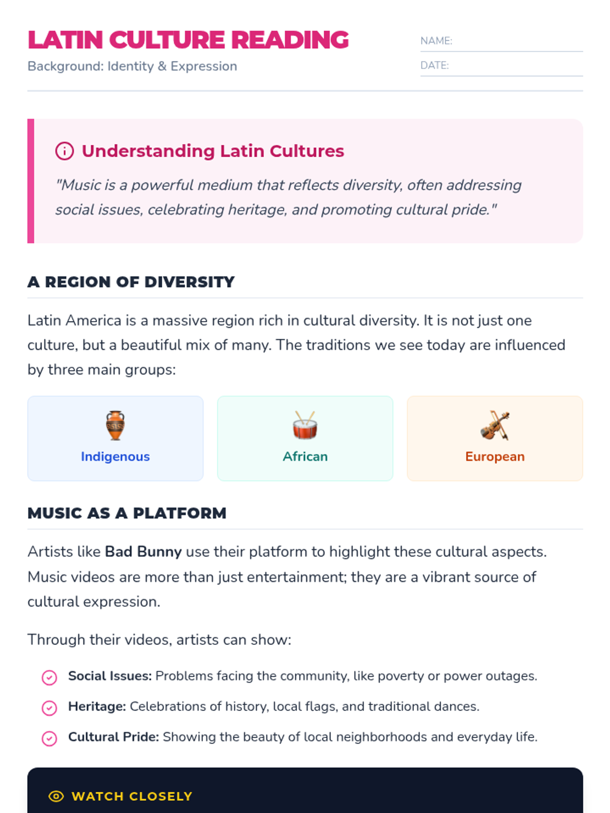 A culturally responsive lesson using Bad Bunny's music videos to explore Latin cultural diversity, expression, and heritage for multilanguage learners.