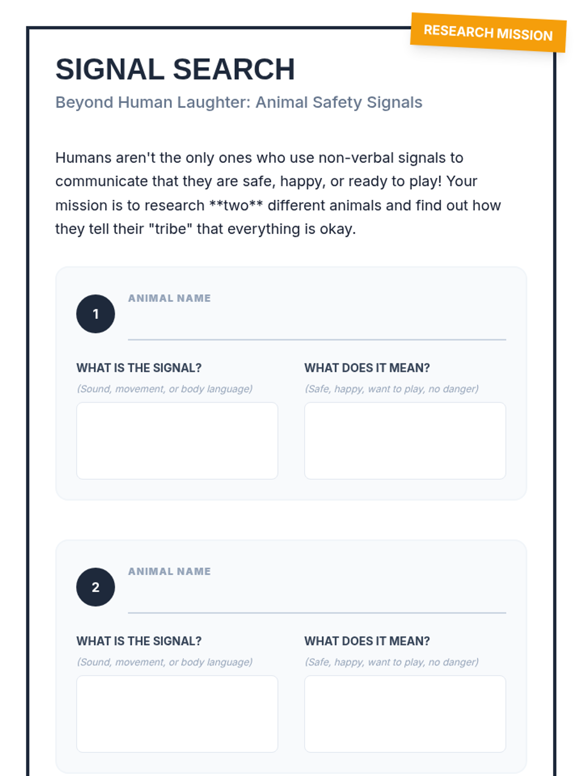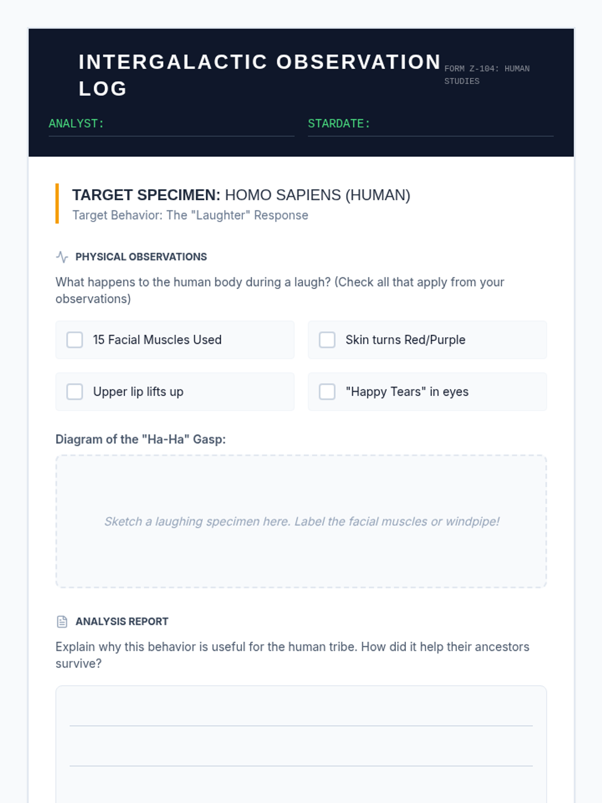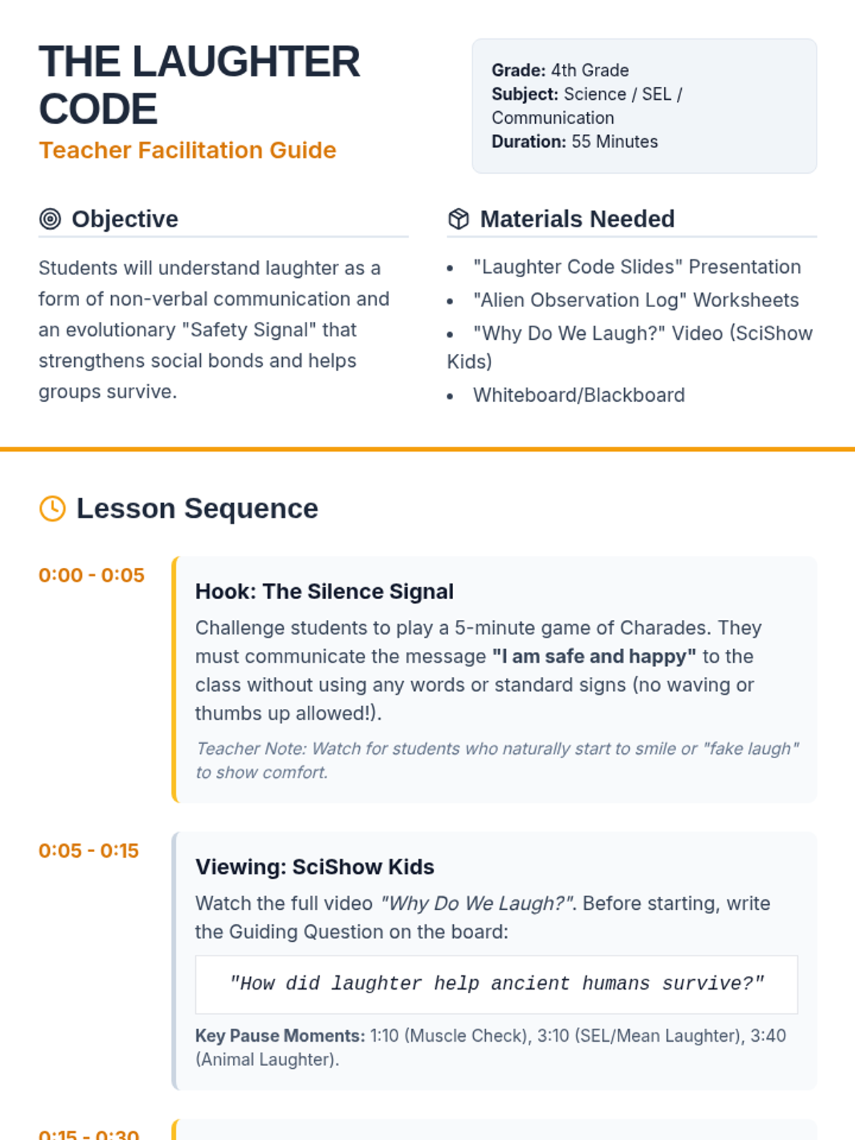 A 4th-grade science and social-emotional learning lesson that explores the evolutionary roots of laughter as a non-verbal safety signal and a tool for group bonding. Students act as 'Alien Anthropologists' to analyze human behavior after watching a SciShow Kids video on the biology and social context of laughter.