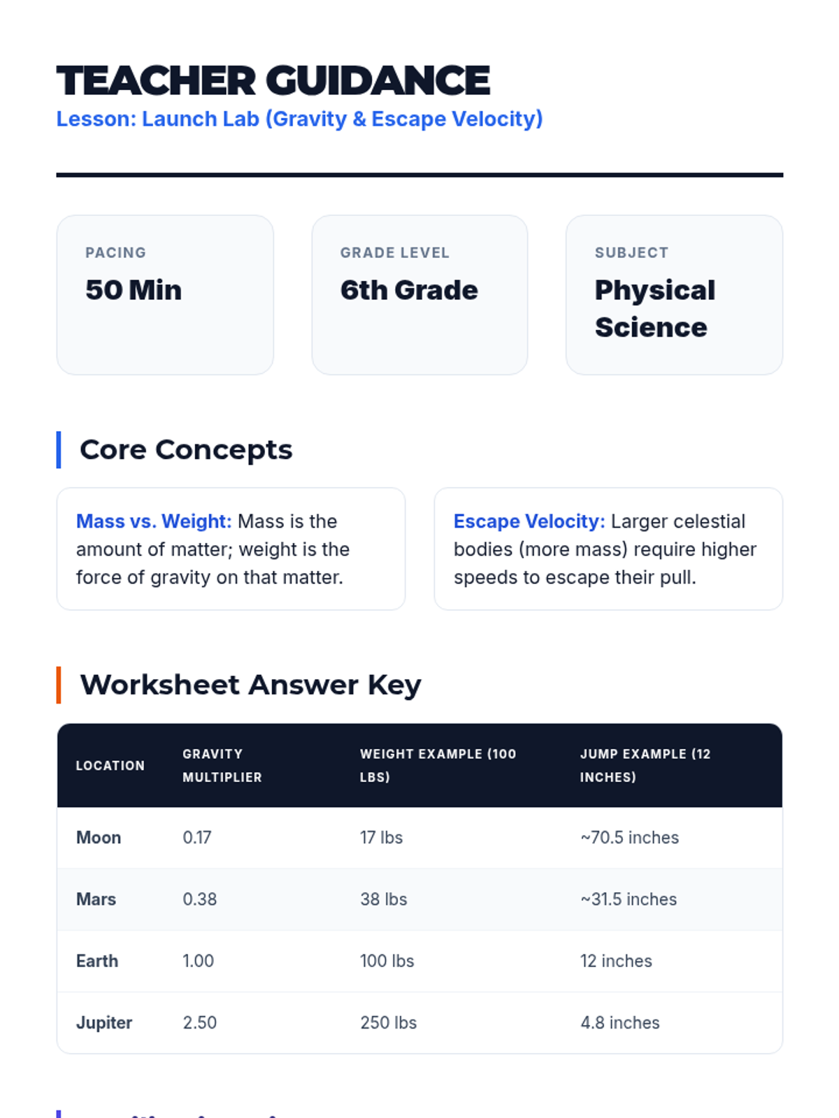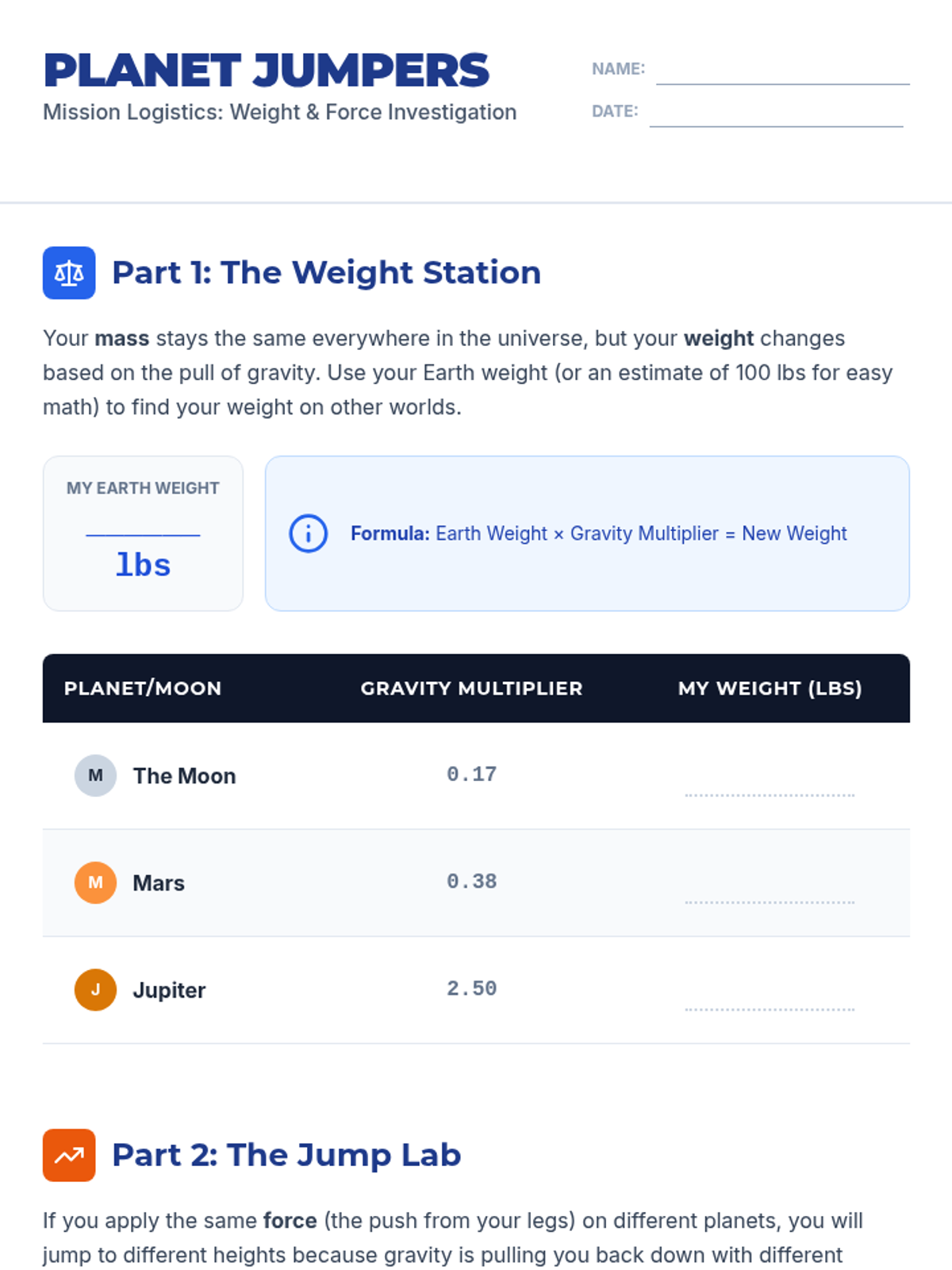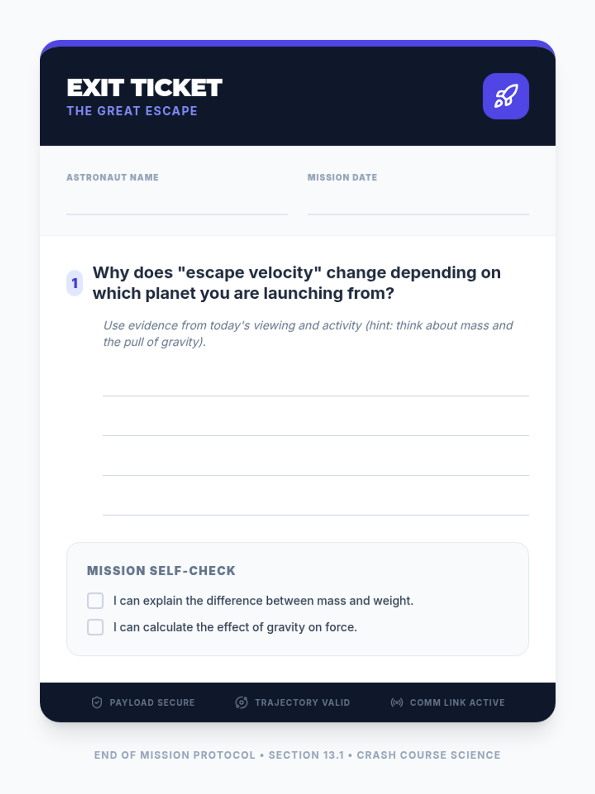 Students explore the relationship between mass, gravity, and force by calculating their weight and jump height on different celestial bodies, supported by a Crash Course Kids investigation into escape velocity.