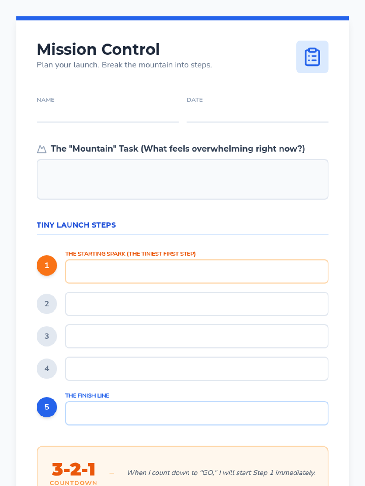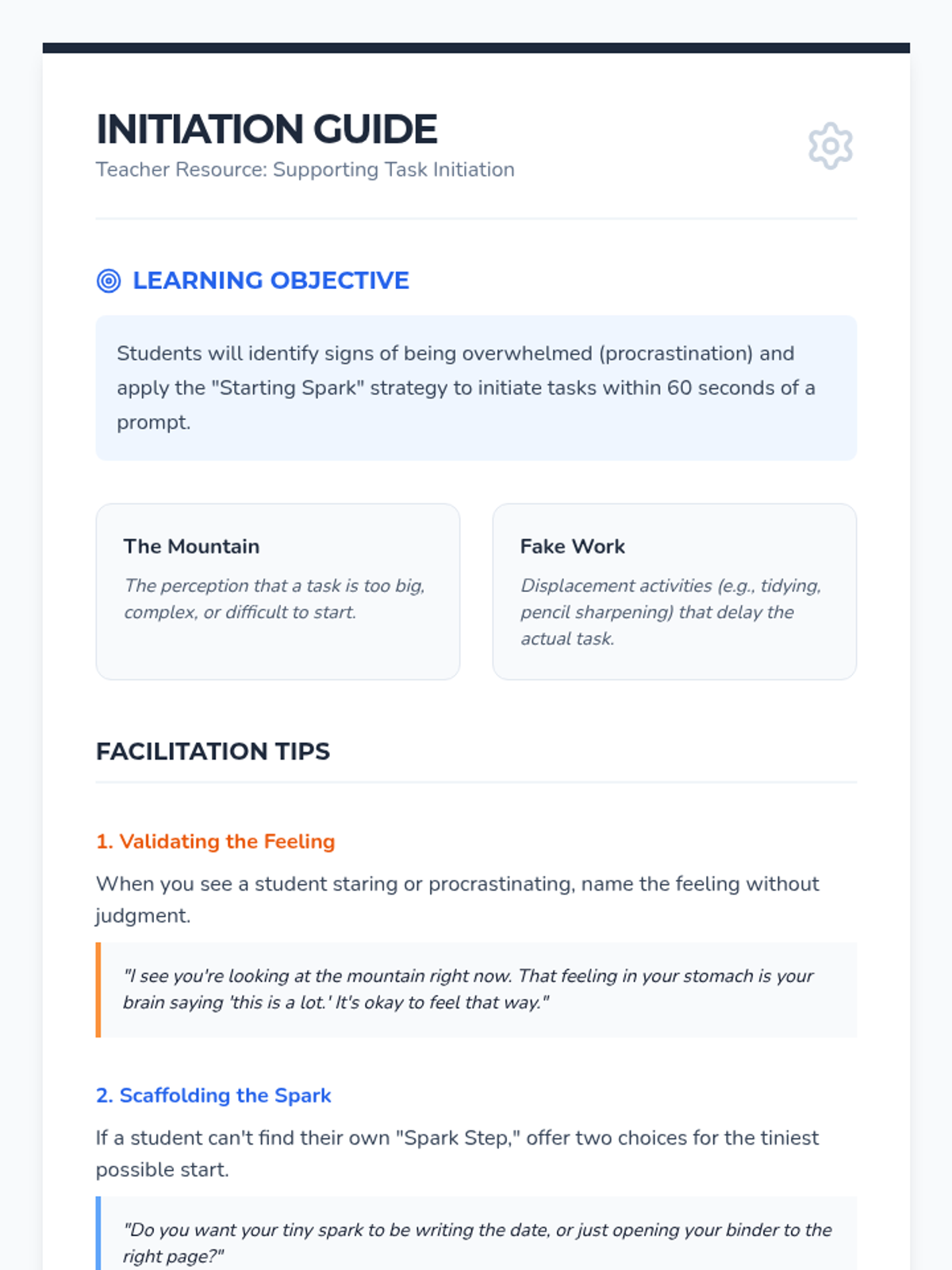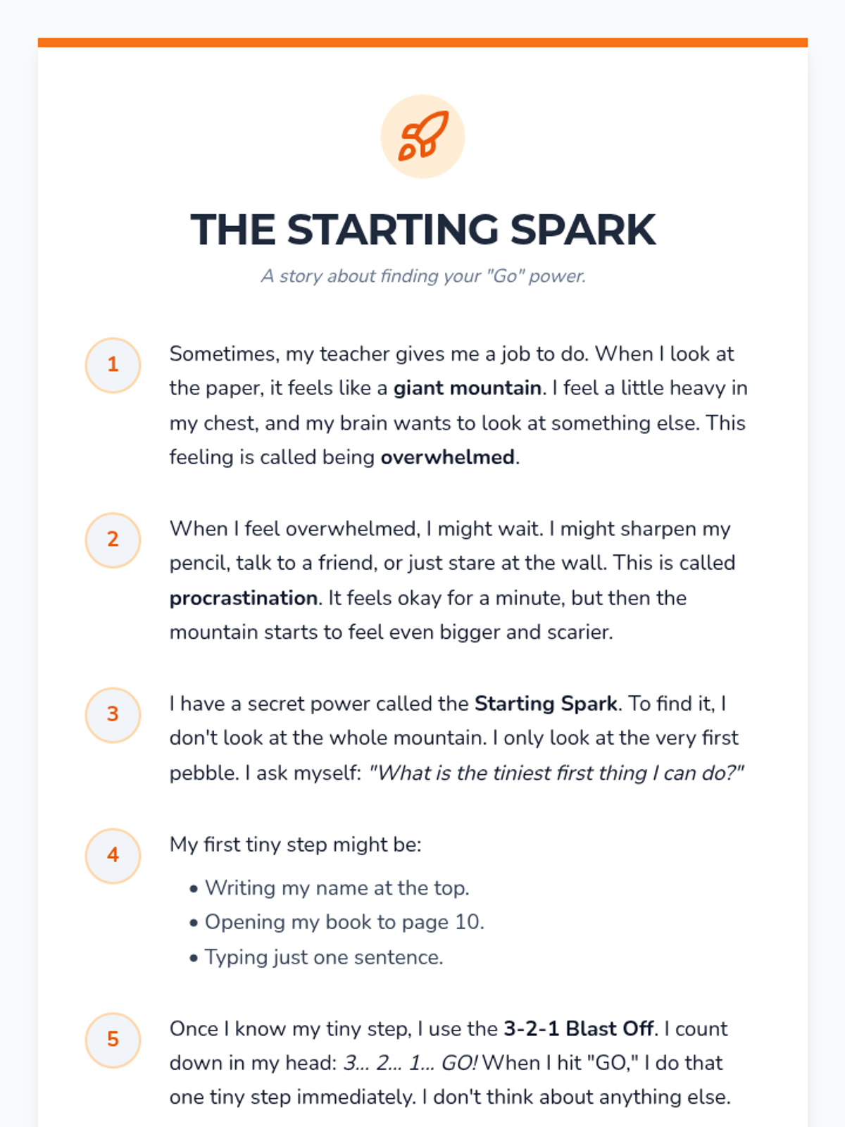 This lesson helps students overcome procrastination and the feeling of being overwhelmed by teaching specific strategies for task initiation. Students will learn how to break large tasks into 'micro-steps' and use a social story to internalize the 'Starting Spark' mindset.