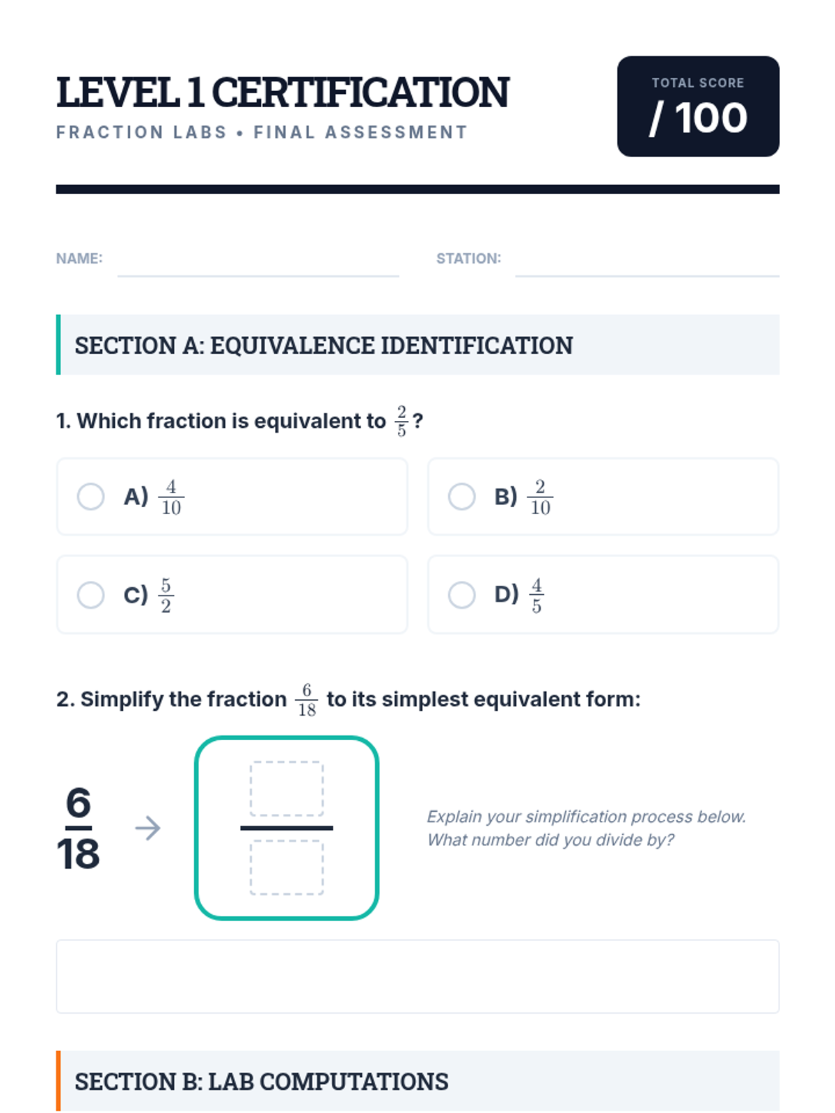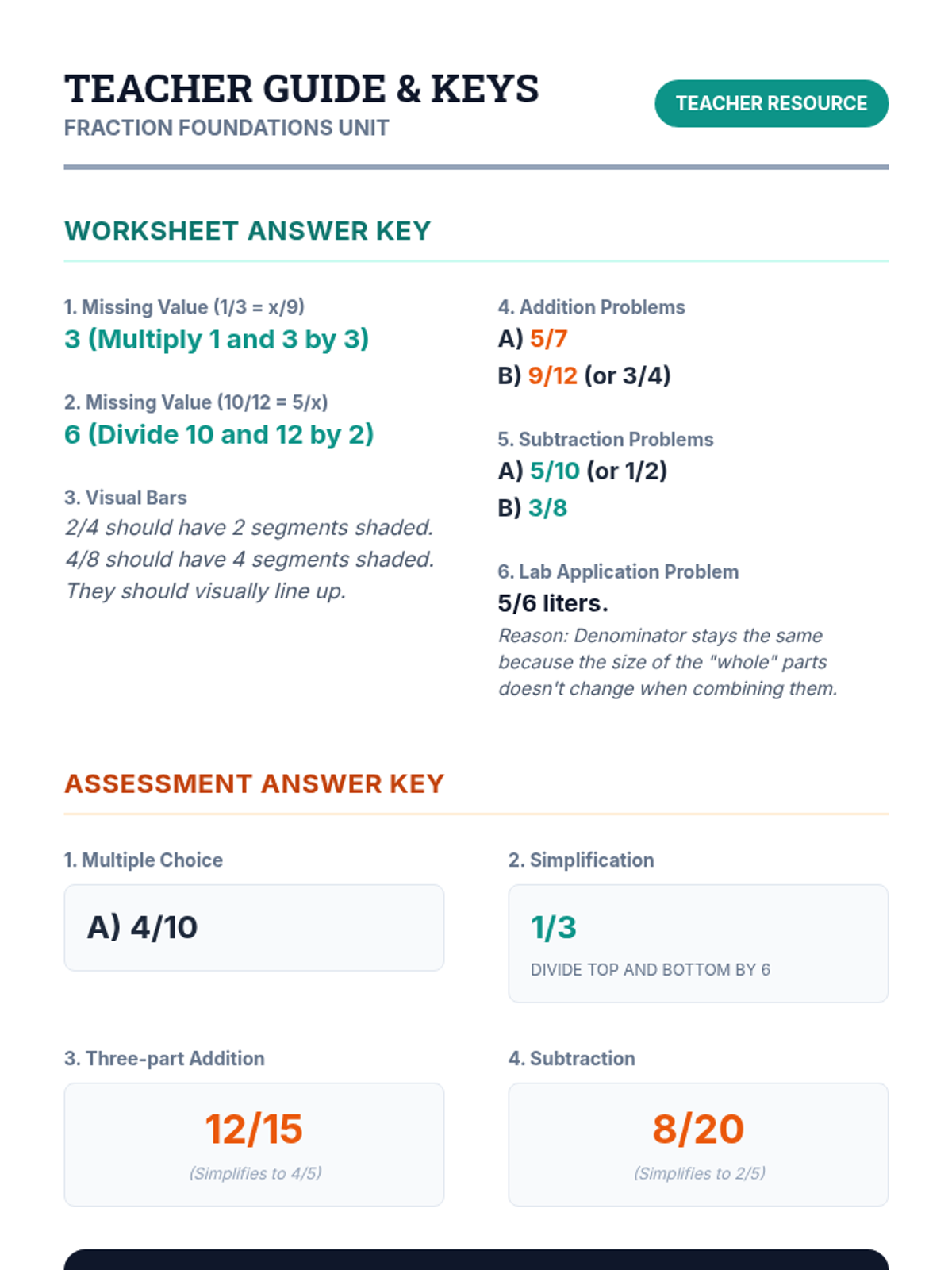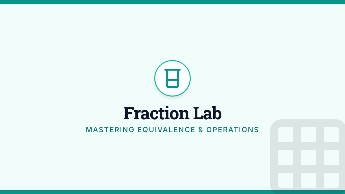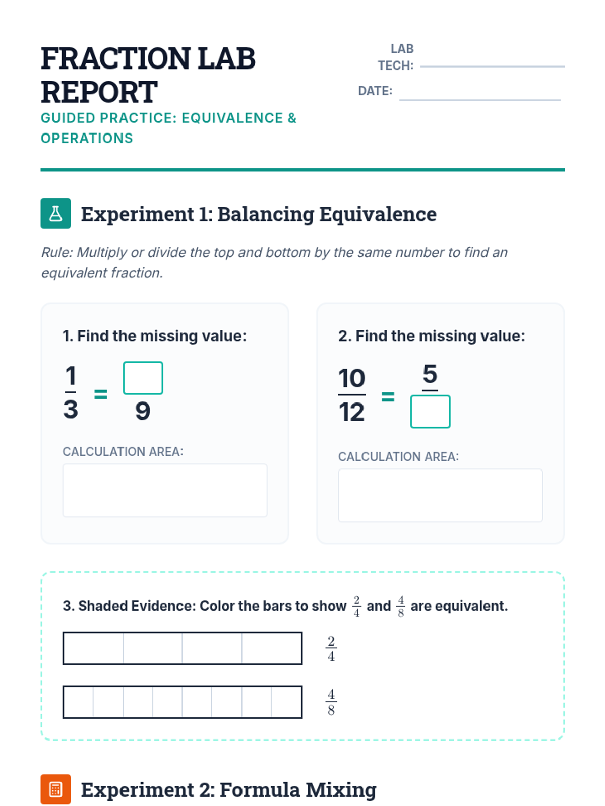 A comprehensive lesson on equivalent fractions and adding/subtracting fractions with like denominators, featuring a science lab theme.