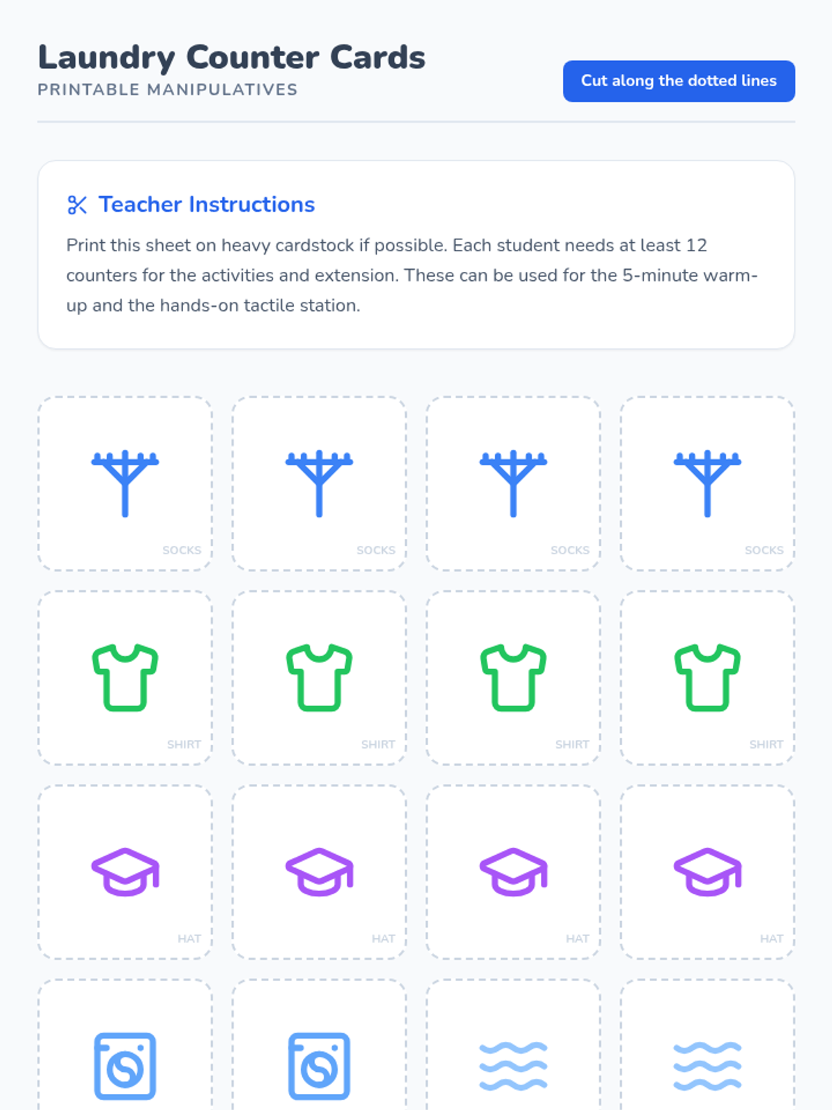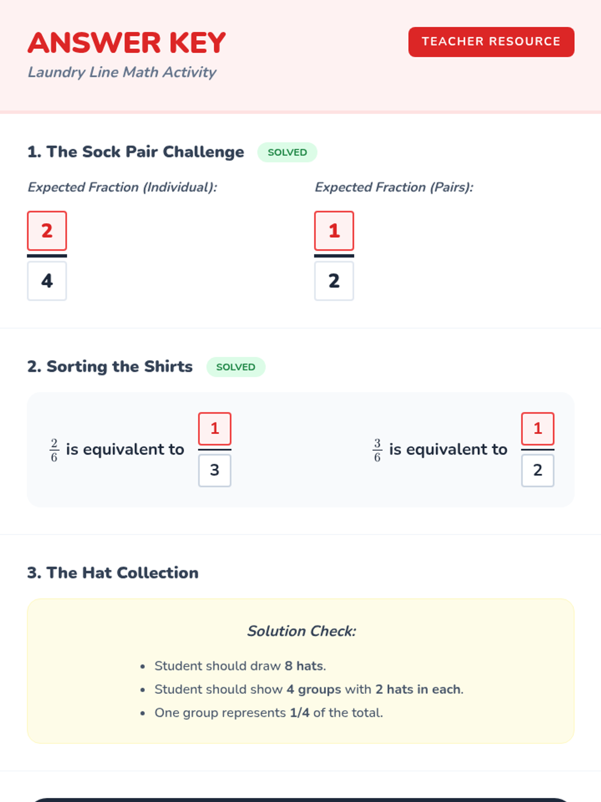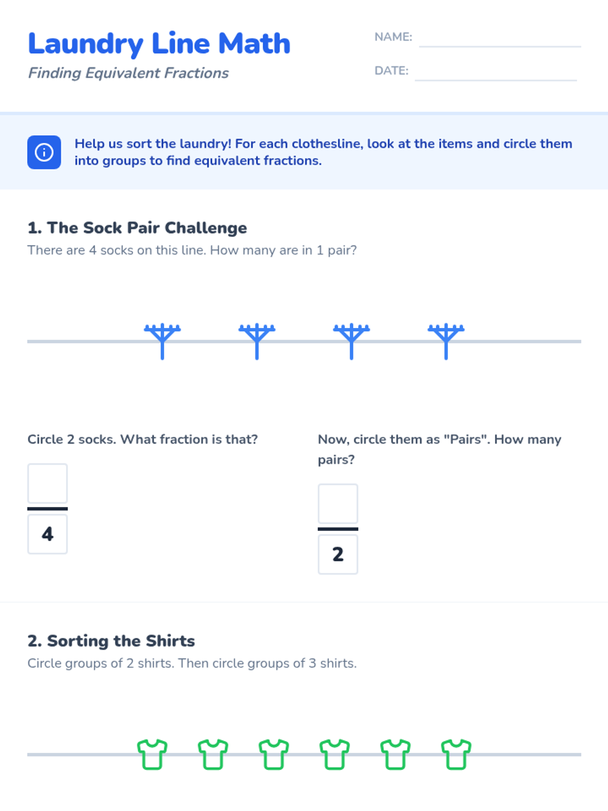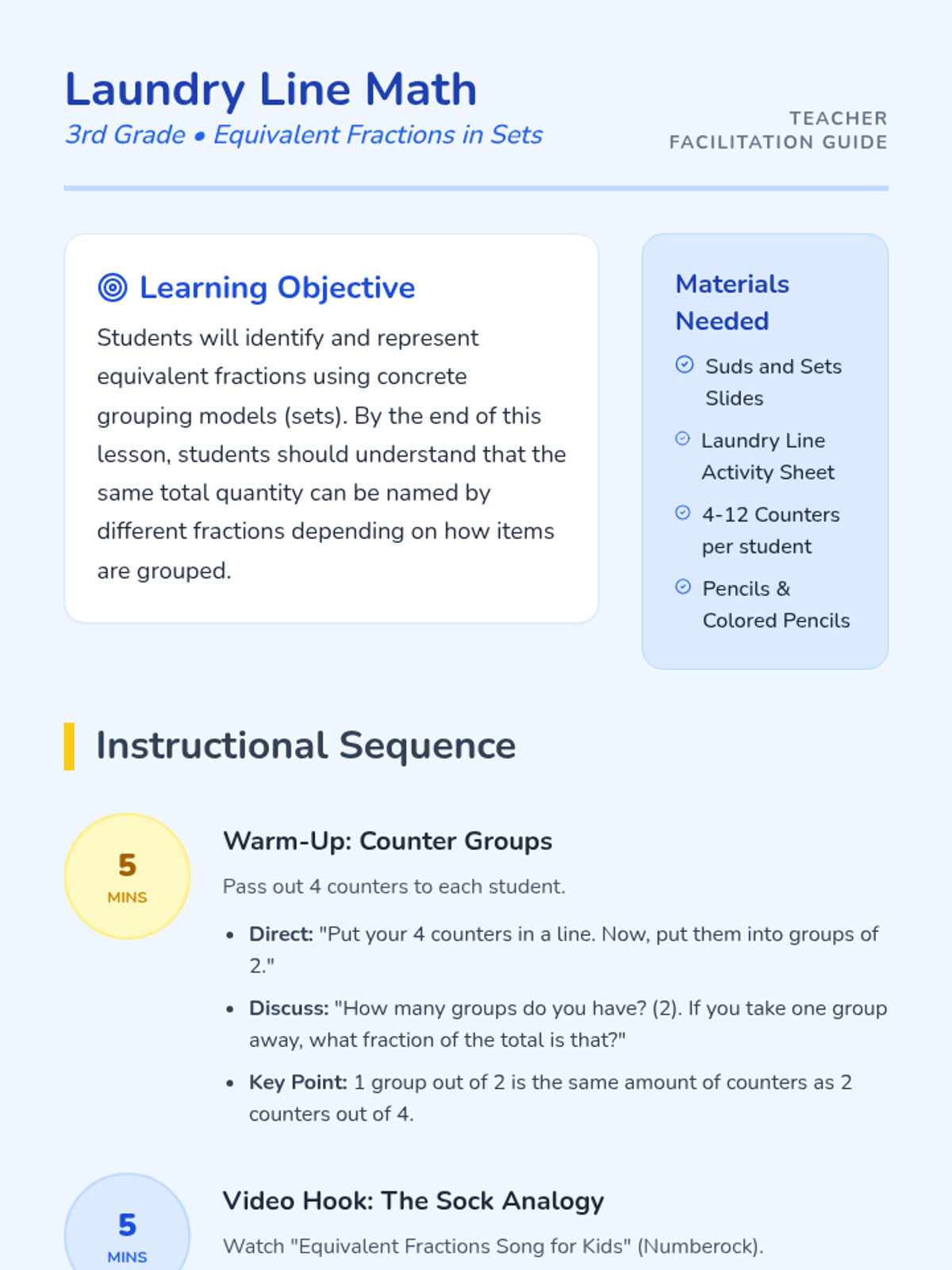 Students explore equivalent fractions through a laundry-themed lesson using sets and grouping models. They will watch a catchy song, use counters to model fractions, and draw their own laundry lines to represent equivalent values.