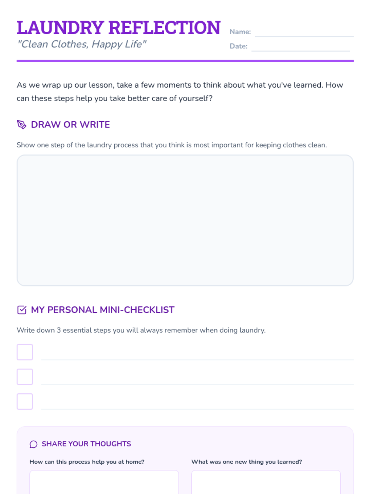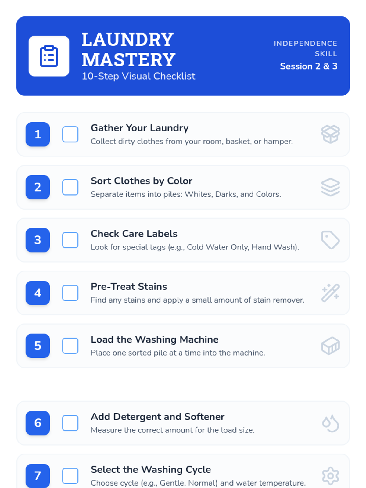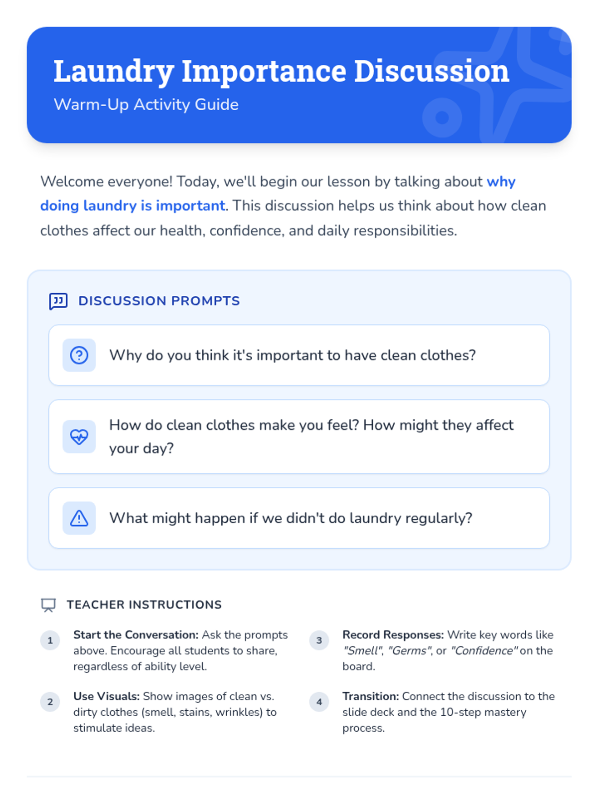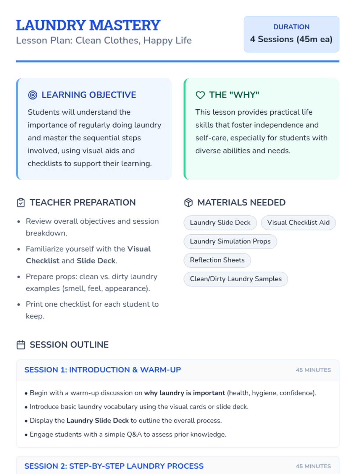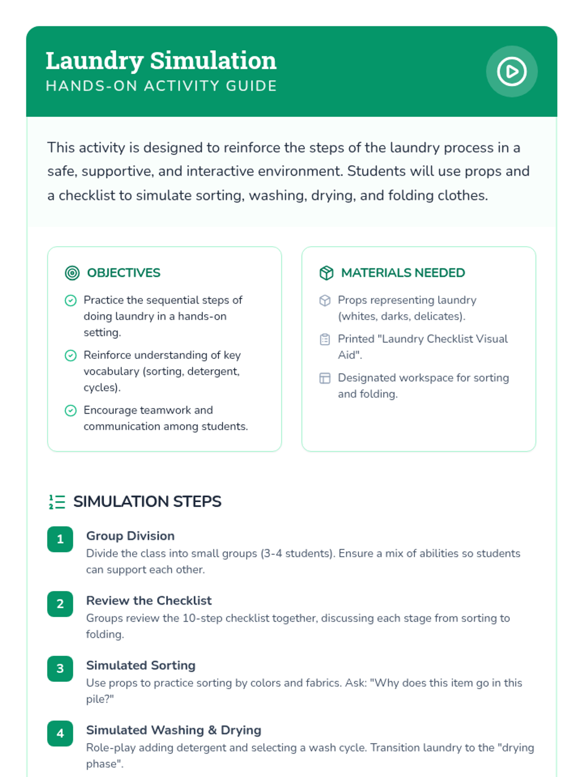 This lesson covers the importance of laundry, key vocabulary, and a detailed 10-step process for washing, drying, and folding clothes. It includes a slide deck, a hands-on simulation activity, and a visual checklist for student use.