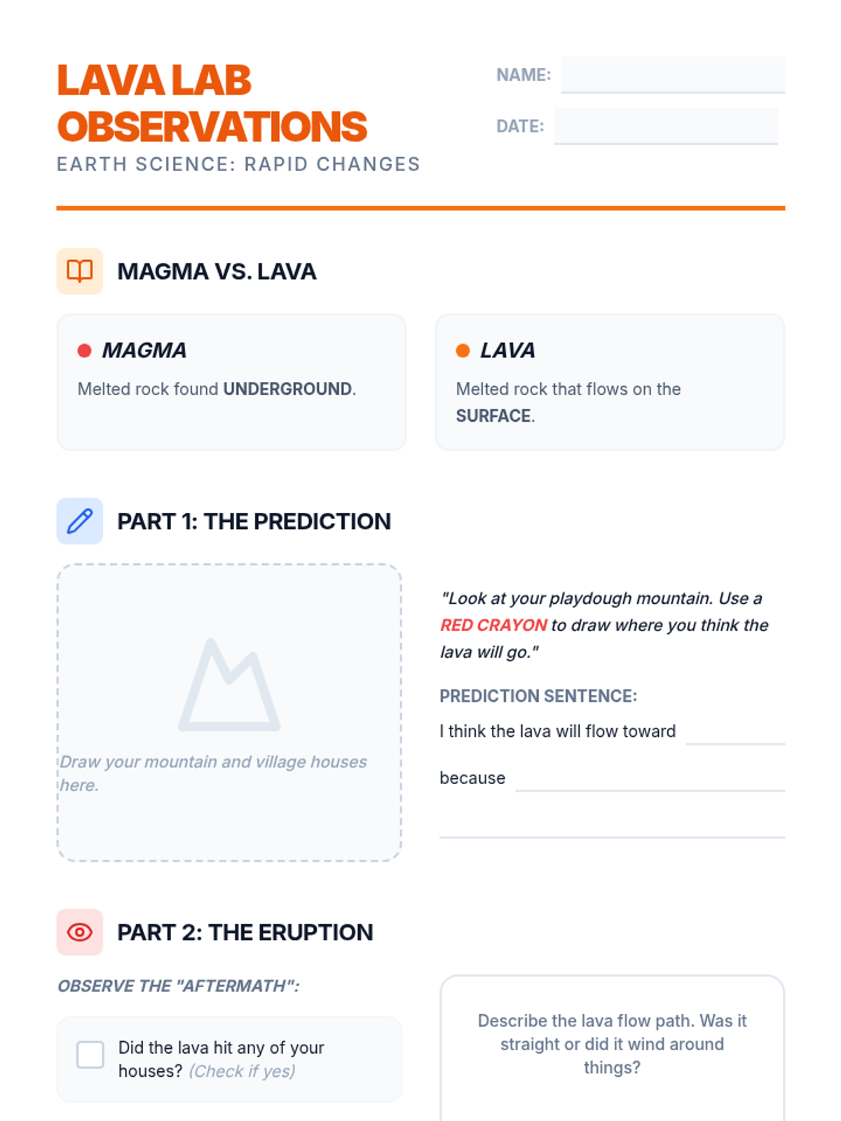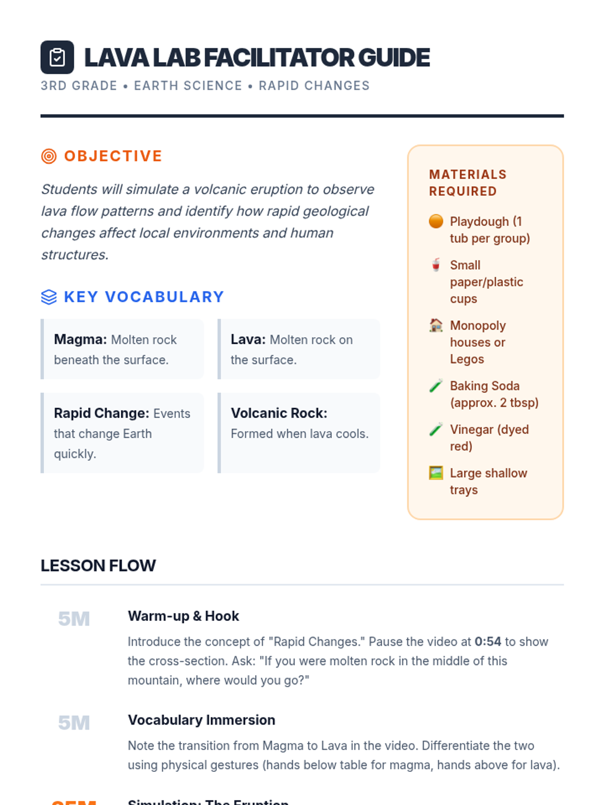 A hands-on science lesson where 3rd-grade students simulate volcanic eruptions using playdough models to observe lava flow patterns and their impact on surrounding environments. Students use a video diagram to distinguish between magma and lava before testing their predictions with a physical simulation.