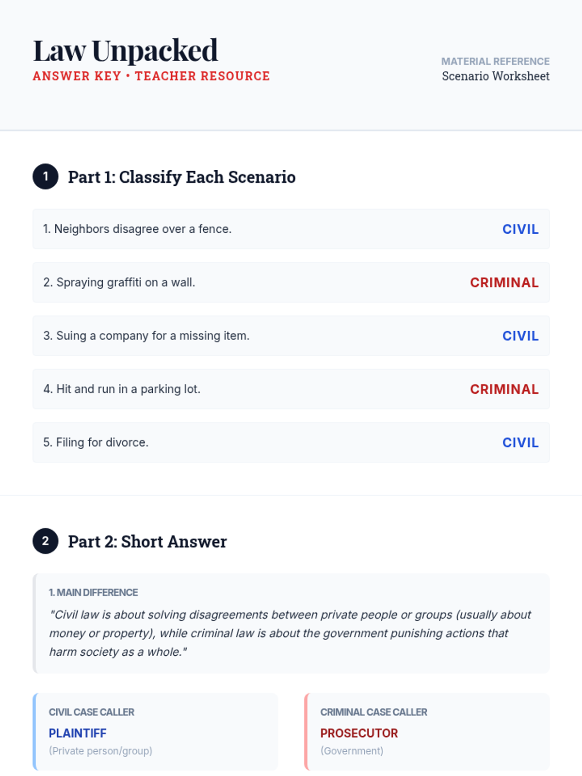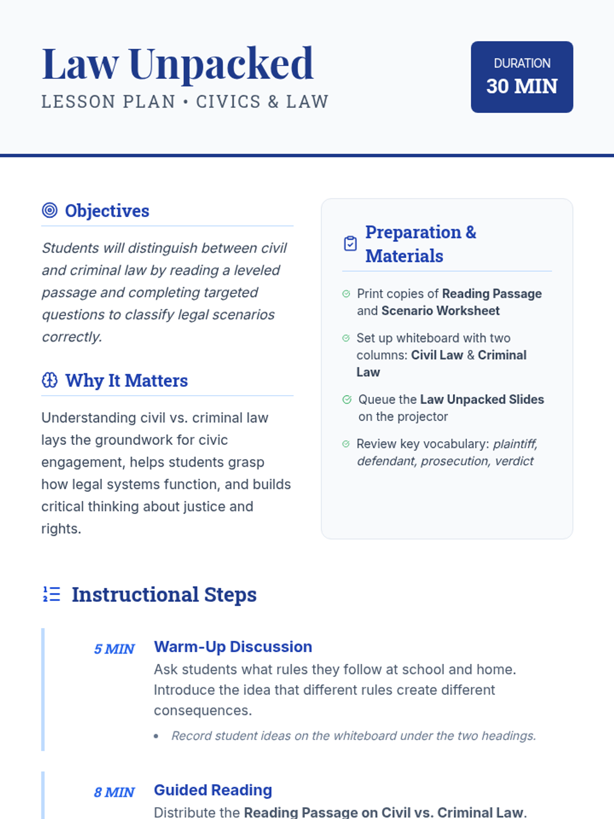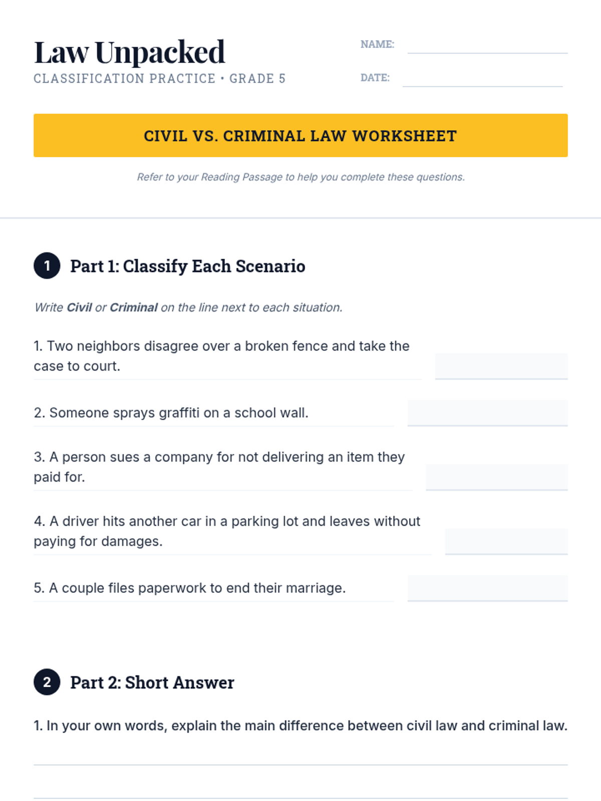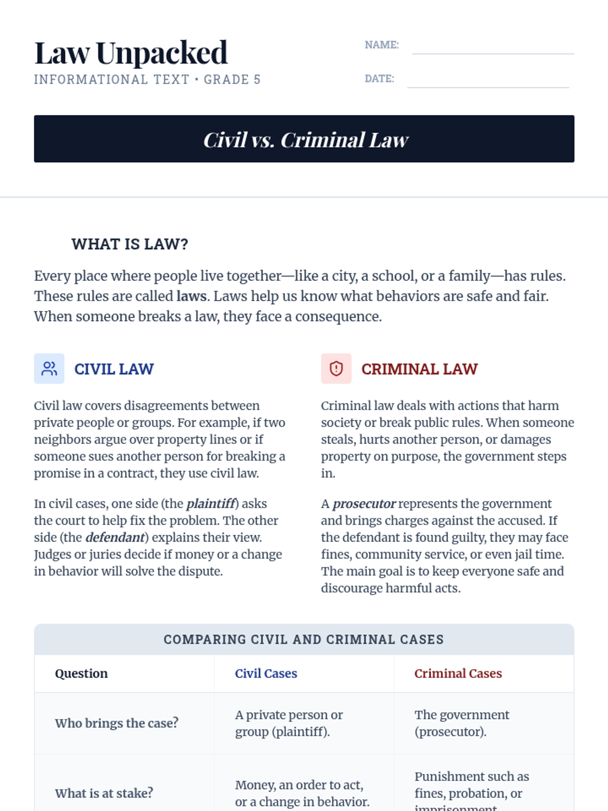 An introductory civics lesson for 5th grade students to distinguish between civil and criminal law through leveled reading, guided discussion, and scenario classification.