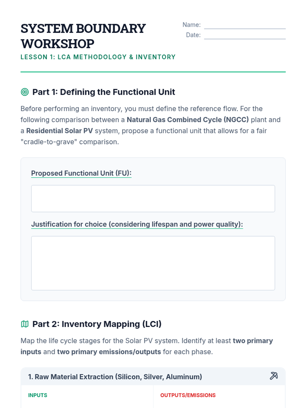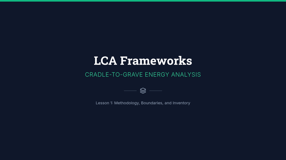 Introduction to the ISO 14040 framework for Life Cycle Assessment, focusing on system boundaries, functional units, and cradle-to-grave inventory analysis comparing fossil and renewable sources.