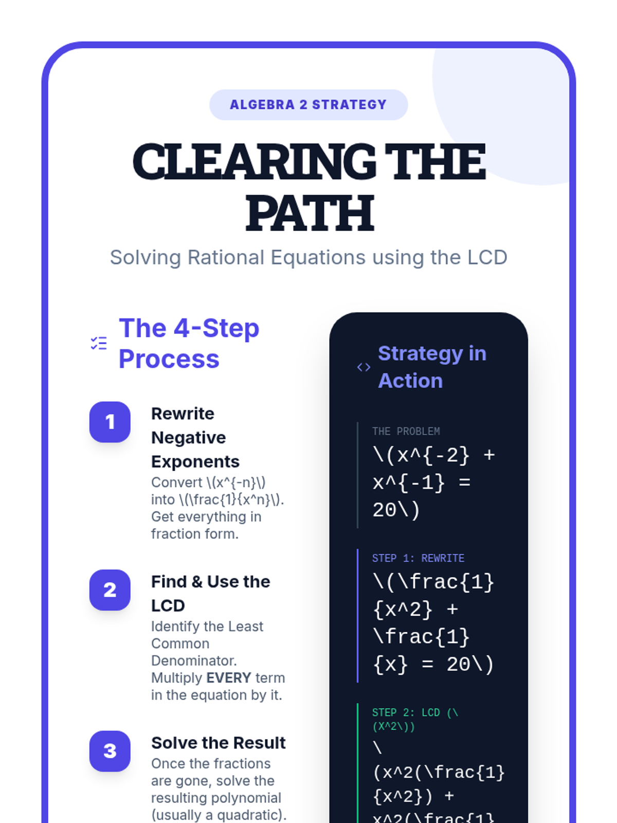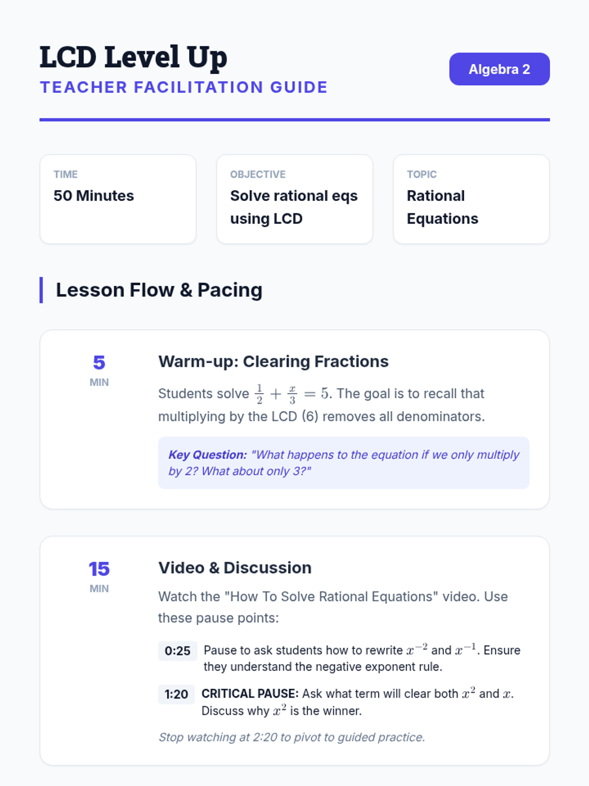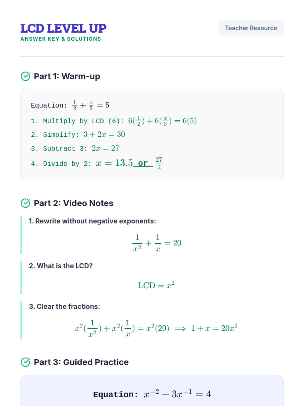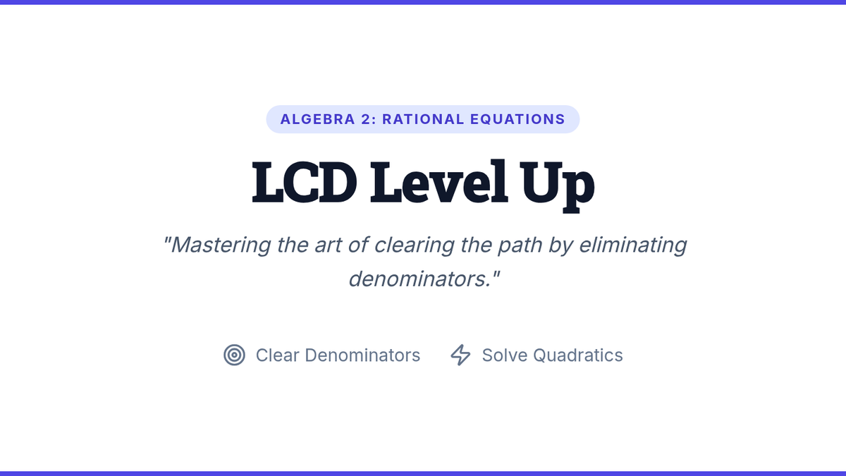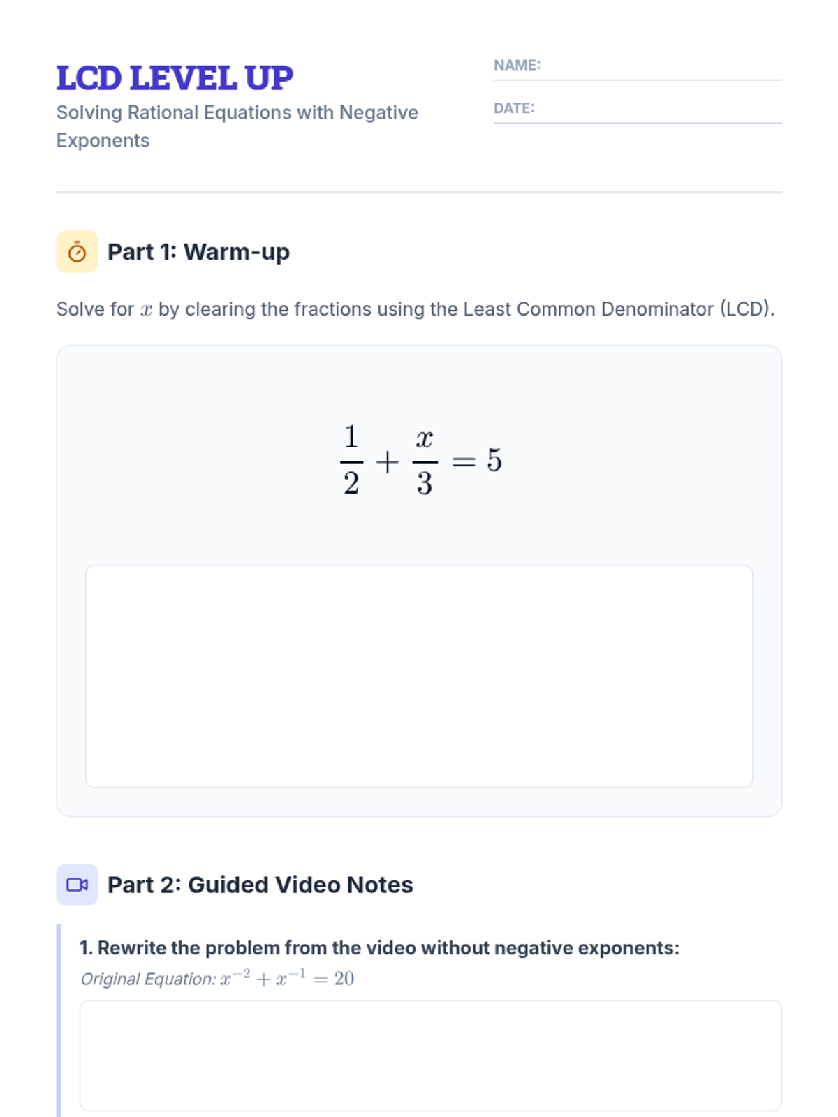A high-school Algebra 2 lesson focused on solving rational equations by converting negative exponents and clearing denominators using the Least Common Denominator (LCD). Students watch a guided video and practice step-by-step algebraic manipulation.