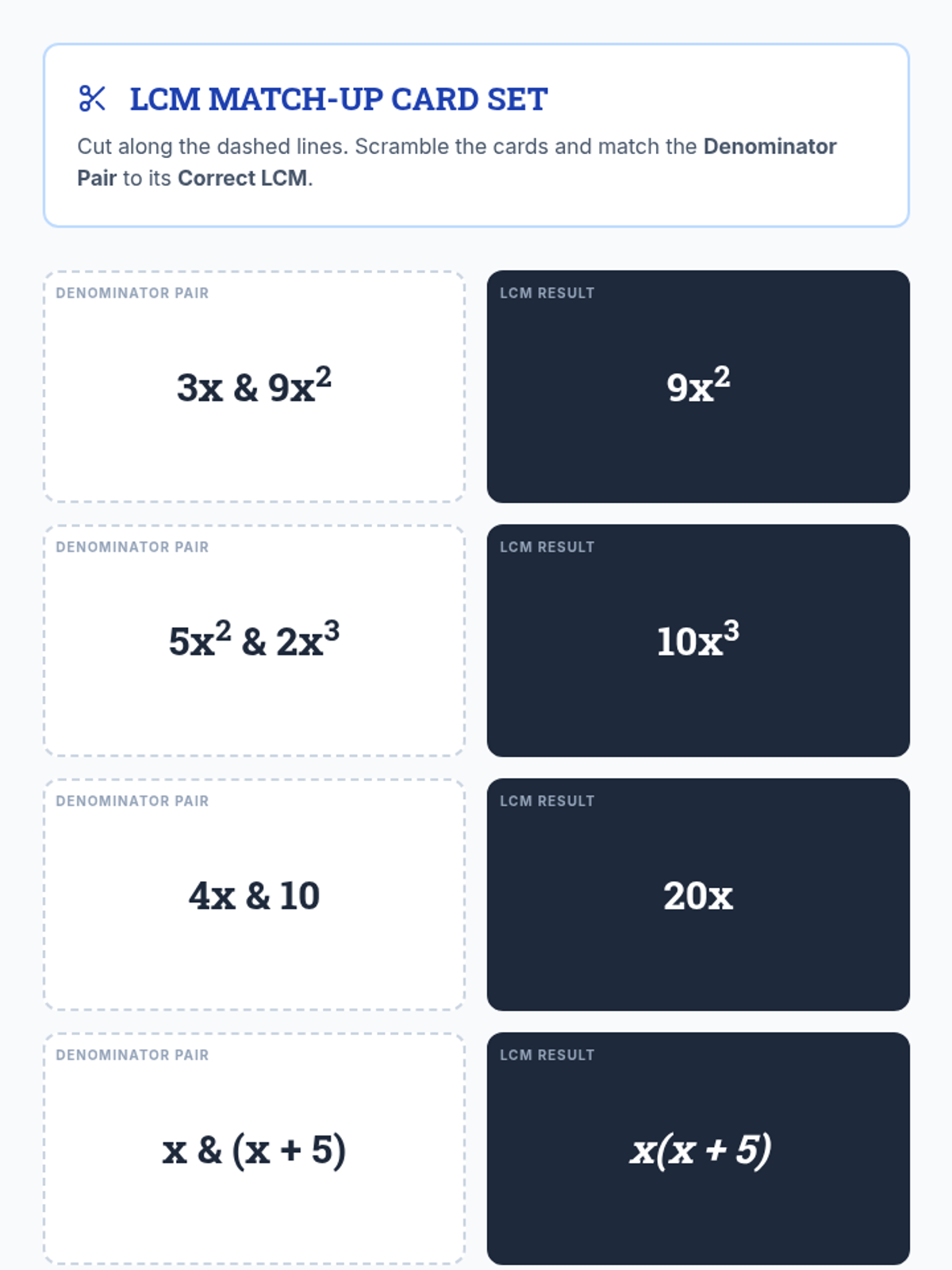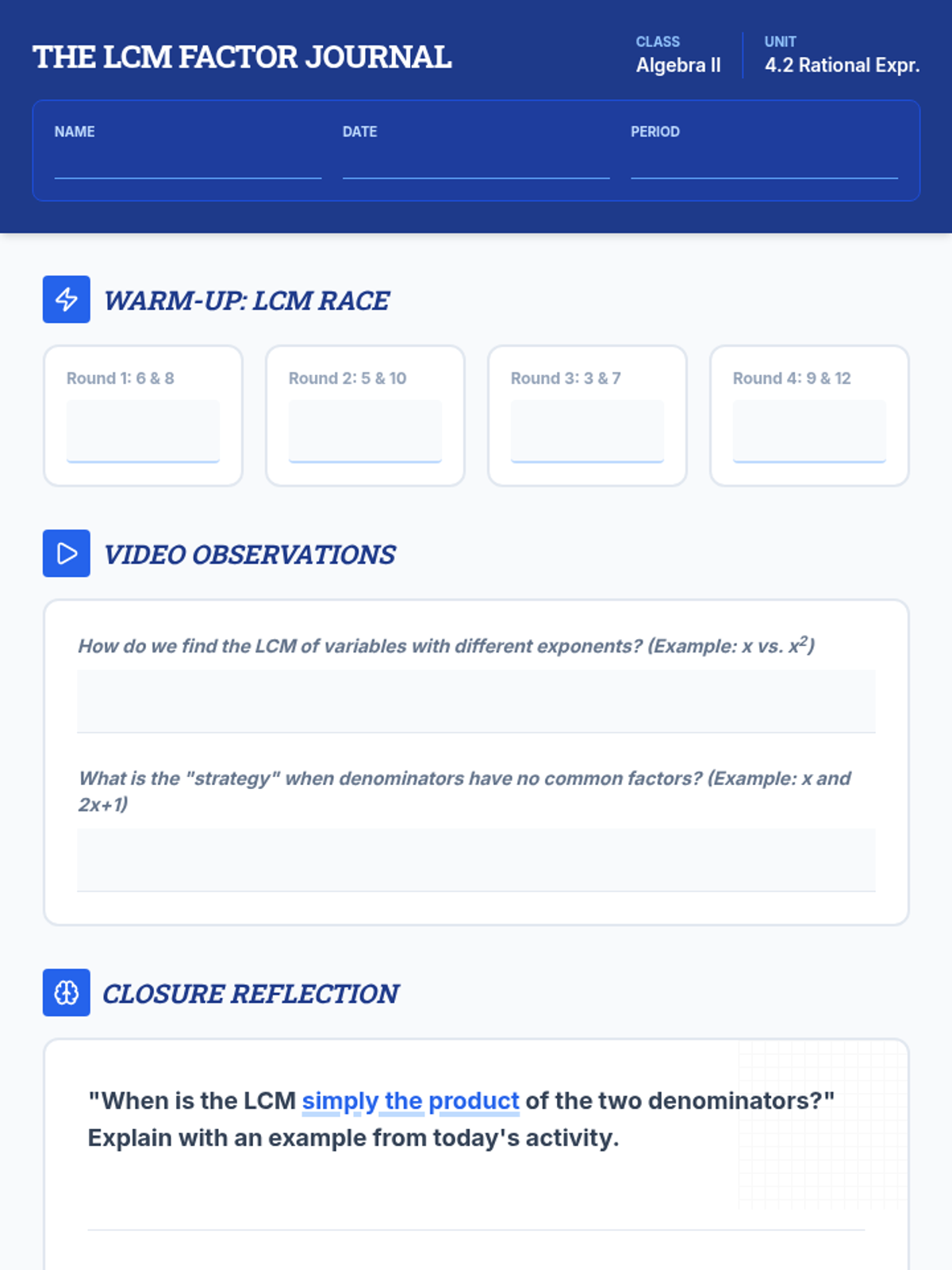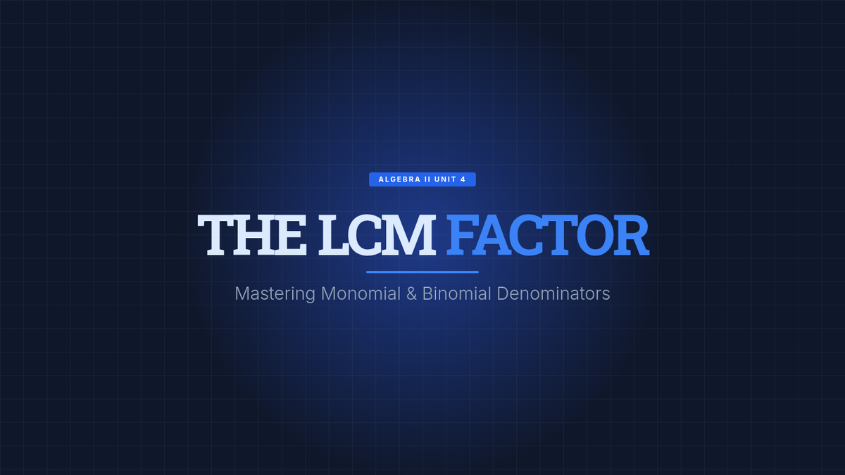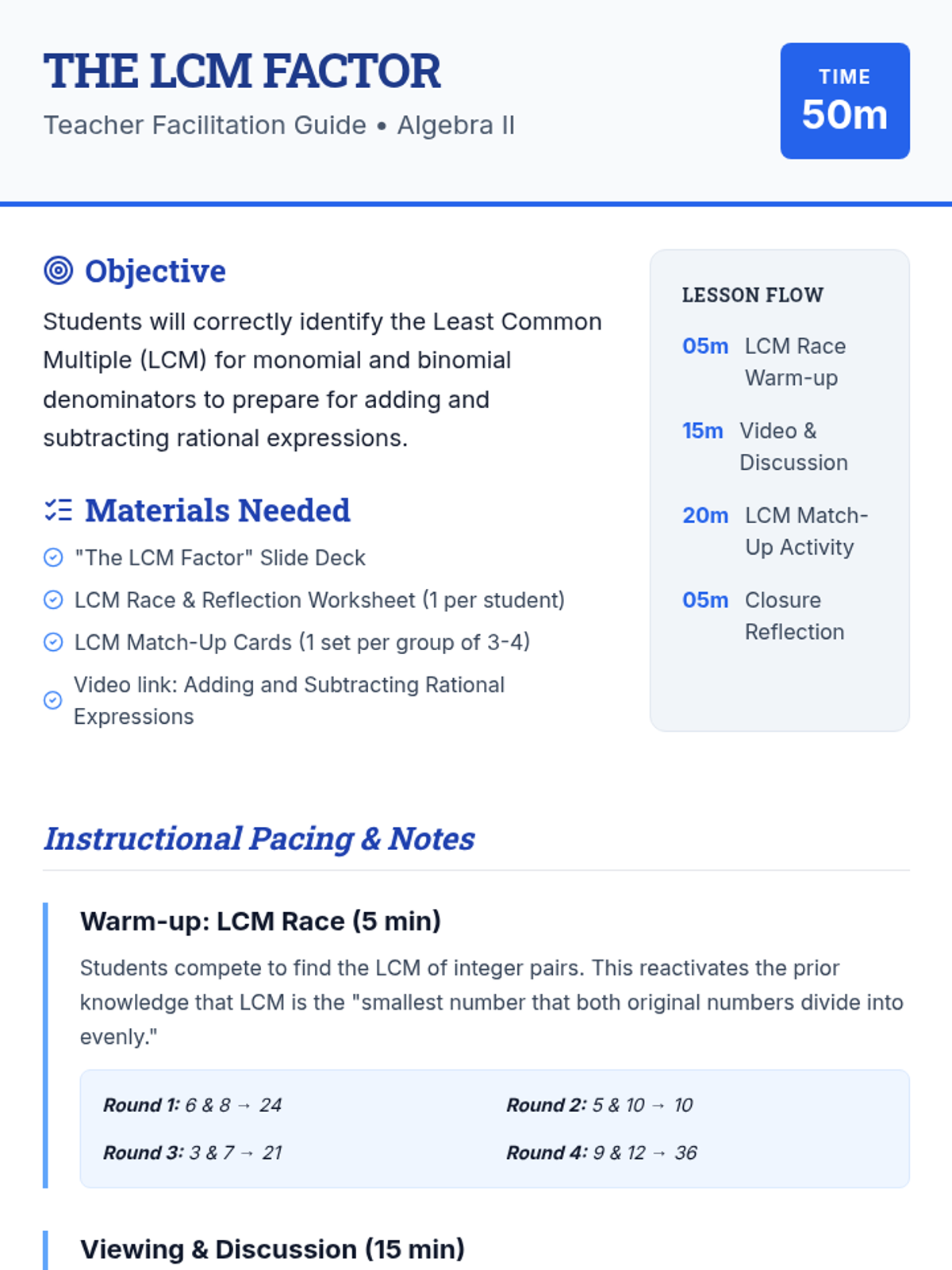 A lesson focused on identifying the Least Common Multiple (LCM) for monomial and binomial denominators in rational expressions, featuring a video breakdown and a hands-on matching activity.