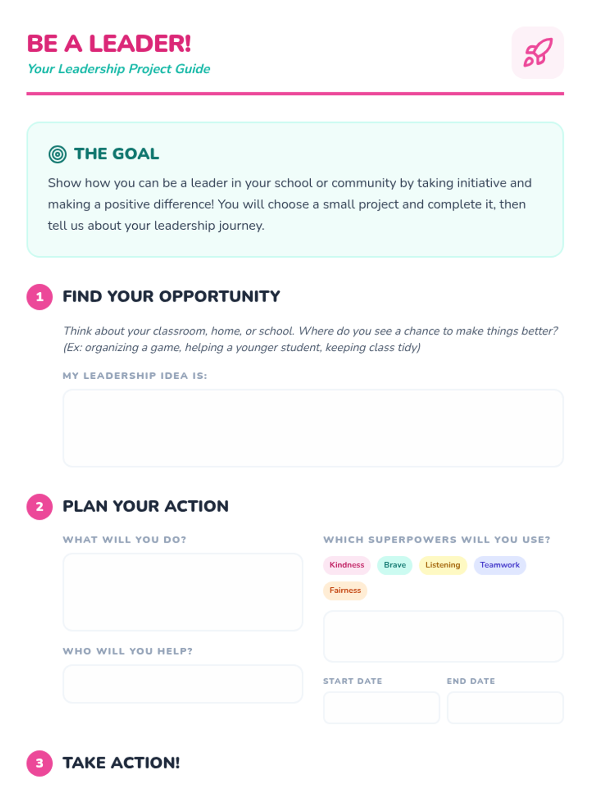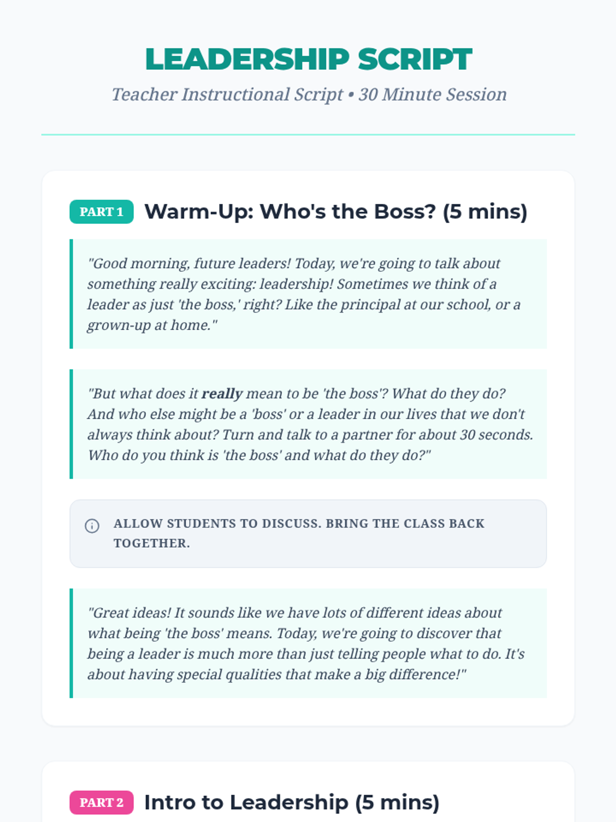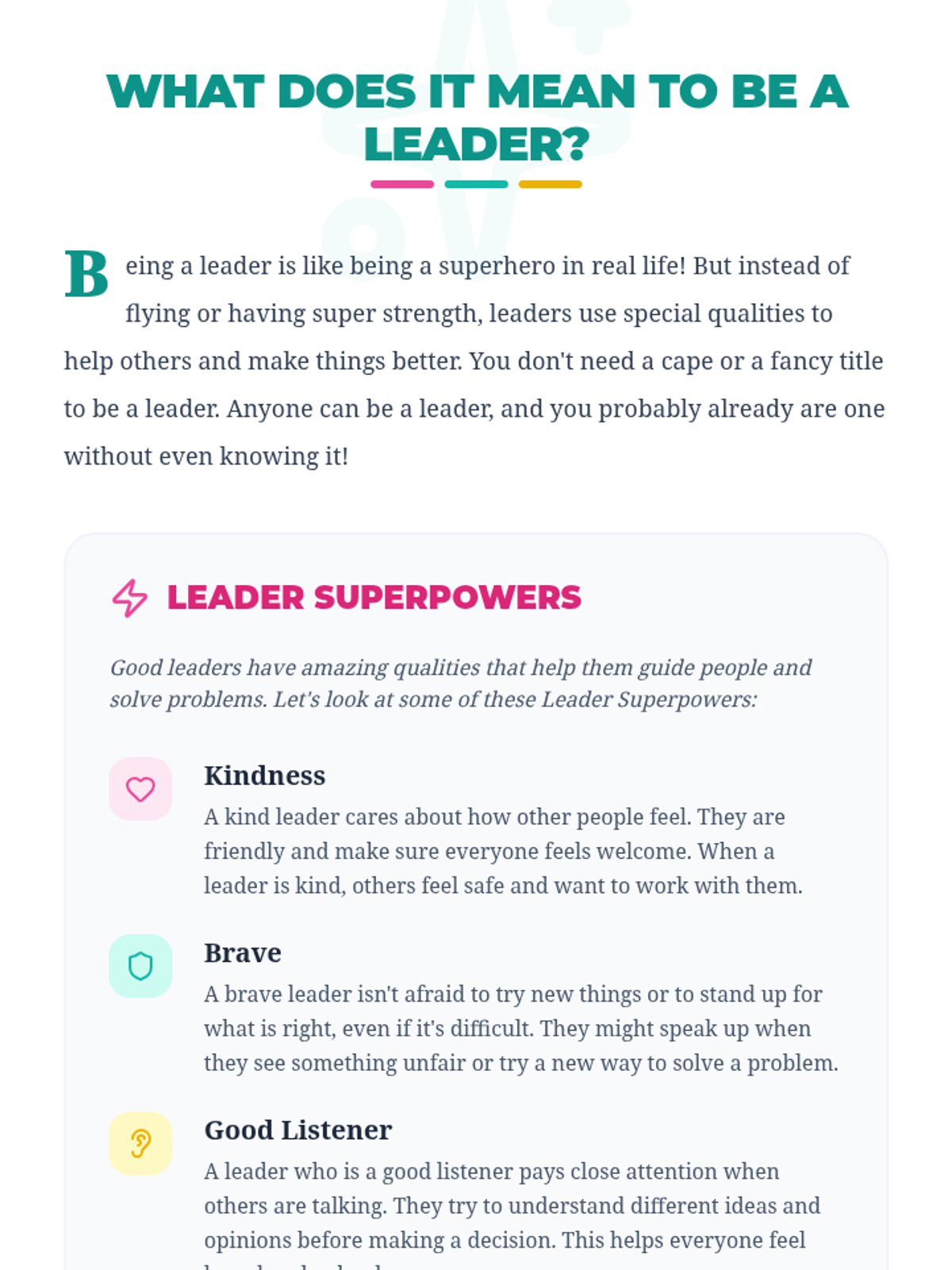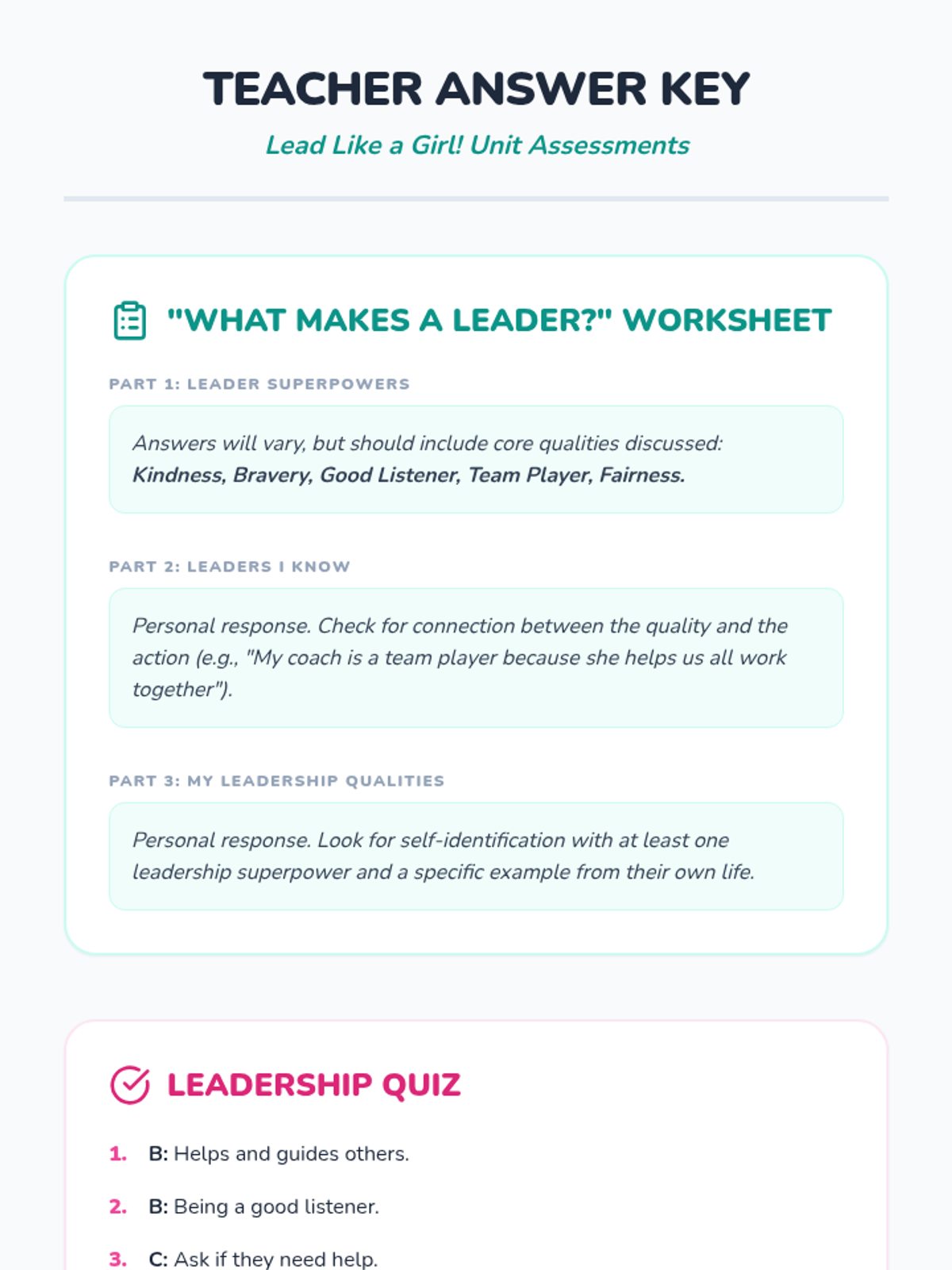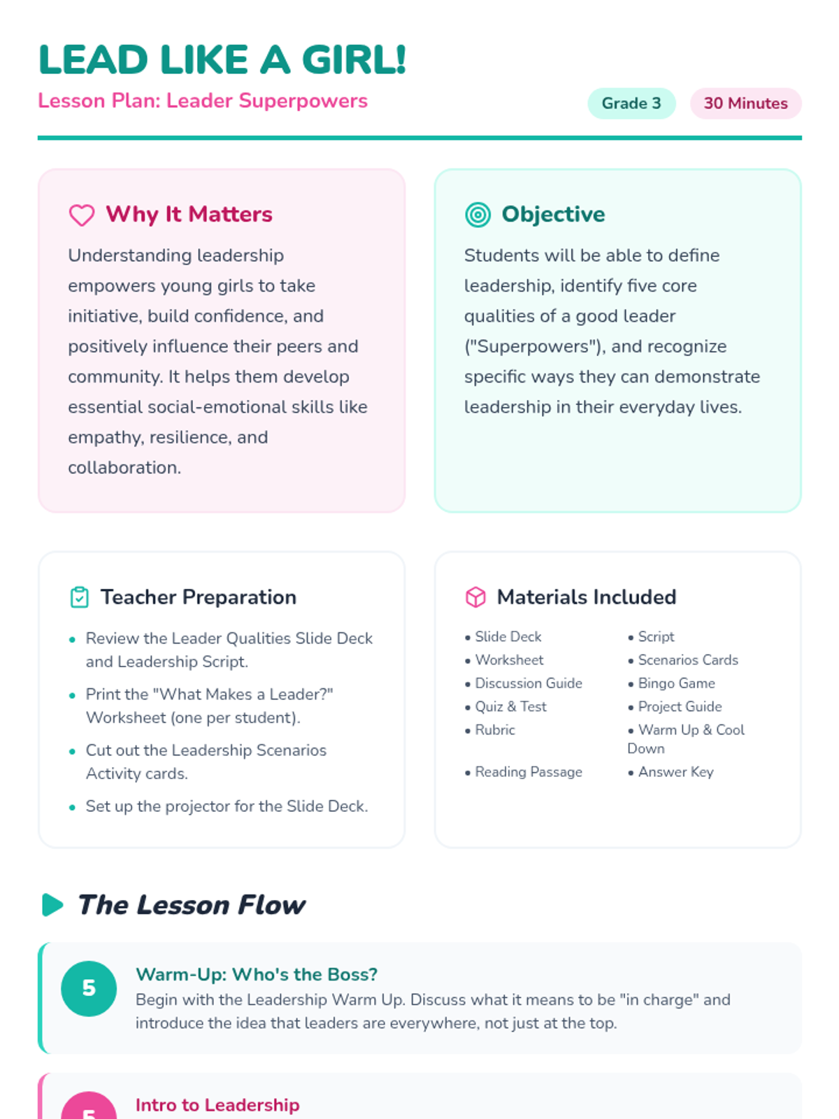 This 30-minute lesson empowers 3rd-grade girls to recognize their innate leadership potential through the concept of 'Leader Superpowers' like kindness, bravery, and fairness. Students engage in discussions, scenario-based problem solving, and reflective activities to understand that leading isn't about being 'the boss' but about making a positive impact.