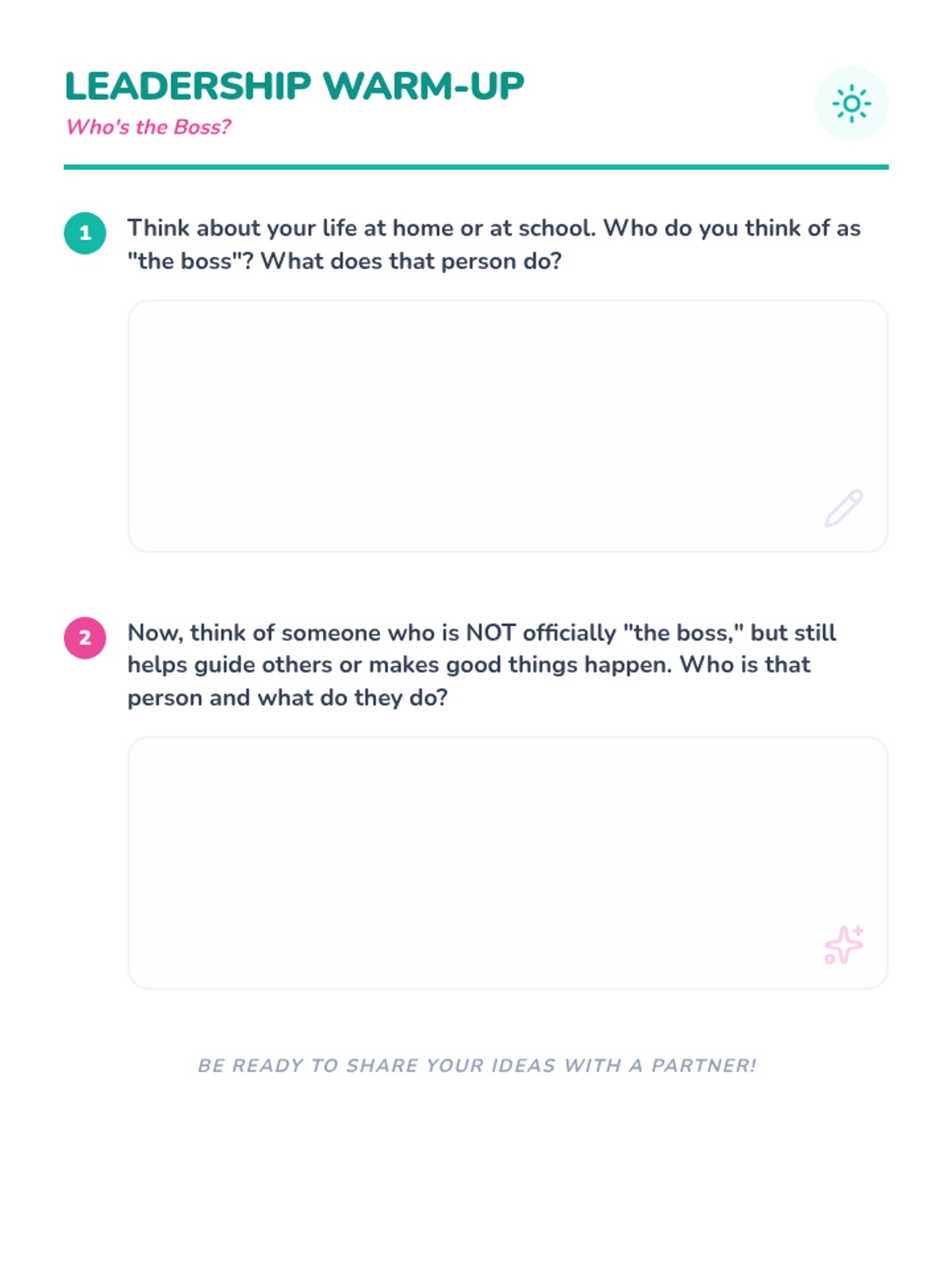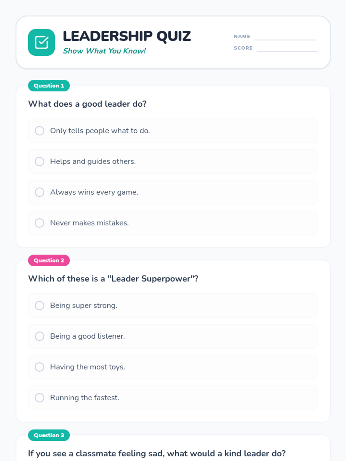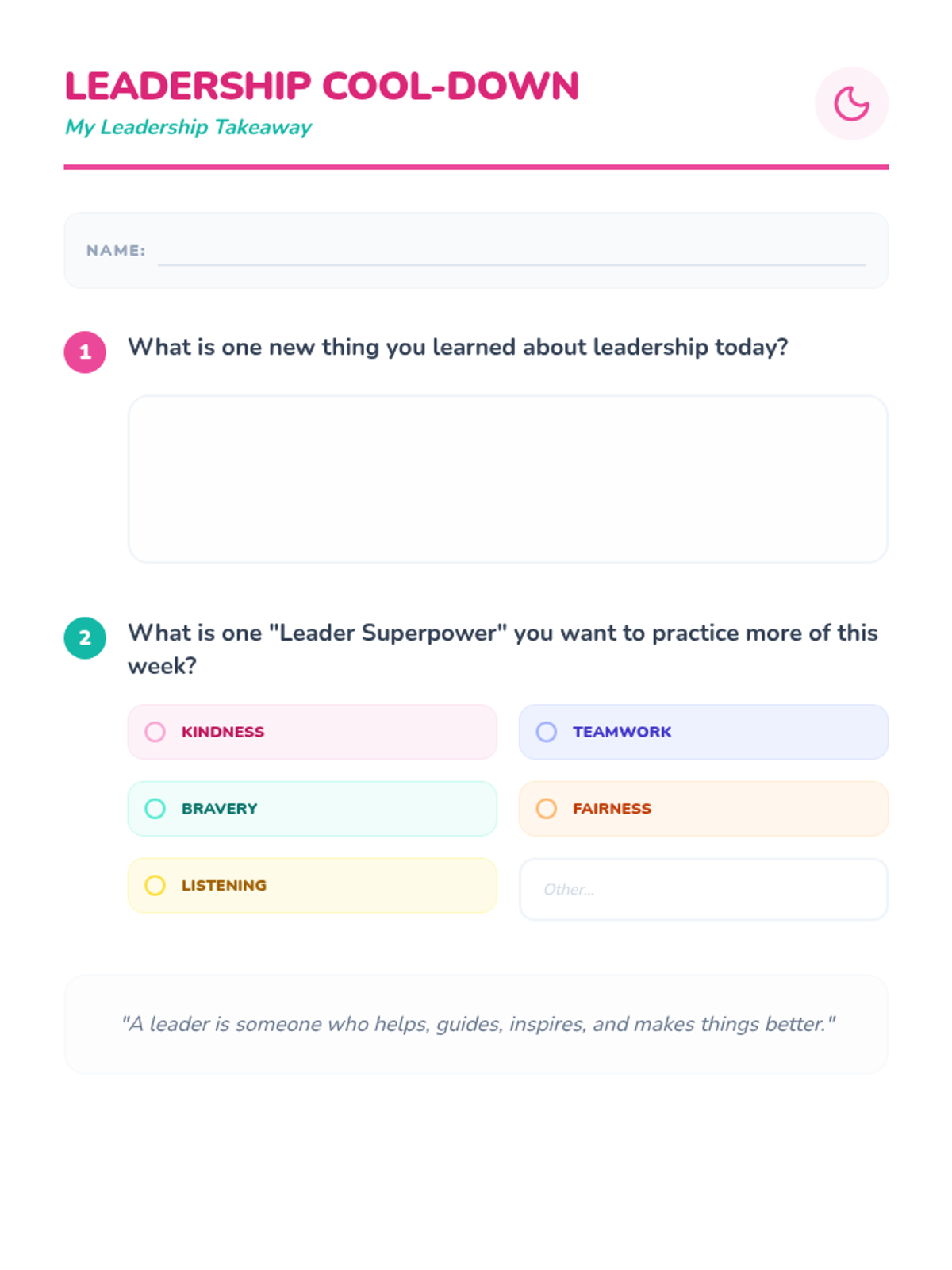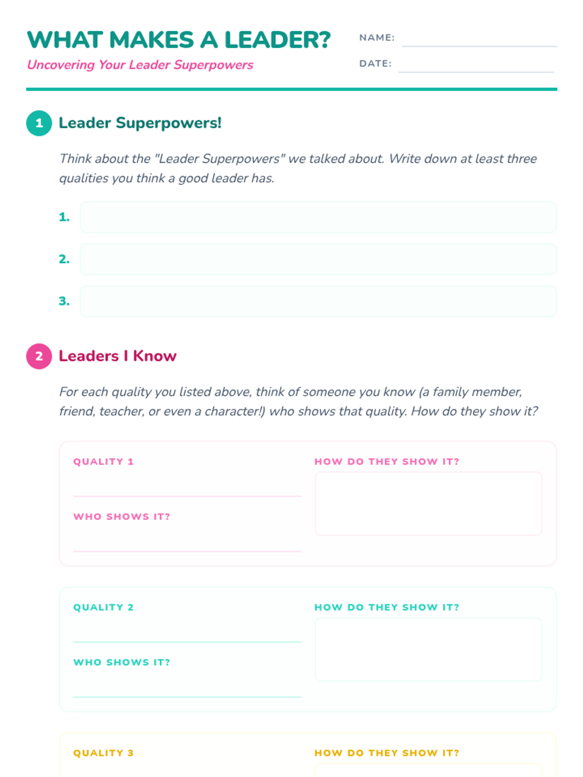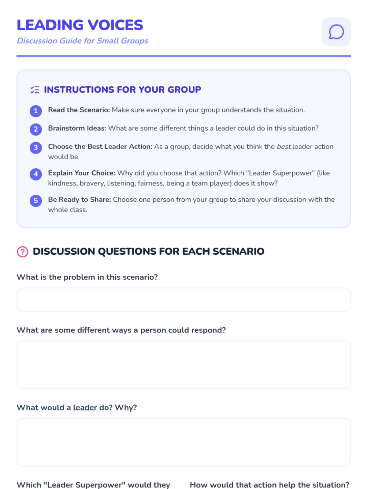 This 30-minute lesson empowers 3rd-grade girls to recognize their innate leadership potential through the concept of 'Leader Superpowers' like kindness, bravery, and fairness. Students engage in discussions, scenario-based problem solving, and reflective activities to understand that leading isn't about being 'the boss' but about making a positive impact.
