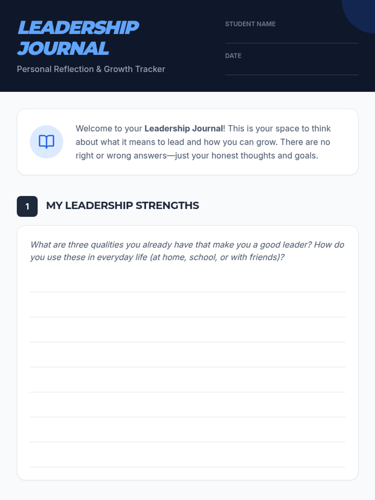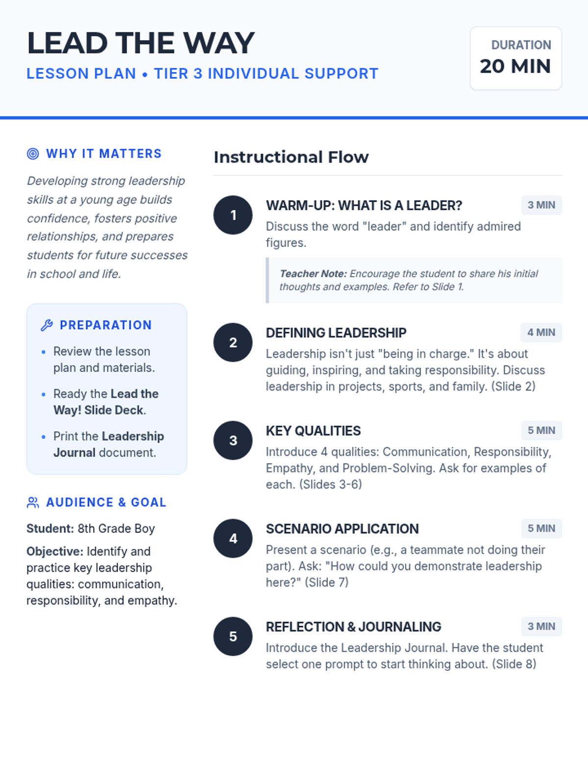 A 20-minute Tier 3 individual lesson for 8th-grade students focused on identifying personal strengths and developing core leadership skills like communication, empathy, and responsibility.