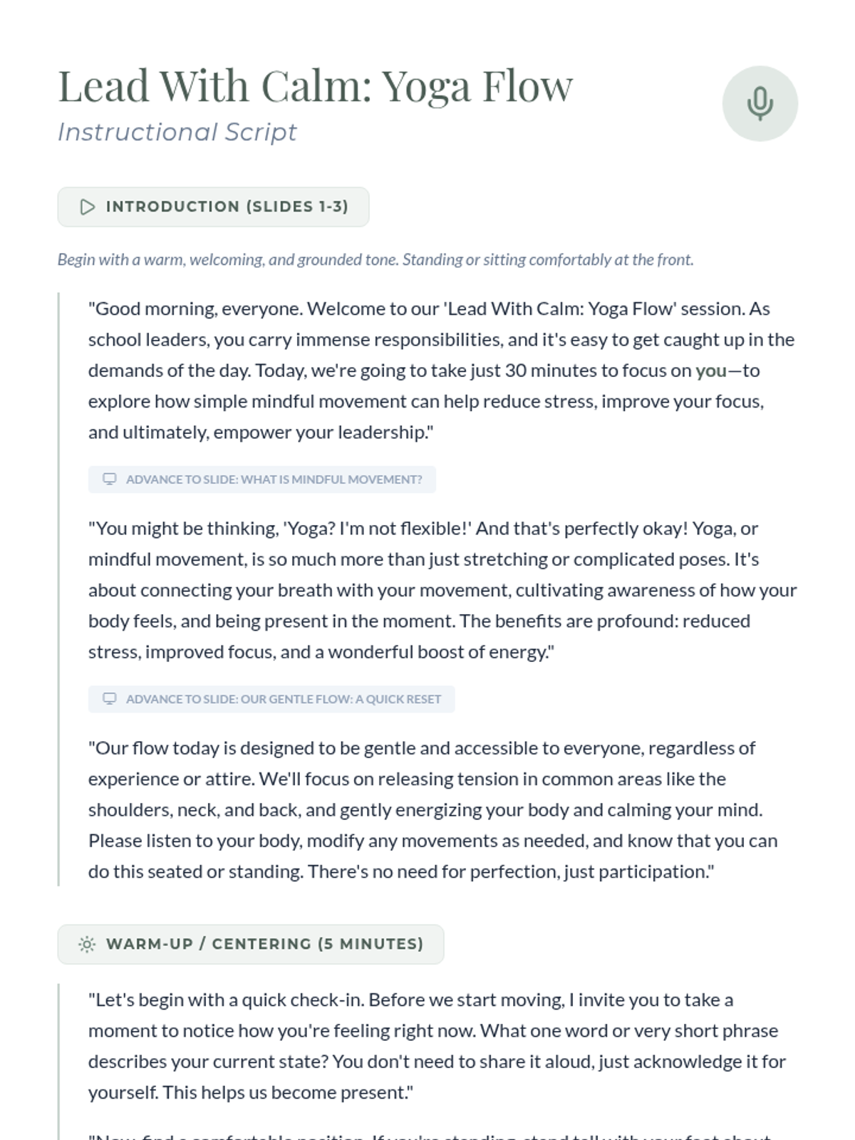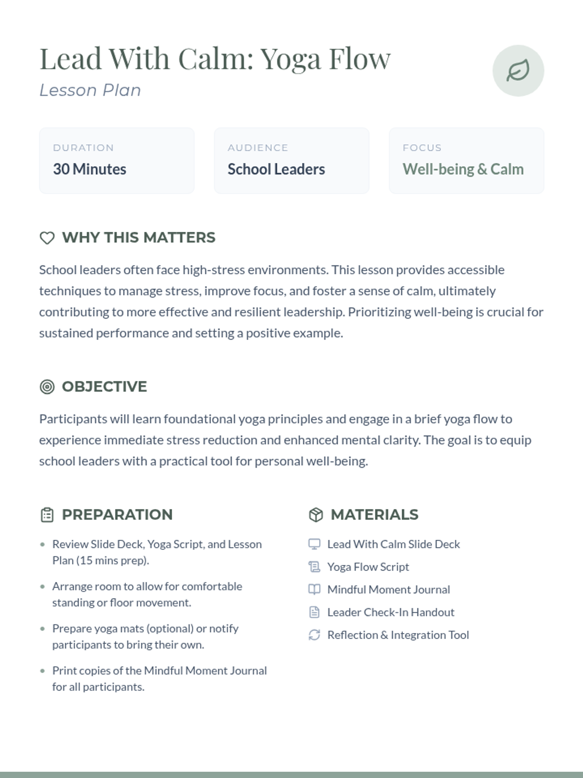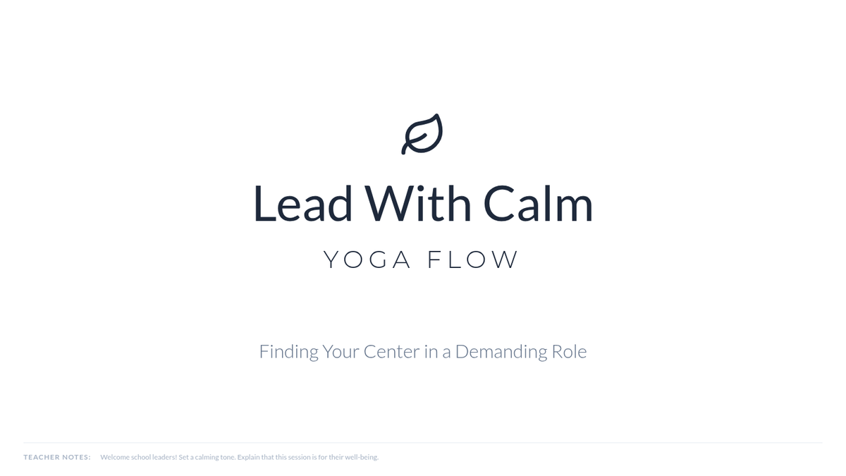 A 30-minute experiential session for school leaders that introduces basic yoga principles and a gentle movement flow to reduce stress and enhance leadership focus.