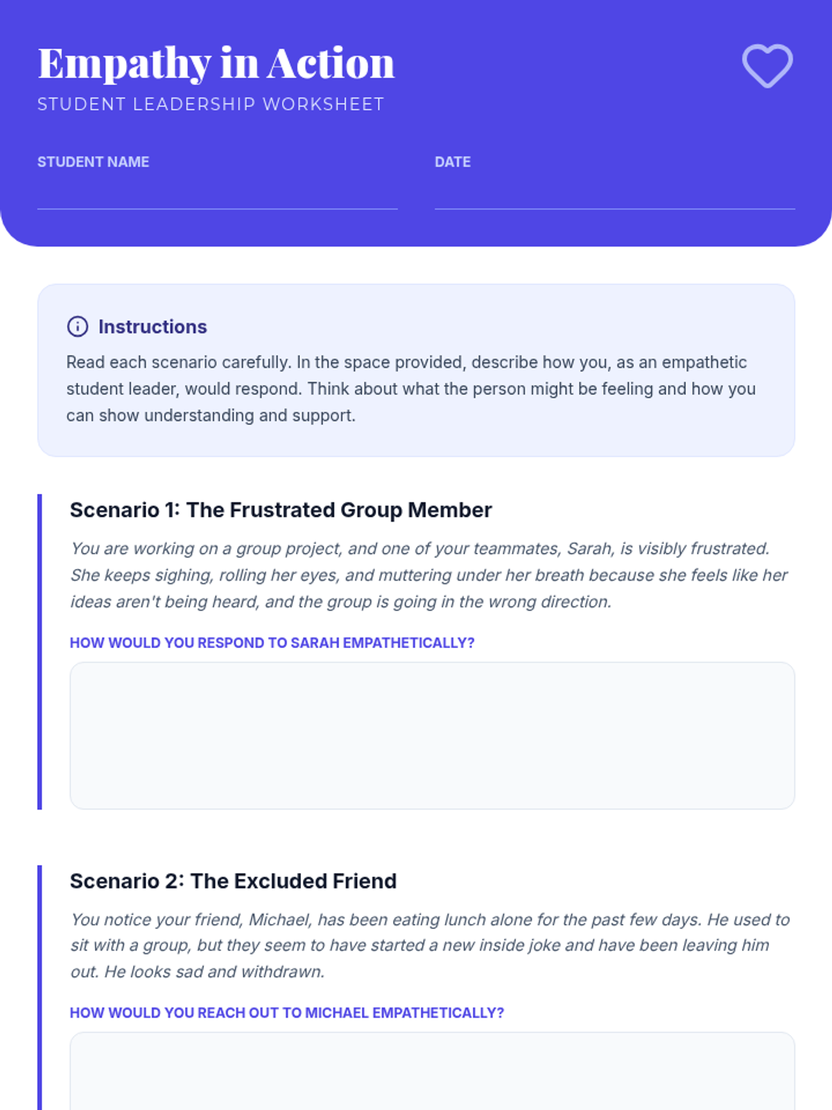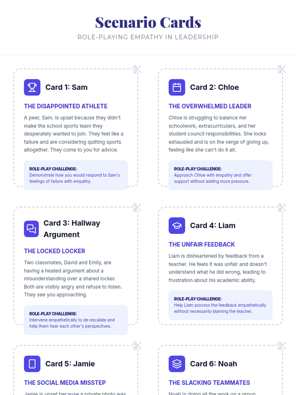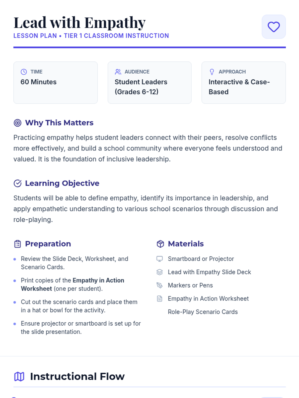 A 60-minute lesson for middle and high school student leaders to develop empathy skills, focusing on perspective-taking, active listening, and supporting peers to create a more inclusive school culture.