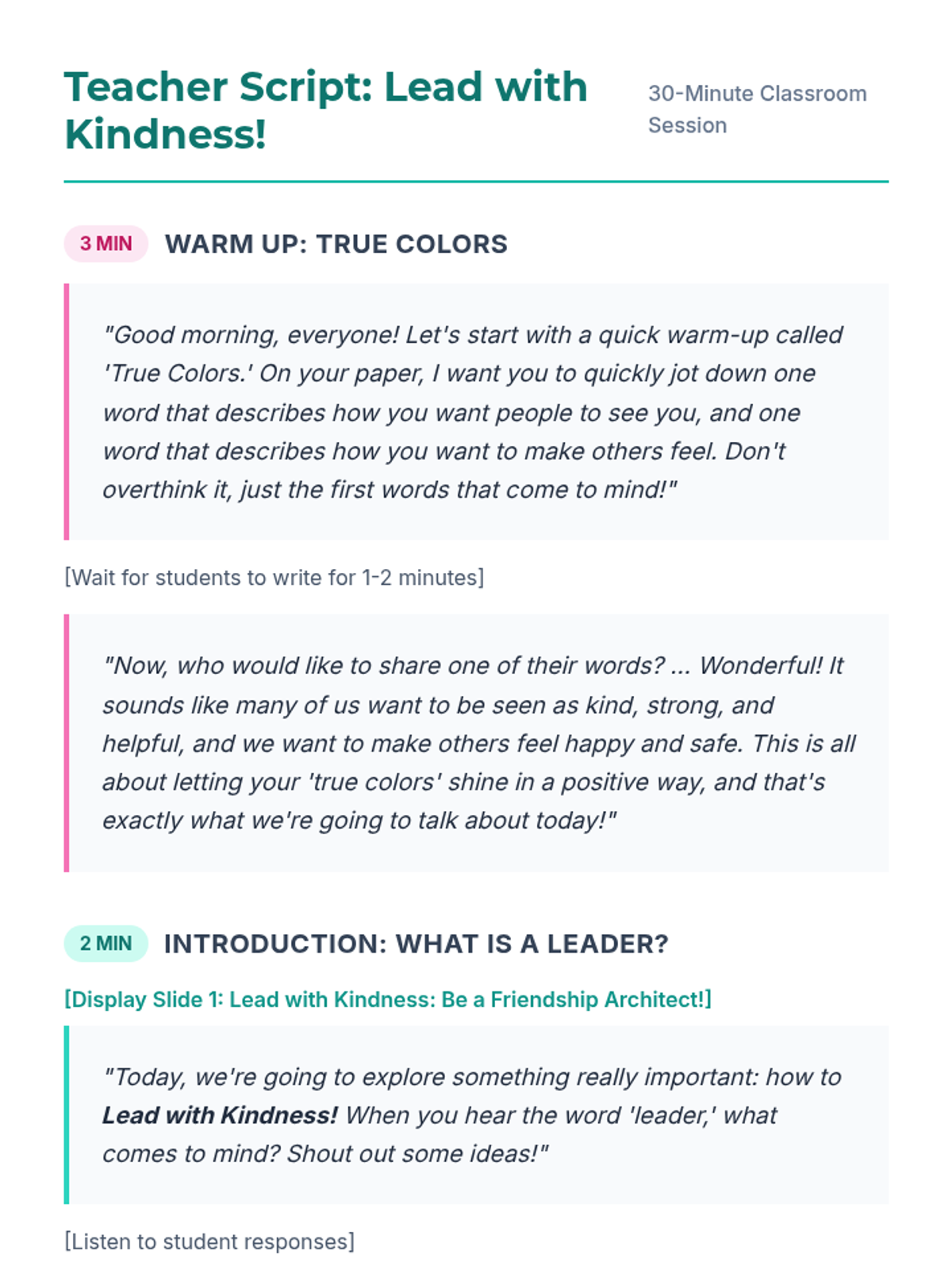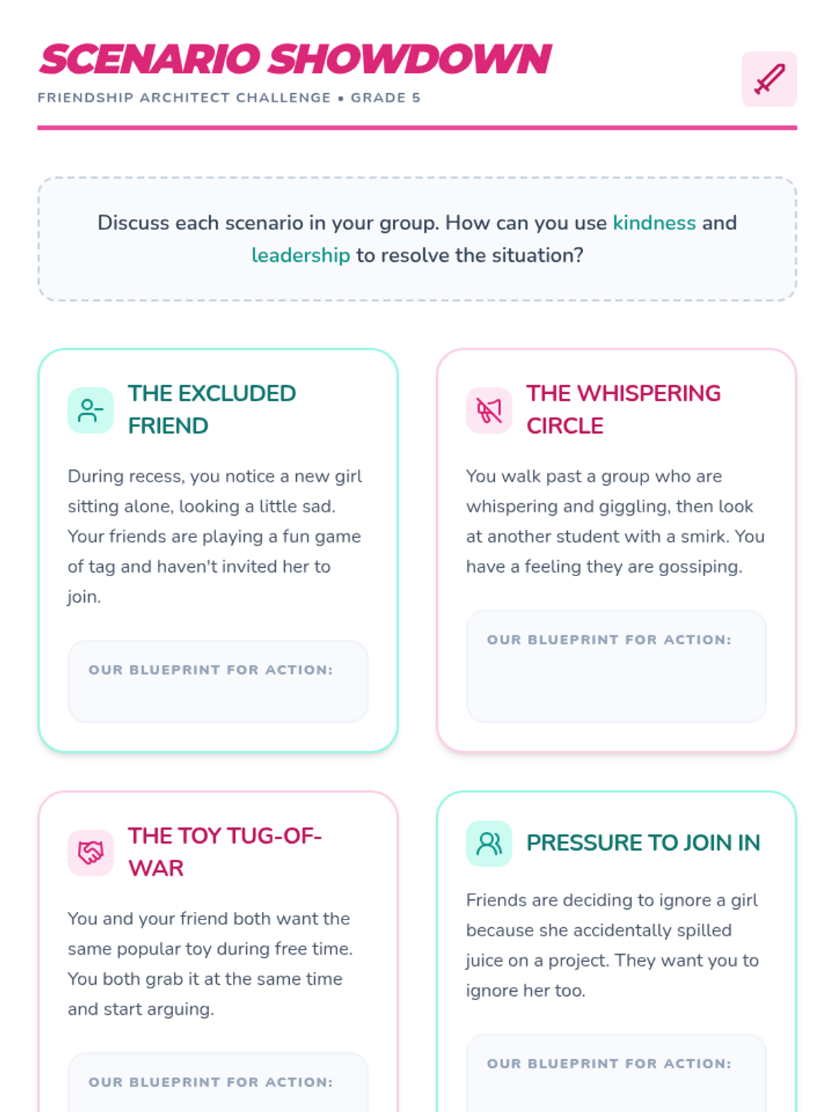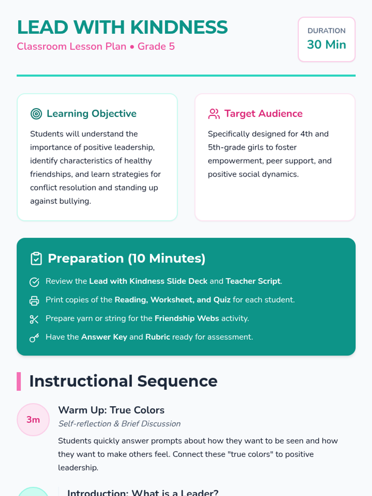 A 30-minute lesson for 5th-grade girls focused on positive leadership, healthy friendships, and conflict resolution using the 'Friendship Architect' theme.