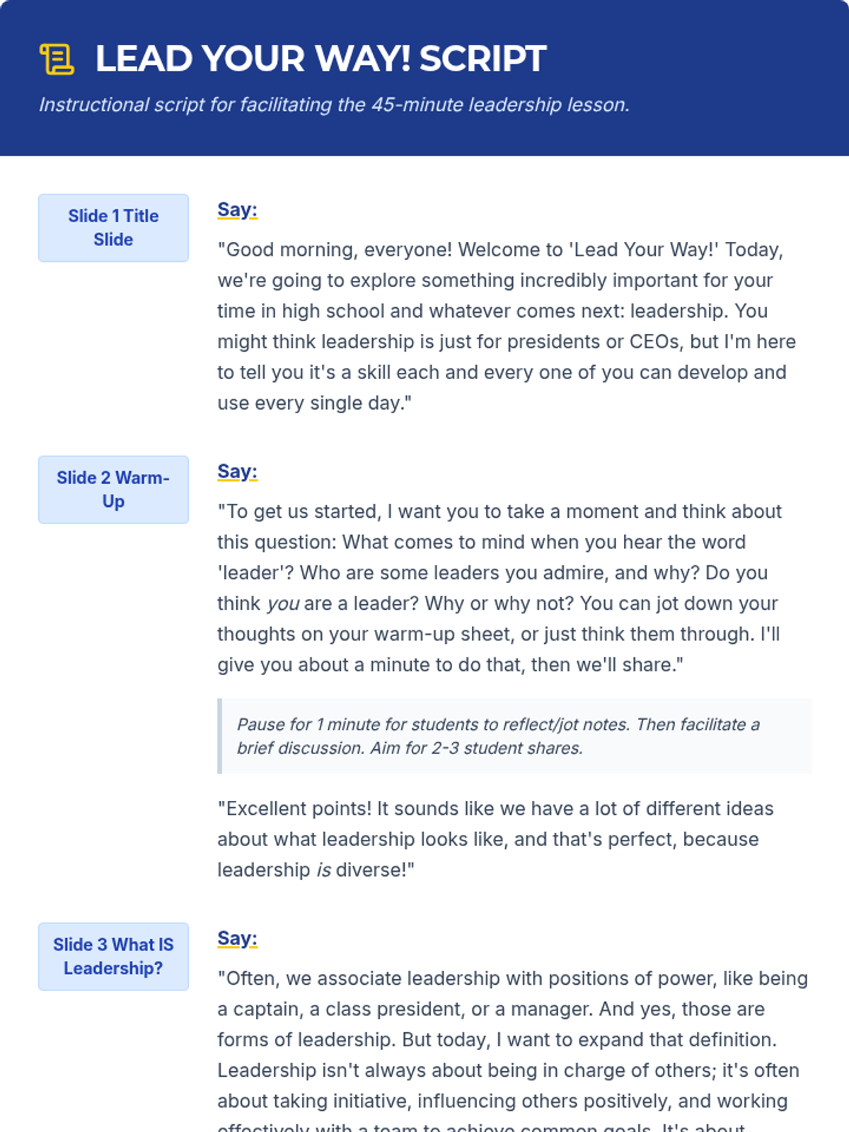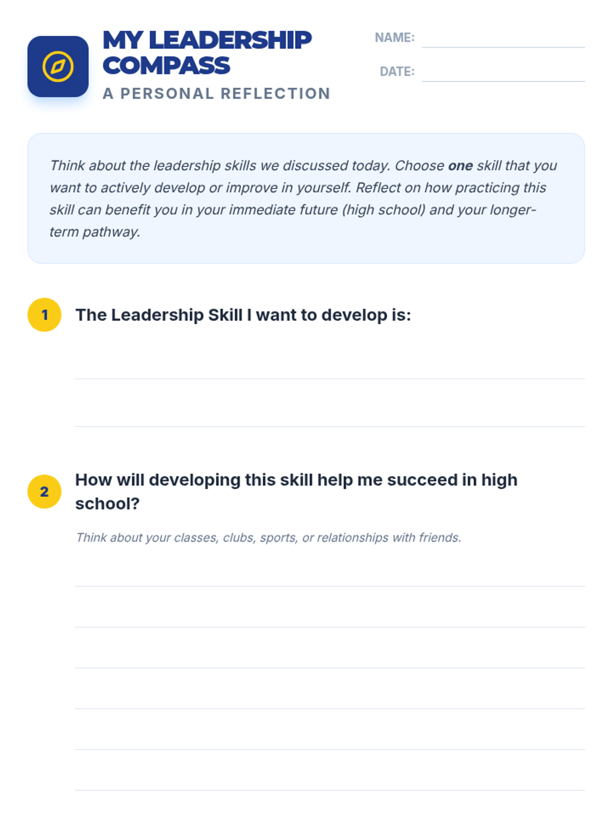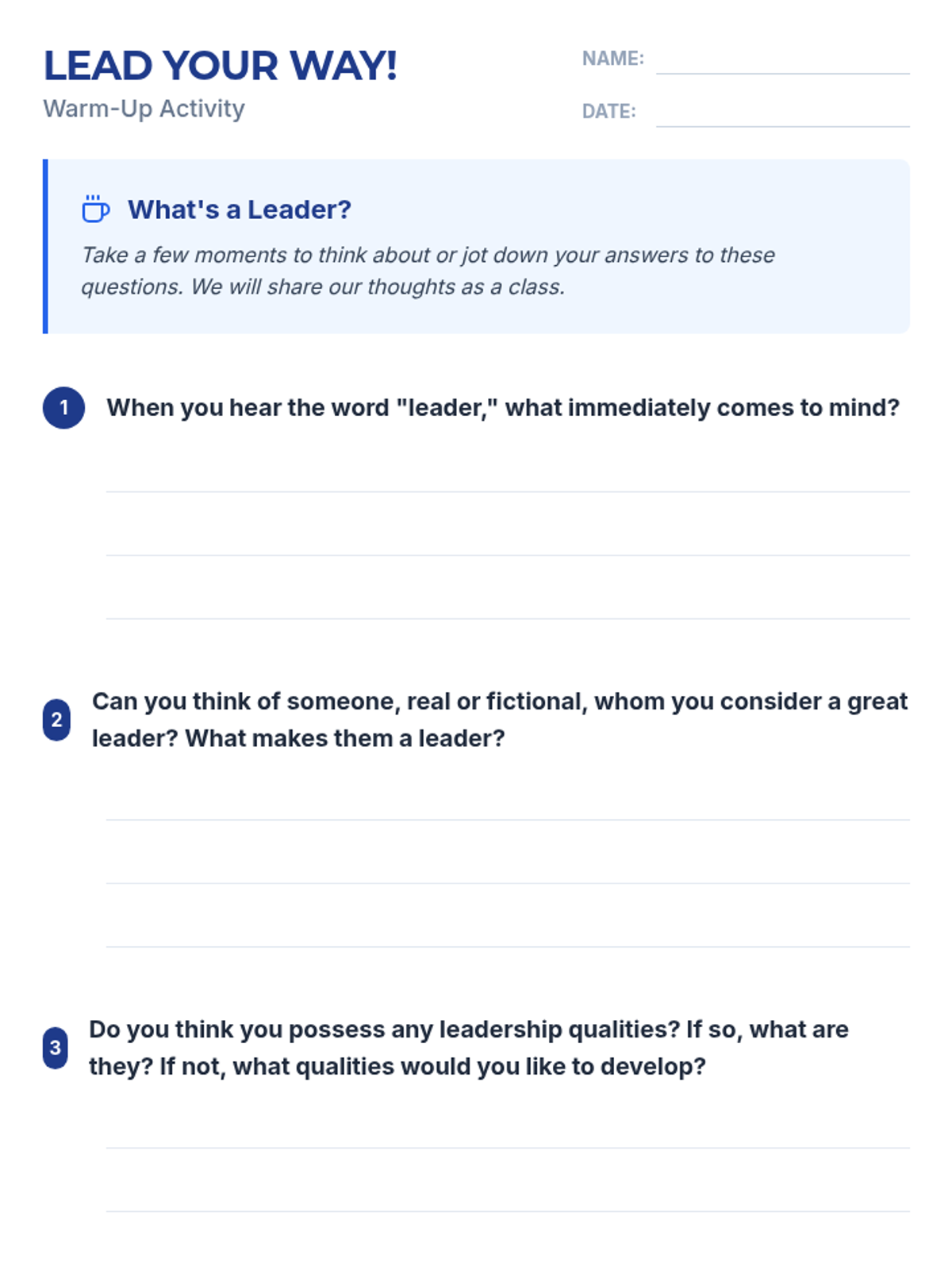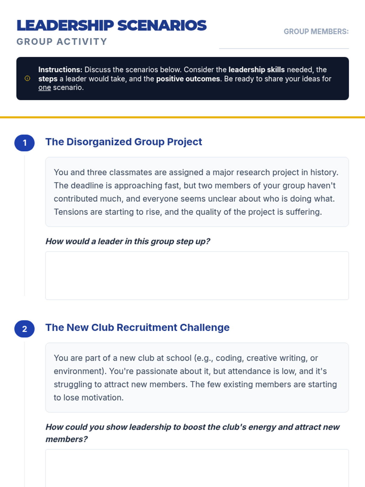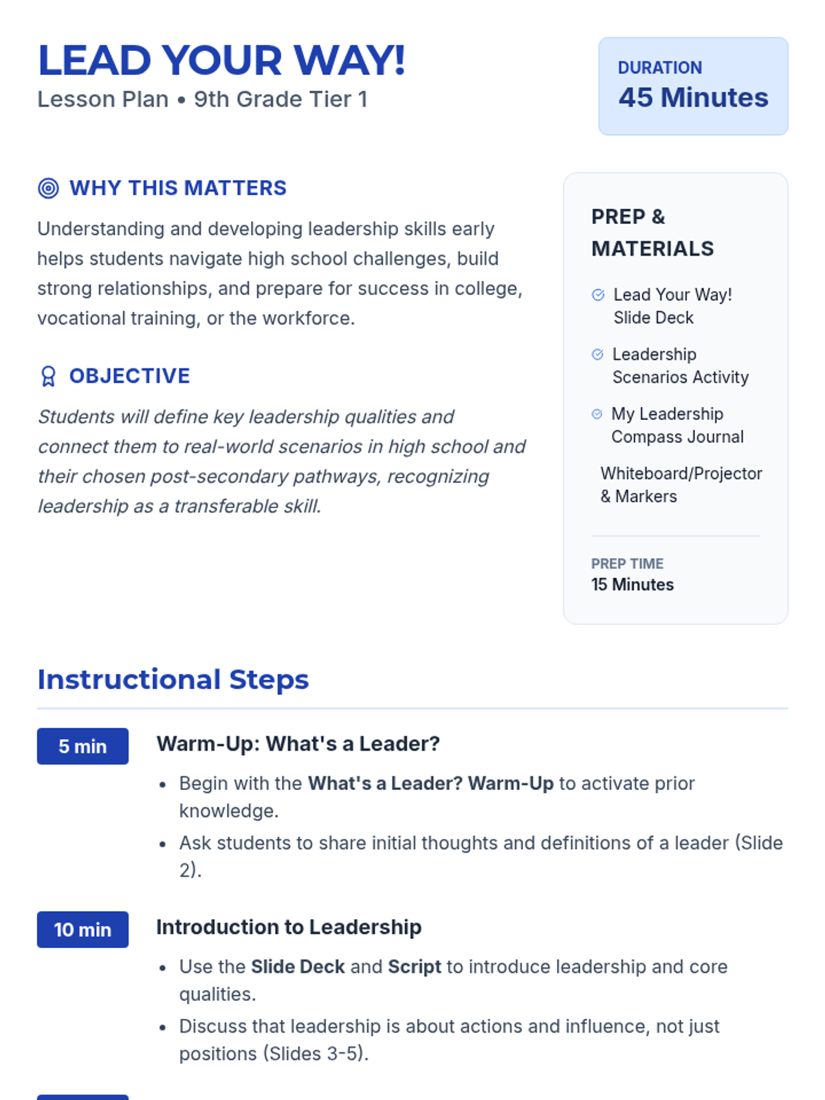 This 45-minute Tier 1 lesson introduces 9th-grade students to essential leadership skills as transferable assets for high school and post-secondary success. Students will define key leadership qualities and apply them to real-world scenarios through interactive discussion and personal reflection.