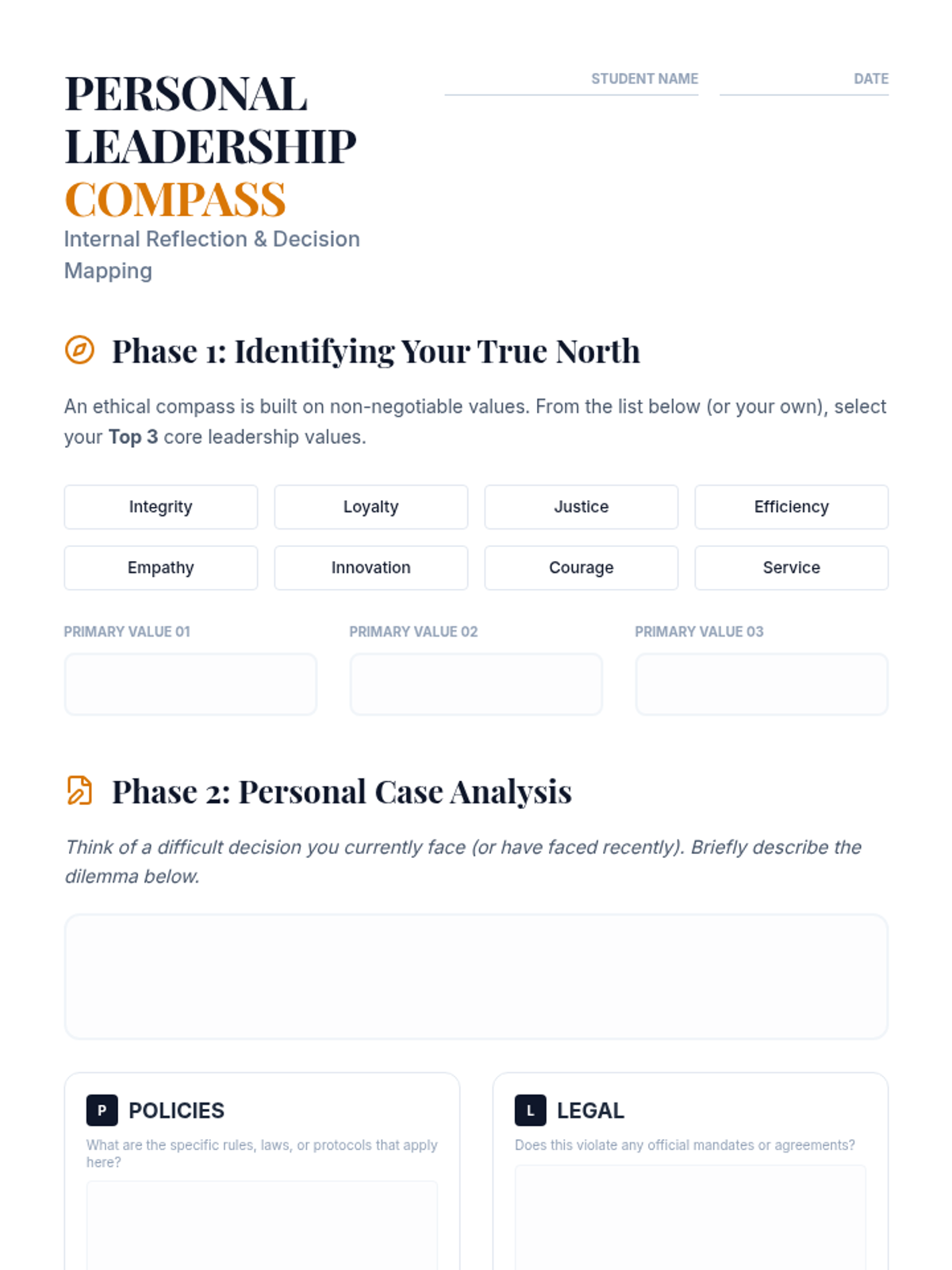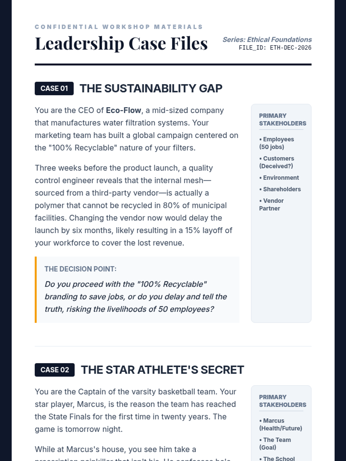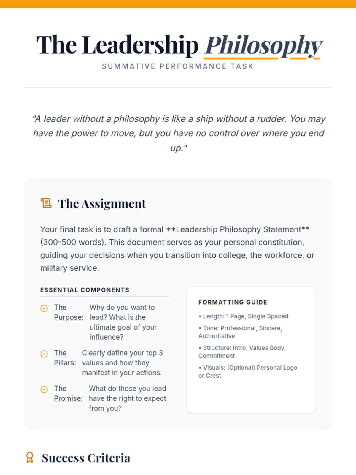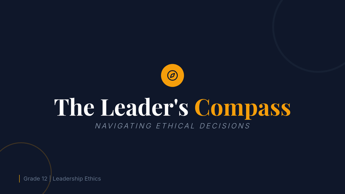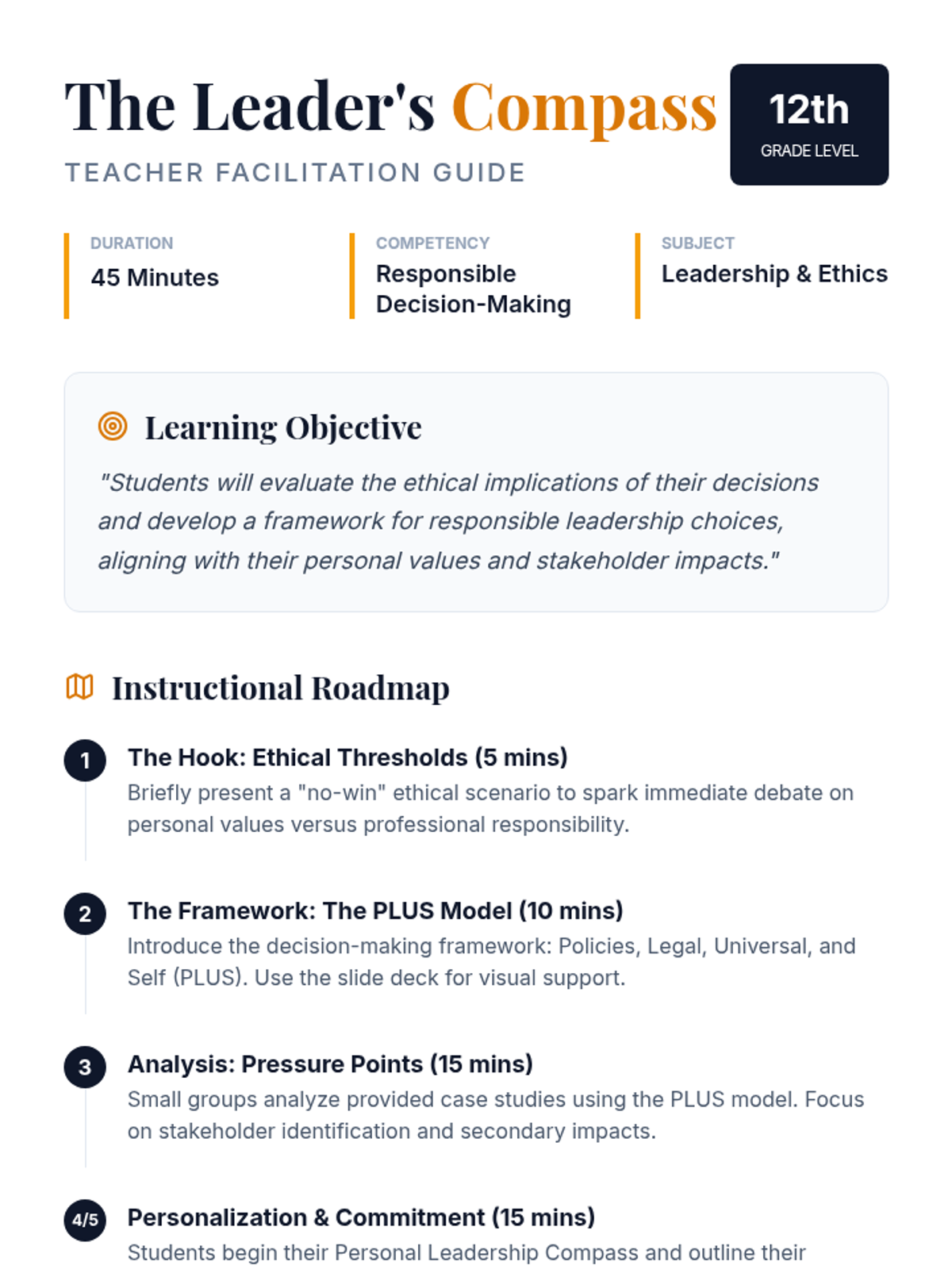 A high school leadership lesson focused on ethical decision-making frameworks, stakeholder analysis, and crafting a personal leadership philosophy.