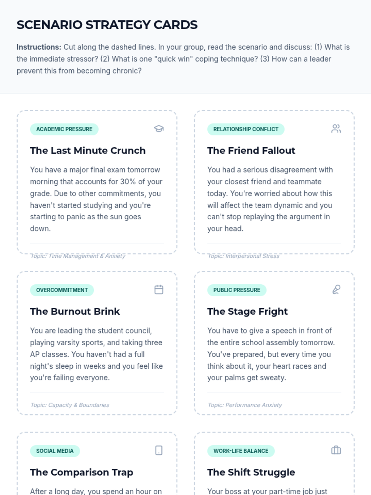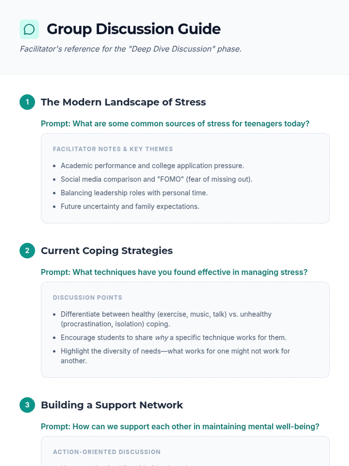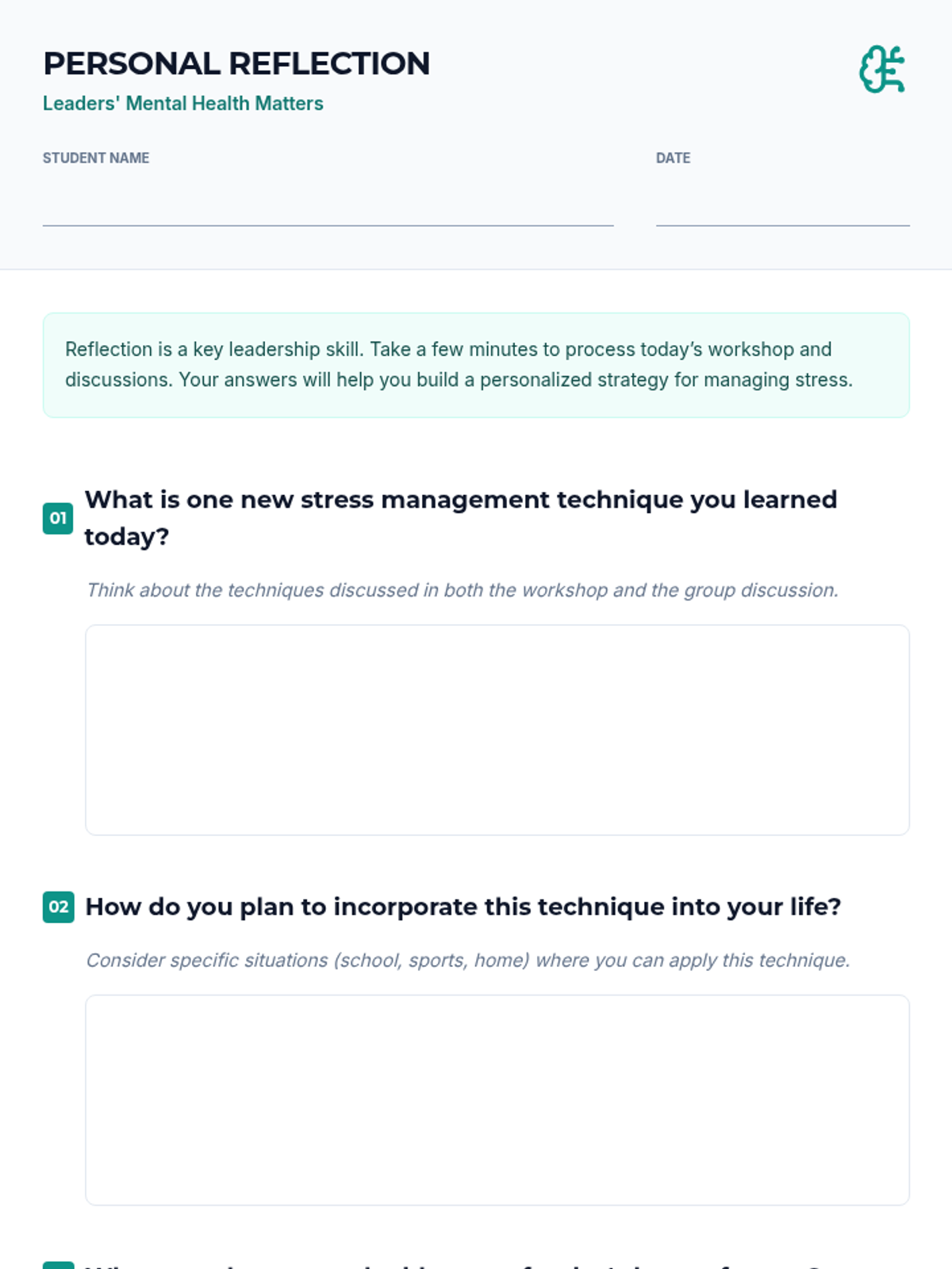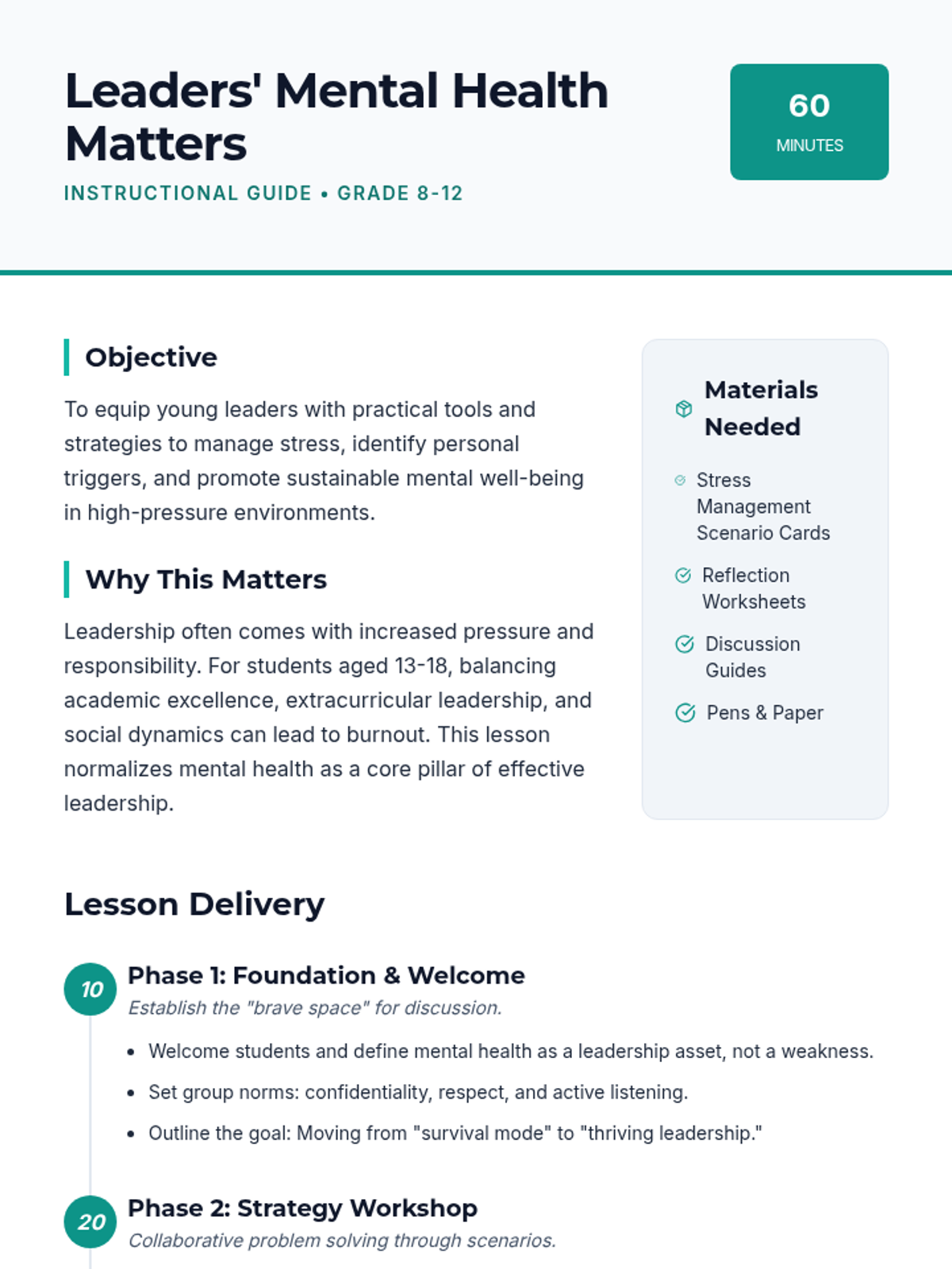 A comprehensive lesson designed for young leaders aged 13-18 to develop stress management techniques and promote long-term mental well-being through workshops and reflective practice.