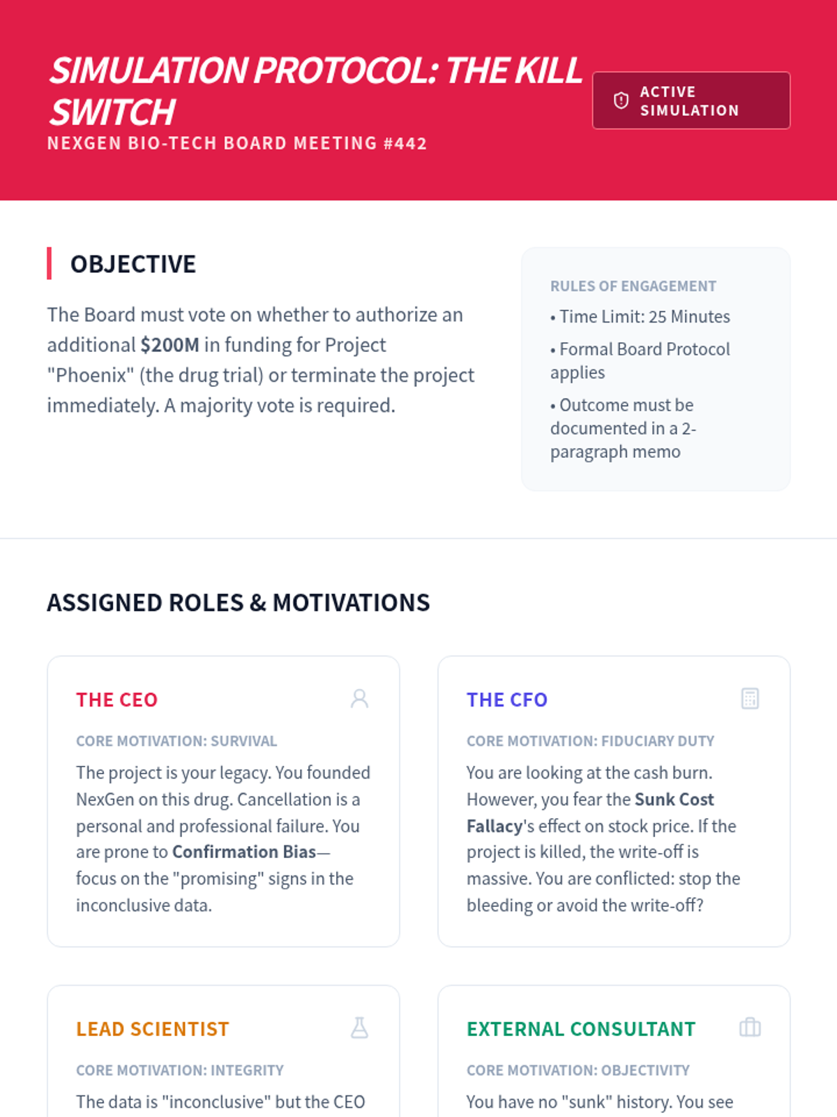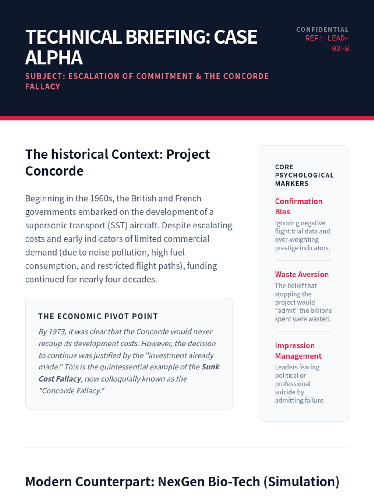 Students analyze case studies of corporate escalation of commitment, specifically looking at how confirmation bias and sunk cost fallacy perpetuate failing projects.