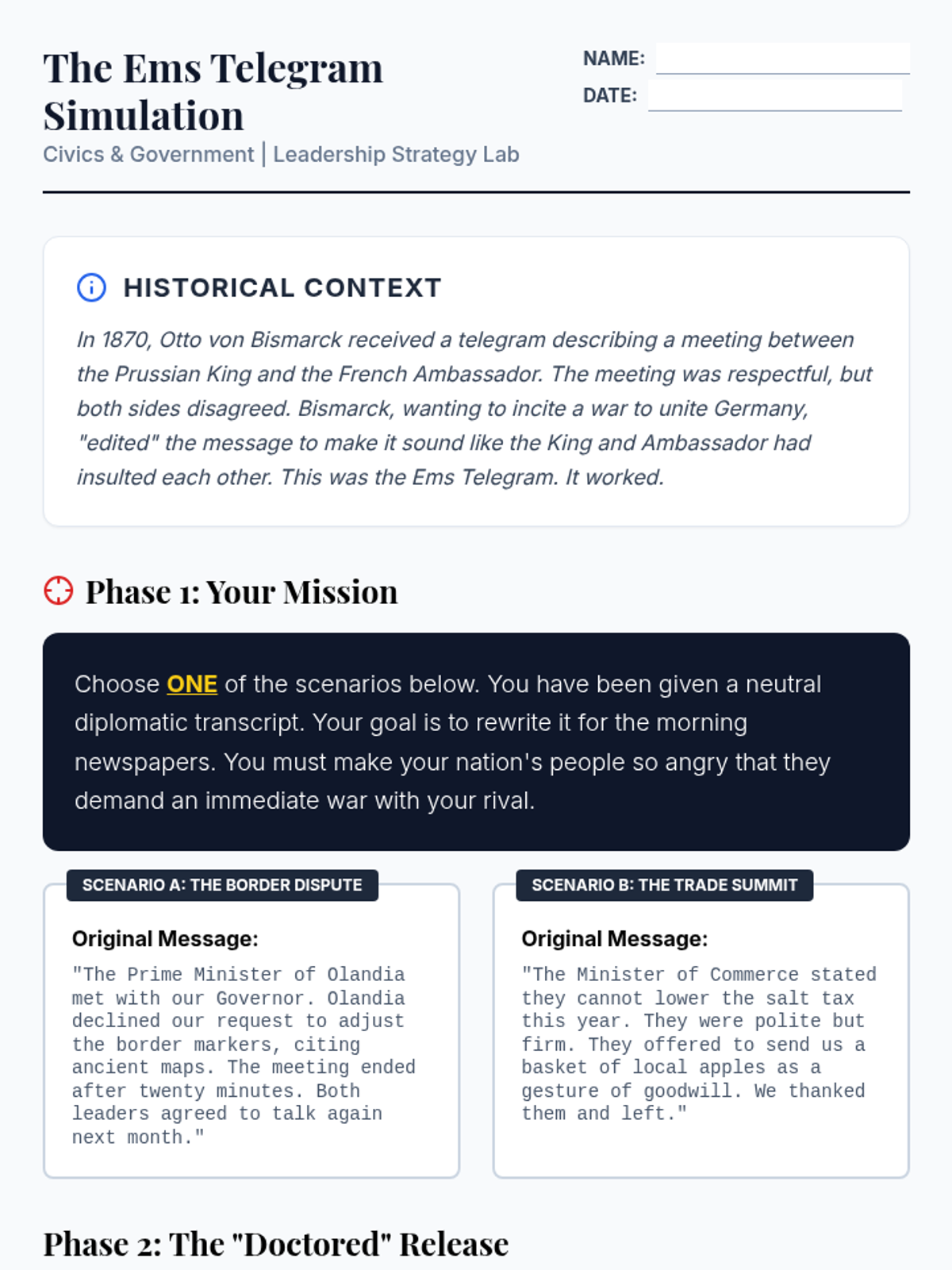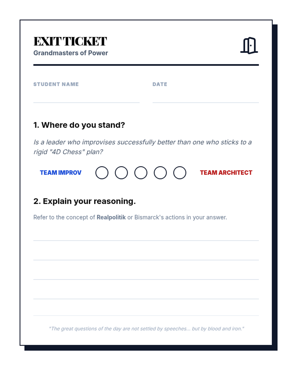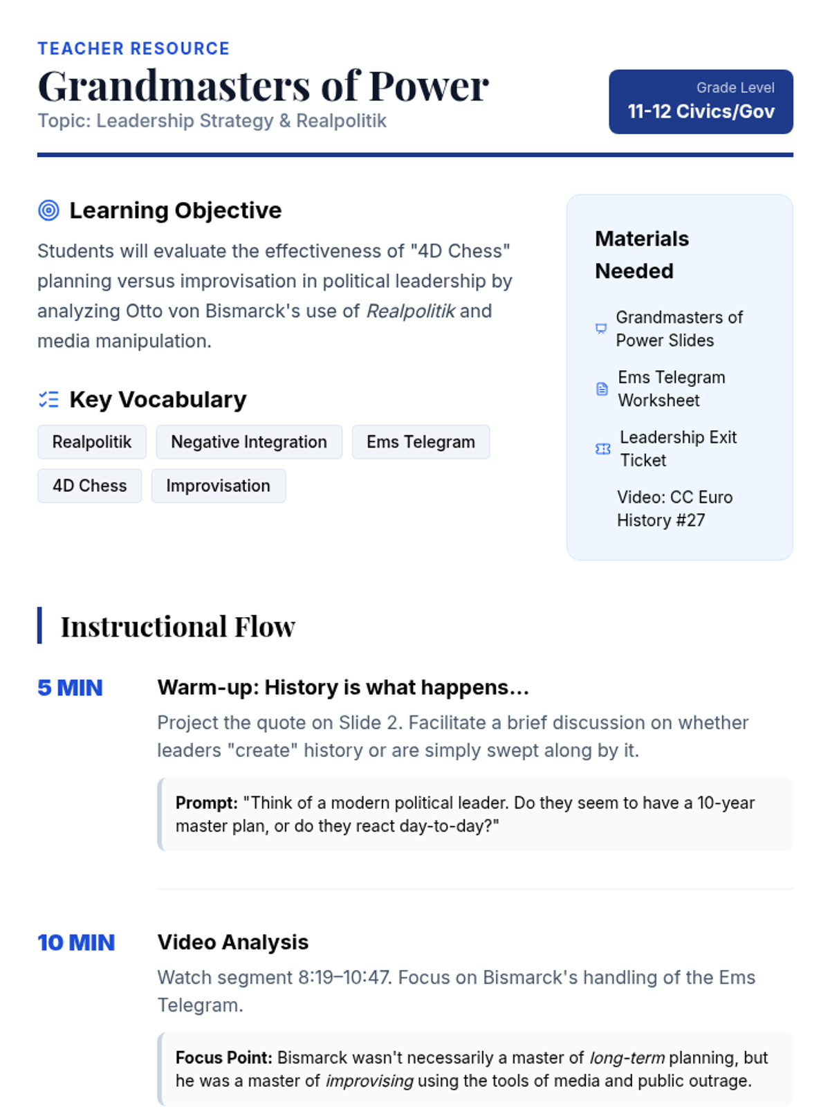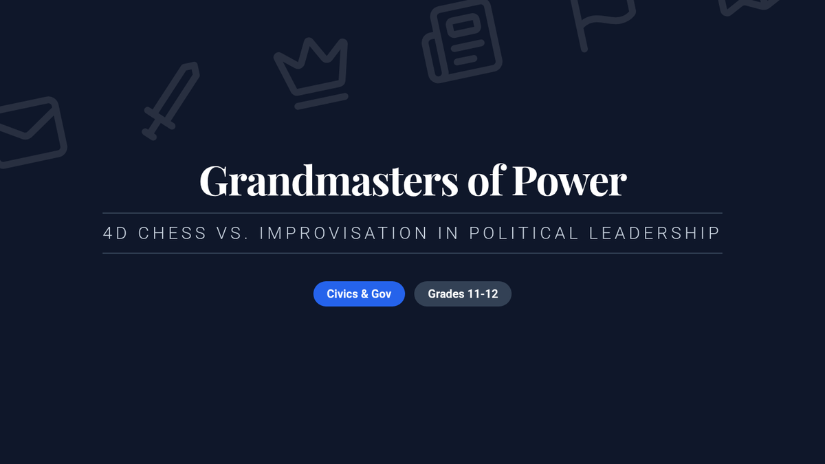 An 11th-12th grade Civics and Government lesson evaluating the strategies of historical leadership through the lens of Otto von Bismarck's 'Realpolitik', featuring a simulation on media manipulation and the '4D Chess' vs. improvisation debate.