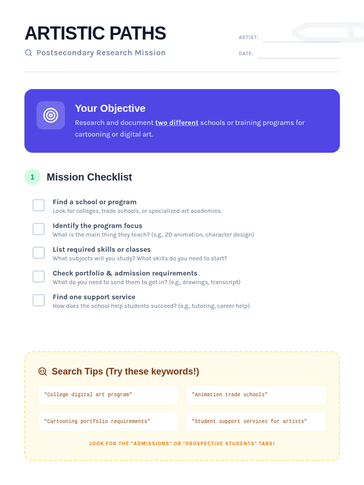 A guided research lesson designed to help students explore and document postsecondary education and training paths in cartooning and digital art.