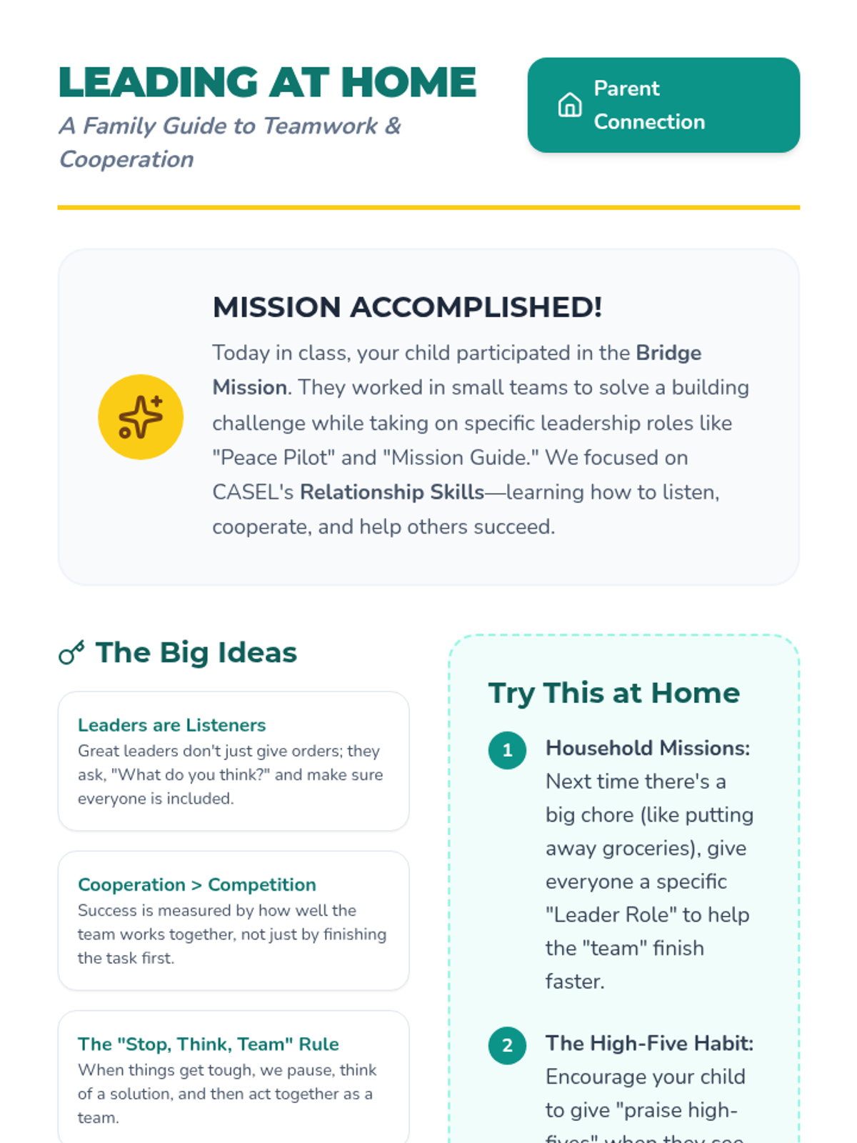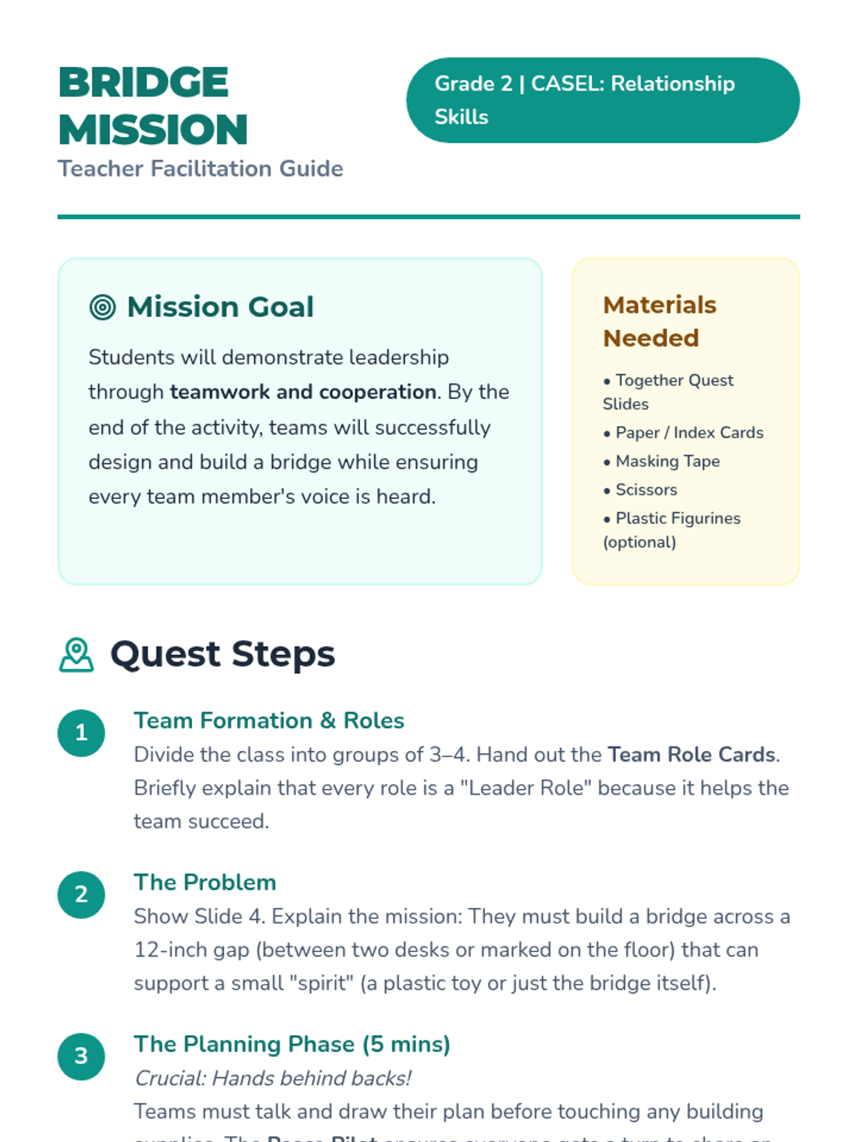 A high-energy lesson focused on teamwork and cooperation for 2nd graders. Students take on leadership roles to solve a group challenge, applying CASEL competencies like relationship skills and self-awareness.