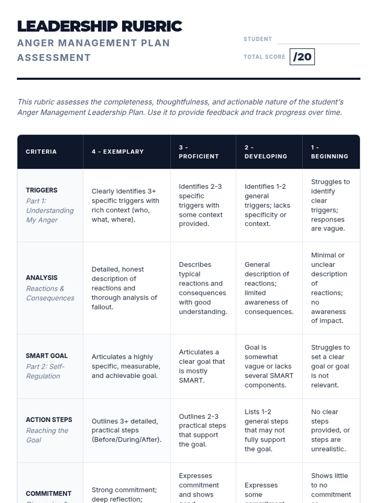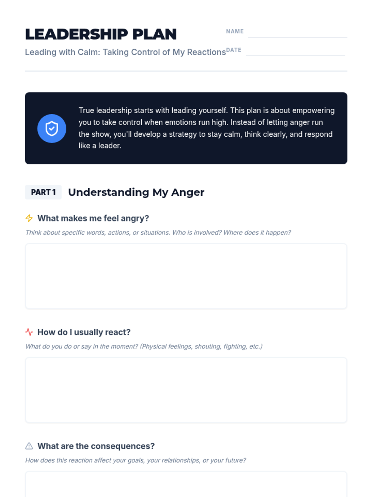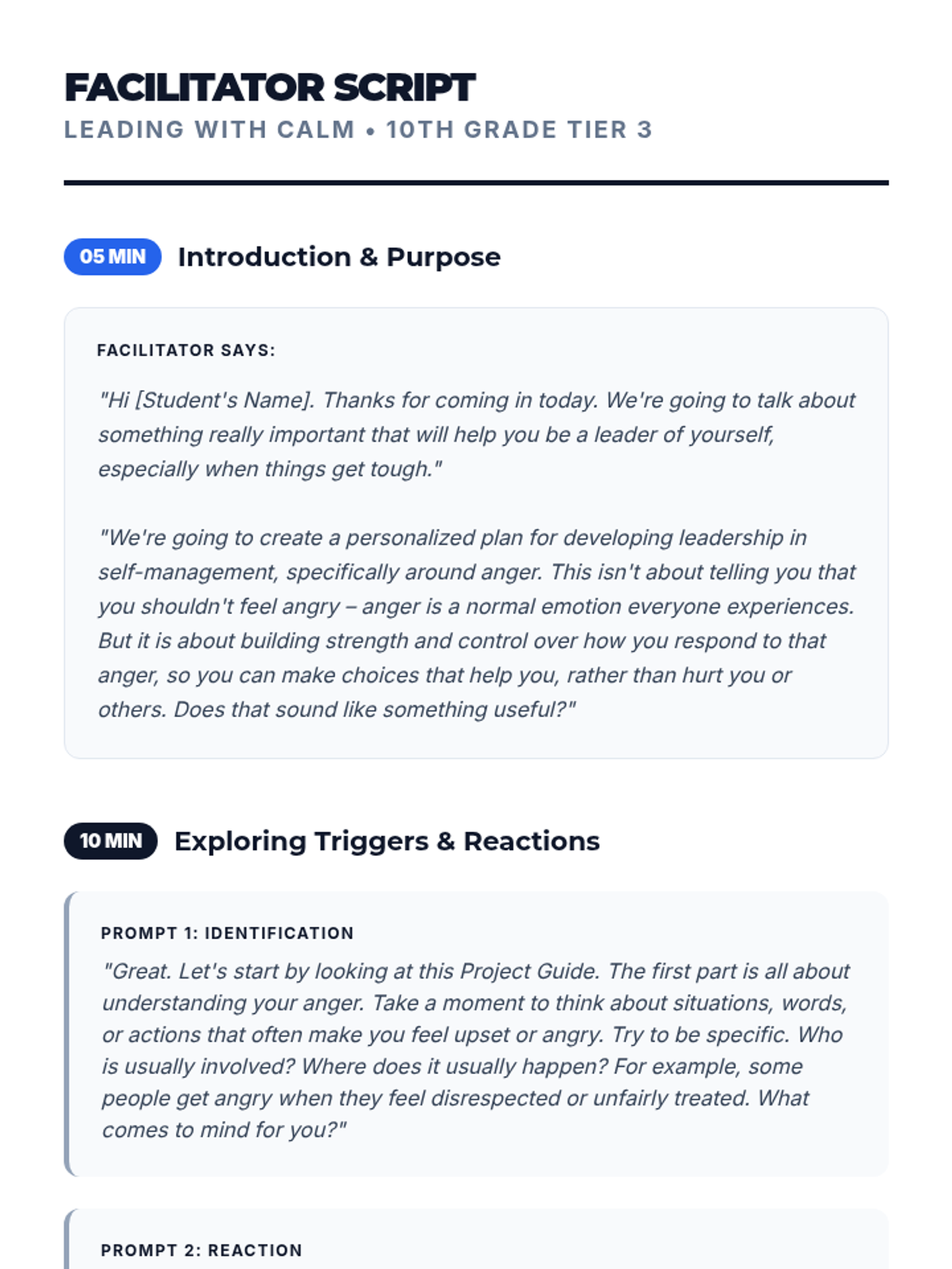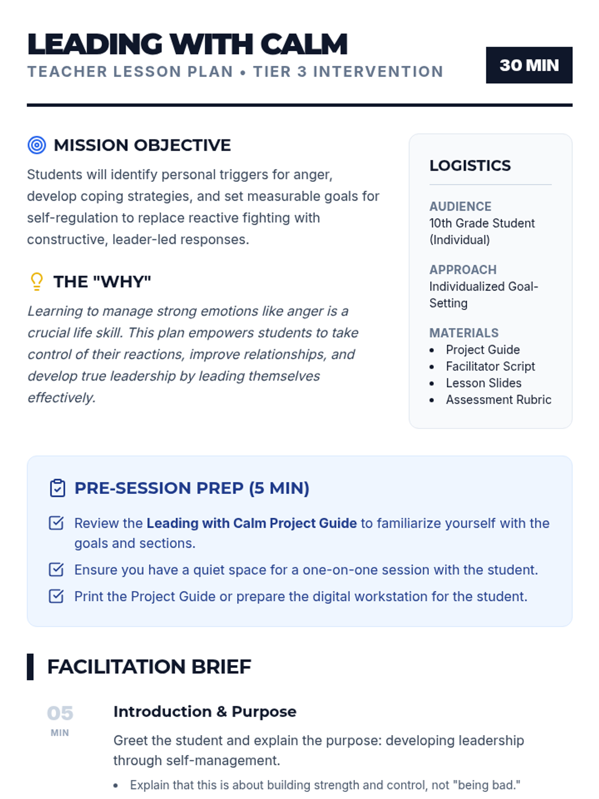 A 30-minute Tier 3 individual intervention designed for a 10th-grade student to develop self-regulation skills, identify anger triggers, and create a SMART goal-based leadership plan for constructive emotional responses.
