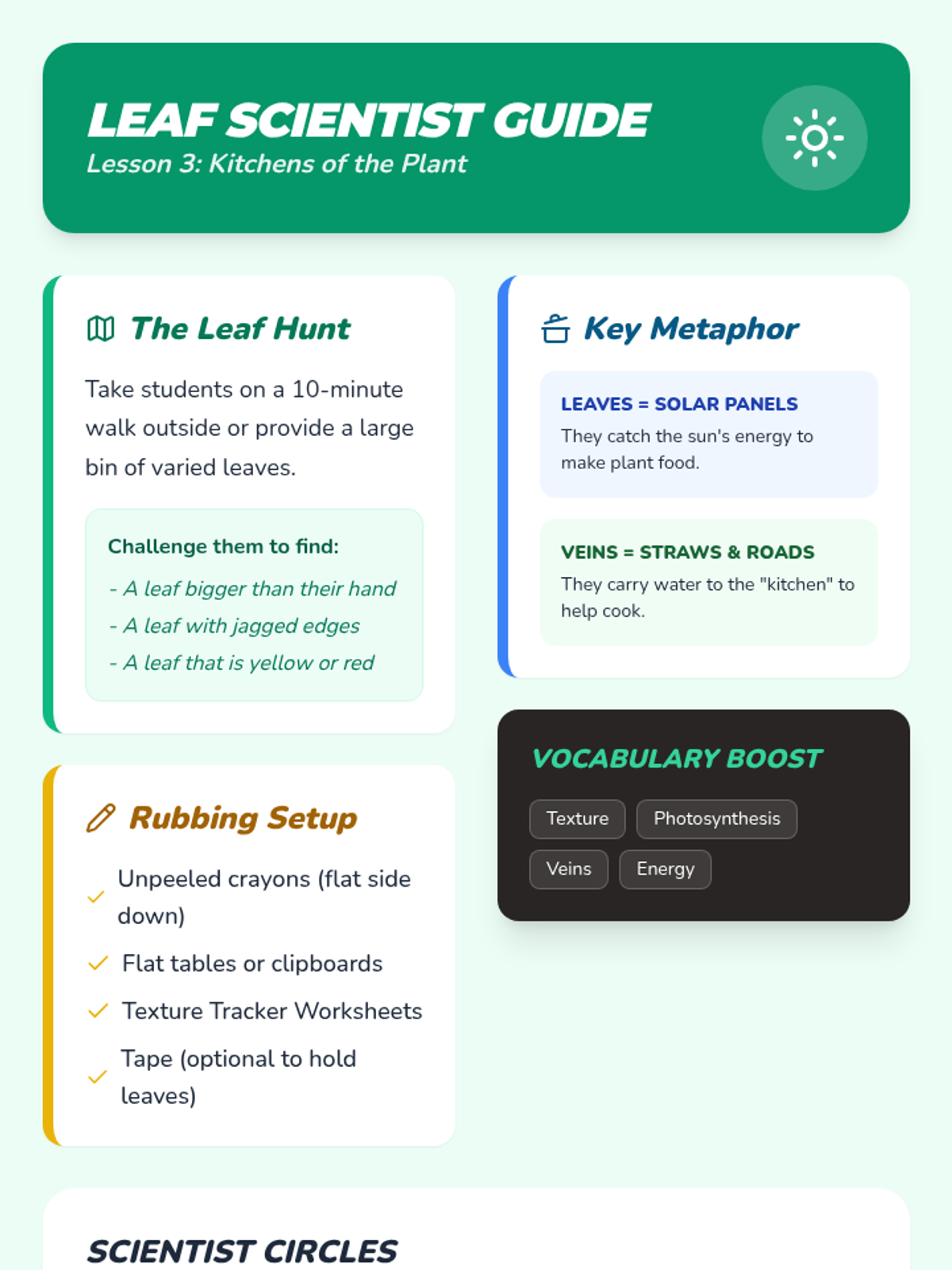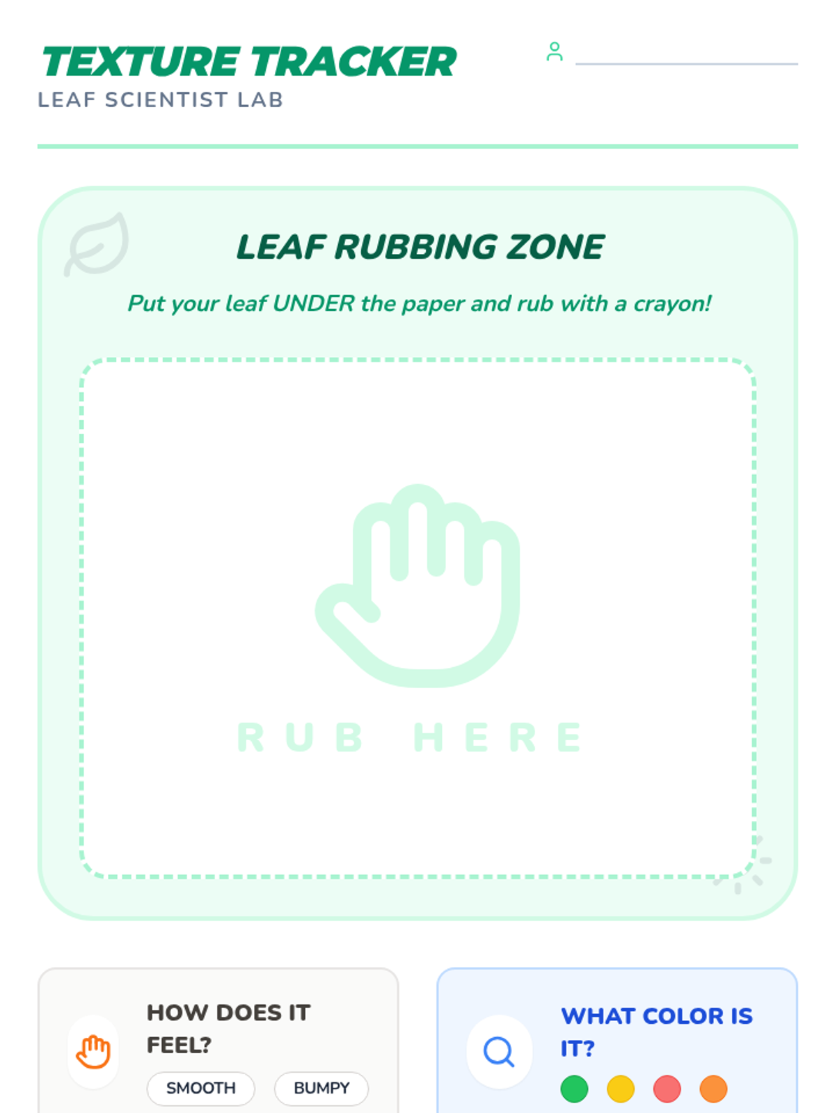 Students collect and compare leaves, using rubbings to explore textures and learn how leaves catch sunlight.
