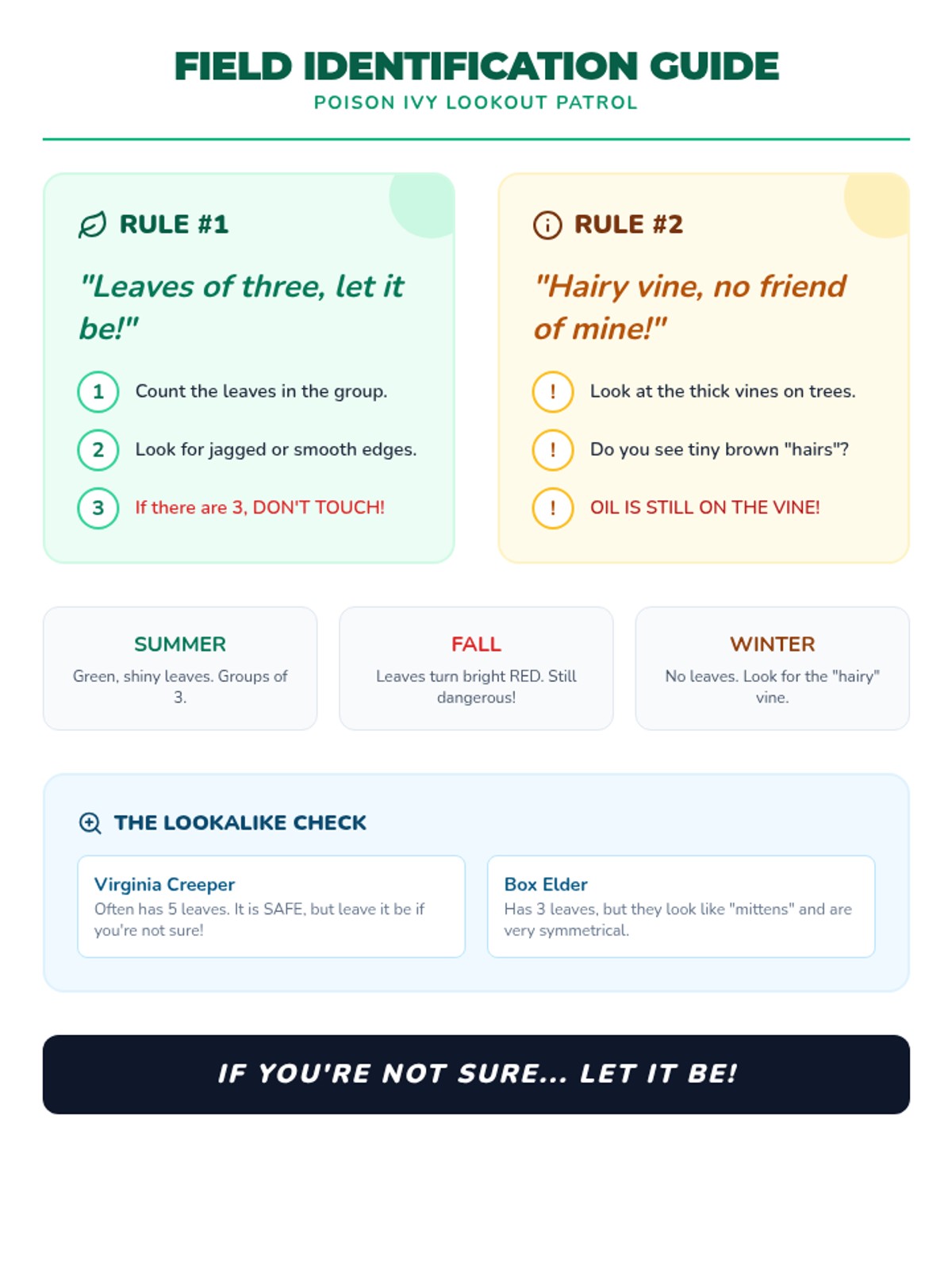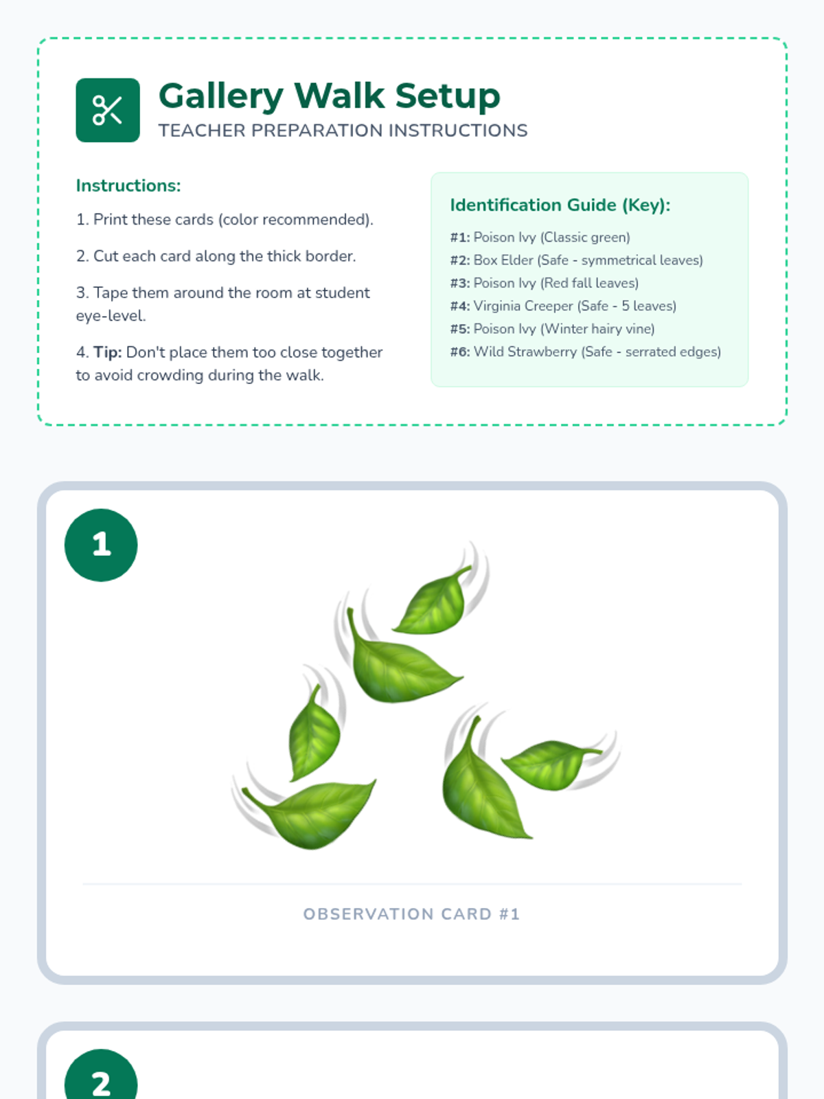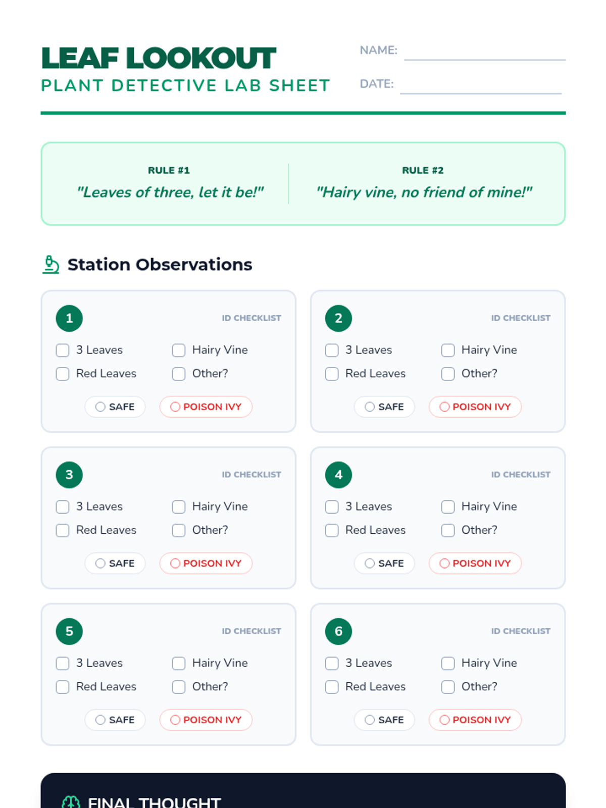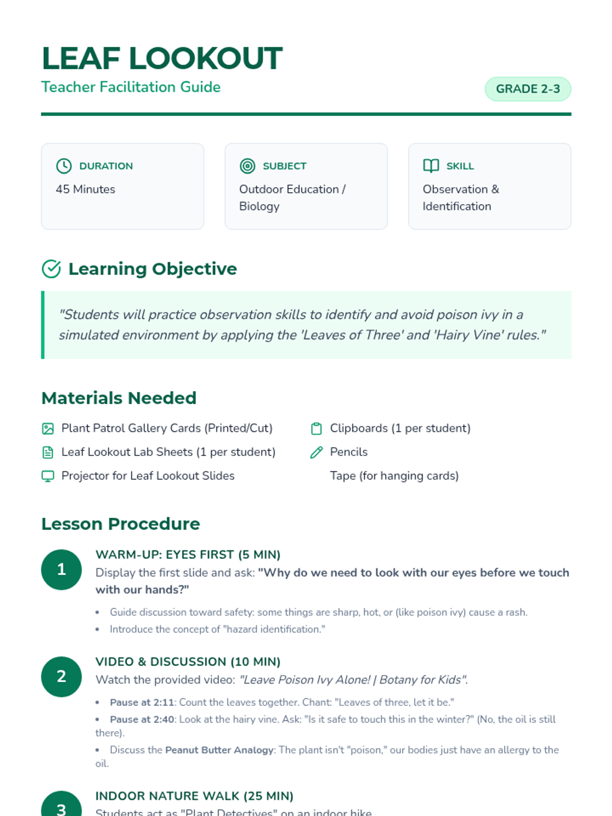 A lesson for 2nd-3rd graders on identifying poison ivy and practicing the 'look before you touch' rule through a simulated indoor nature walk.