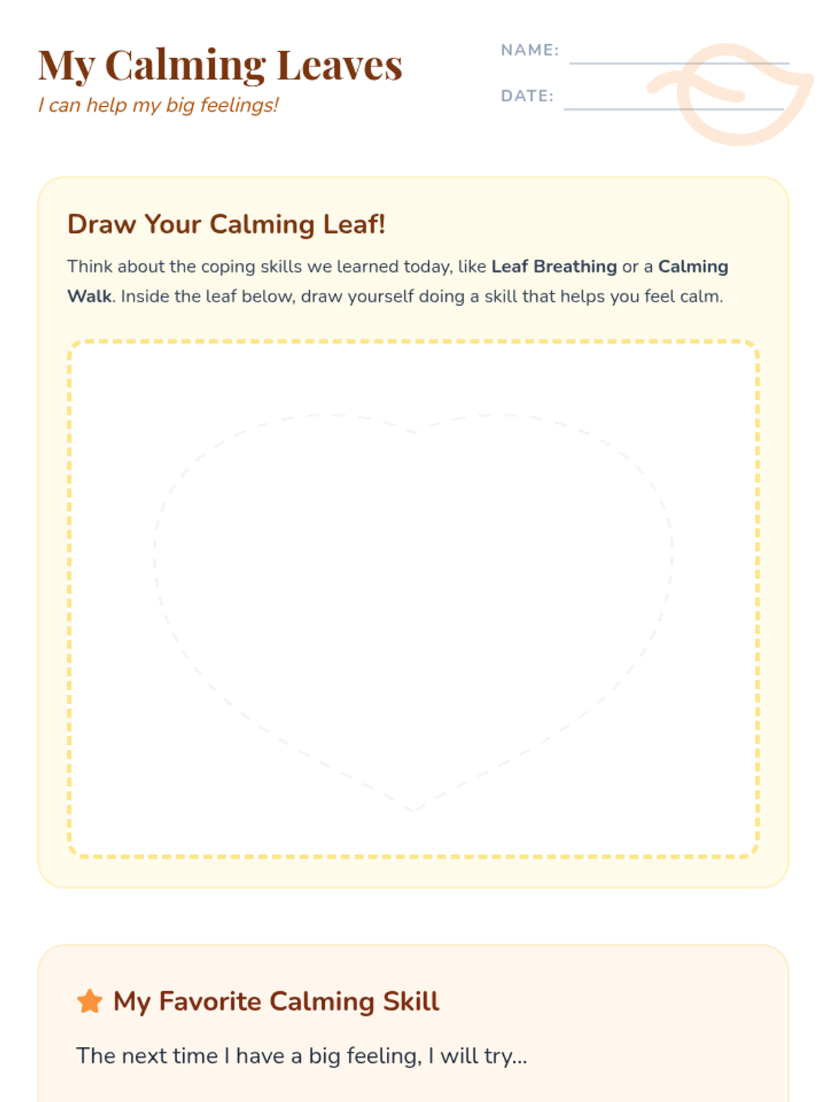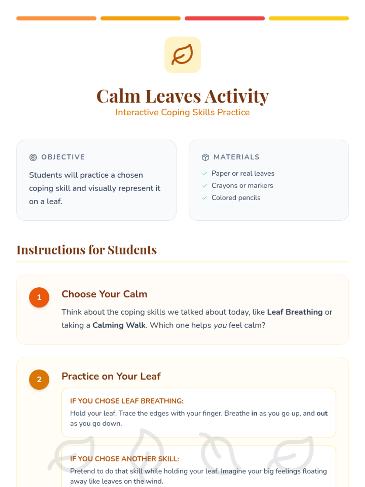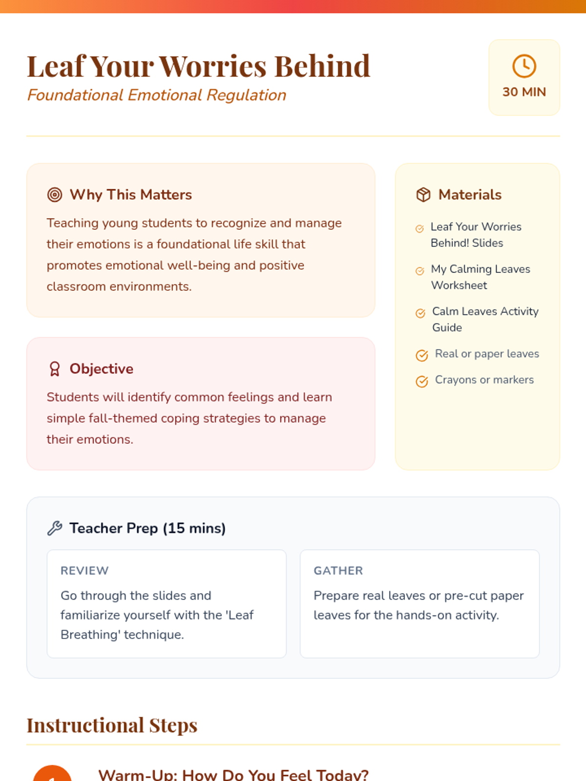 A 30-minute Kindergarten lesson that uses fall imagery to teach students how to identify emotions and use simple coping strategies like 'Leaf Breathing' and 'Calming Walks'.