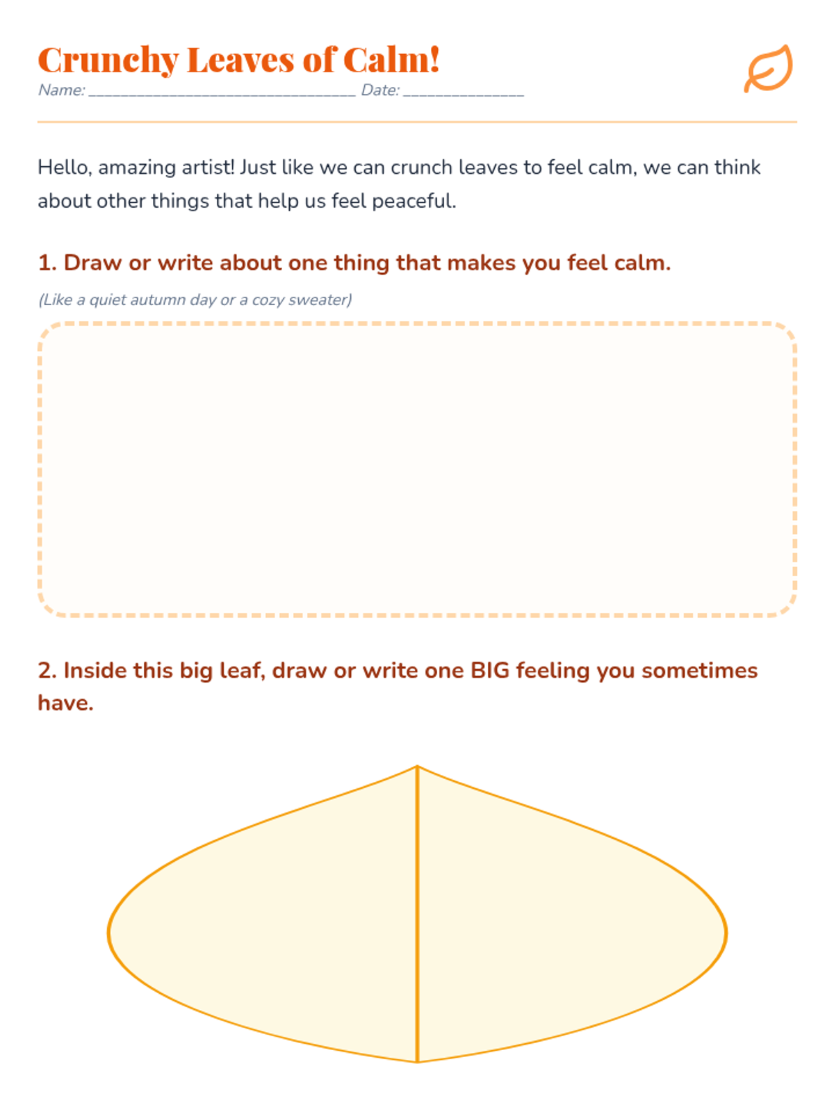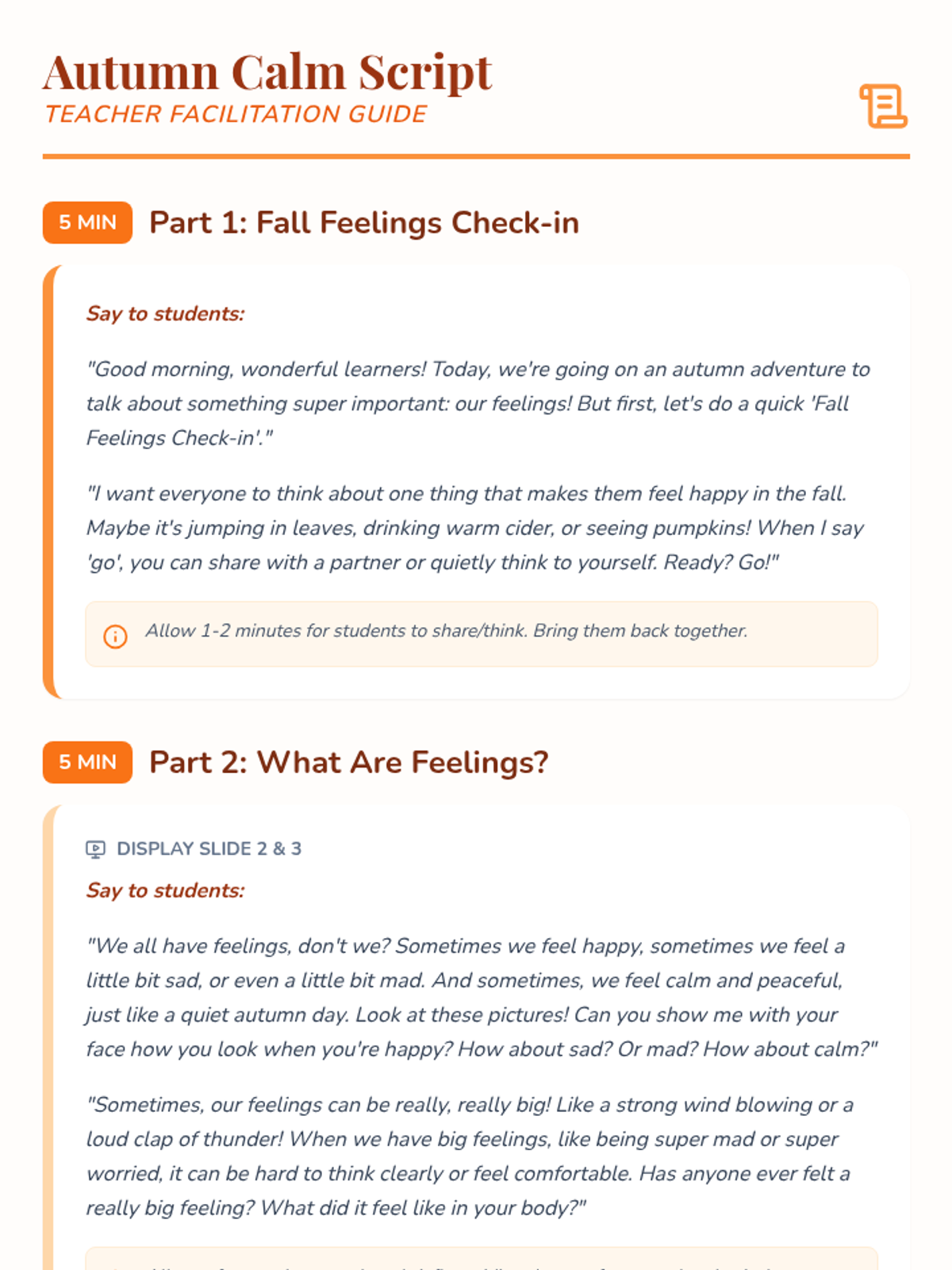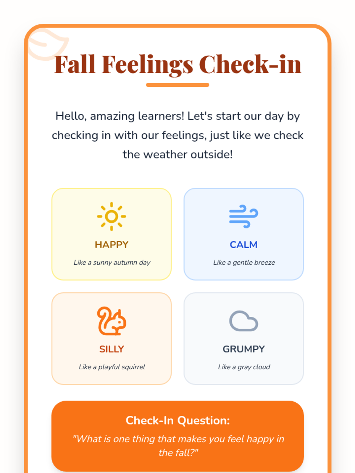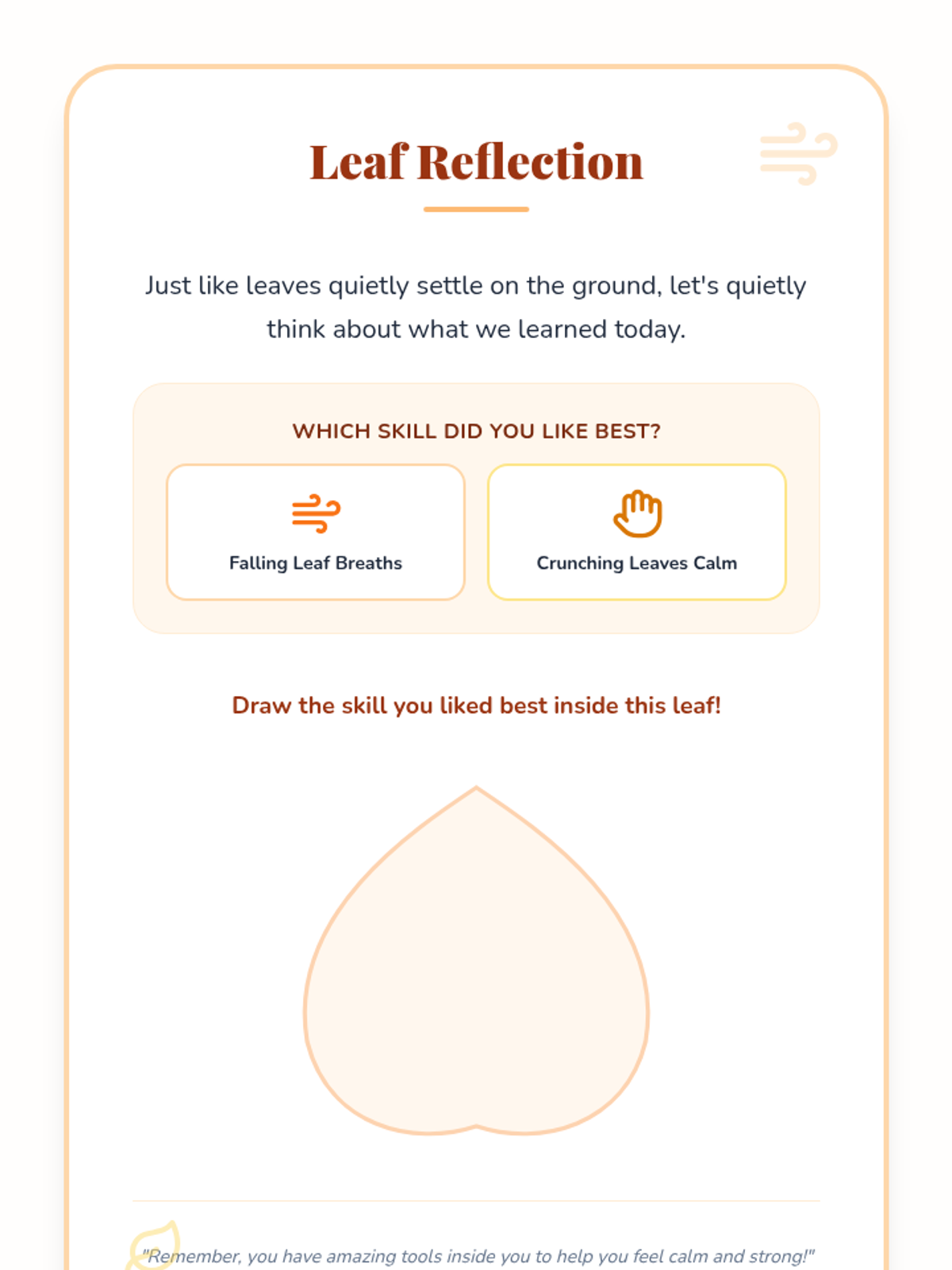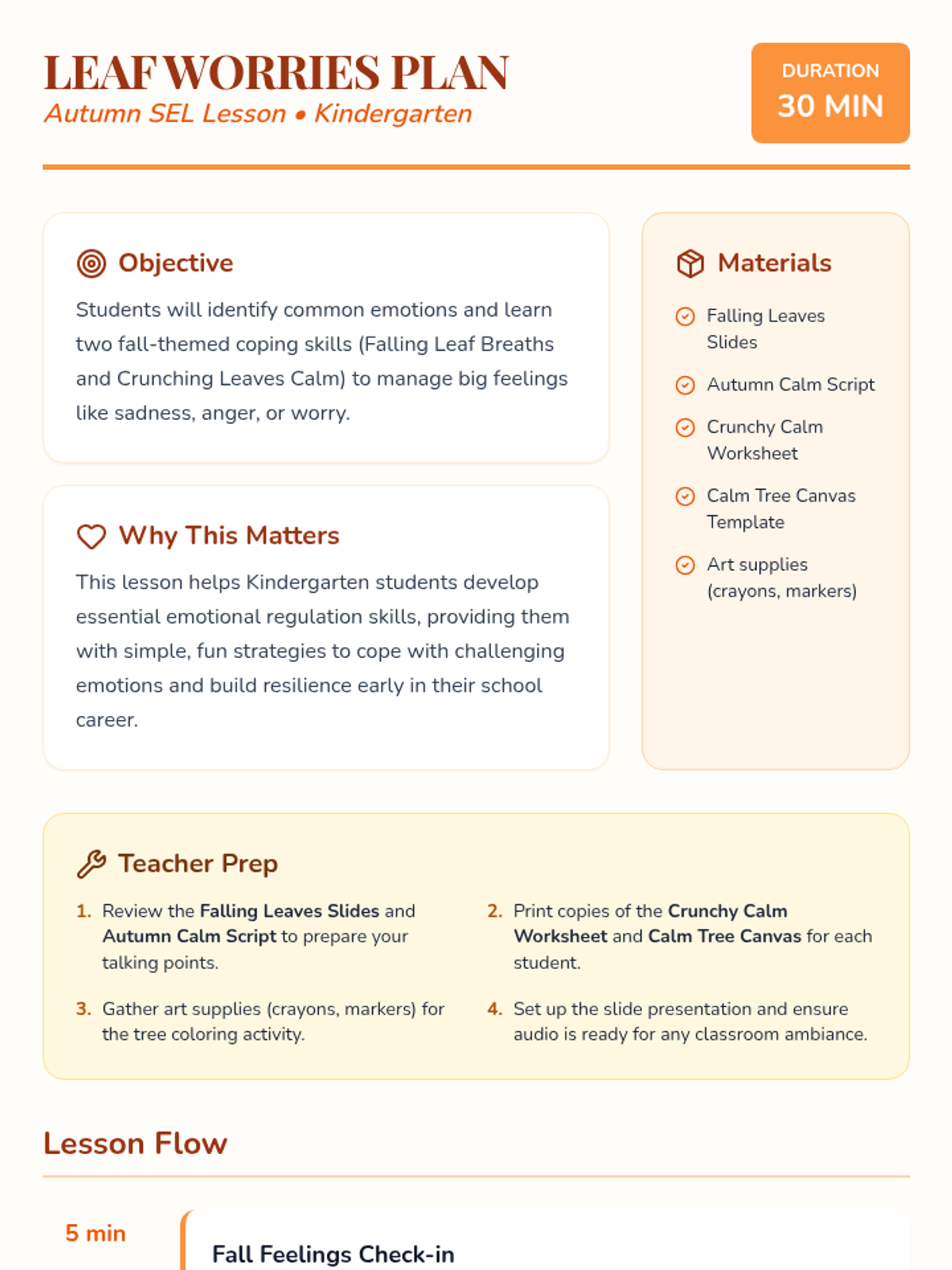 A single-session Tier 1 SEL lesson for Kindergarten students that teaches fall-themed emotional regulation skills like 'Falling Leaf Breaths' and 'Crunching Leaves Calm' to manage big feelings.
