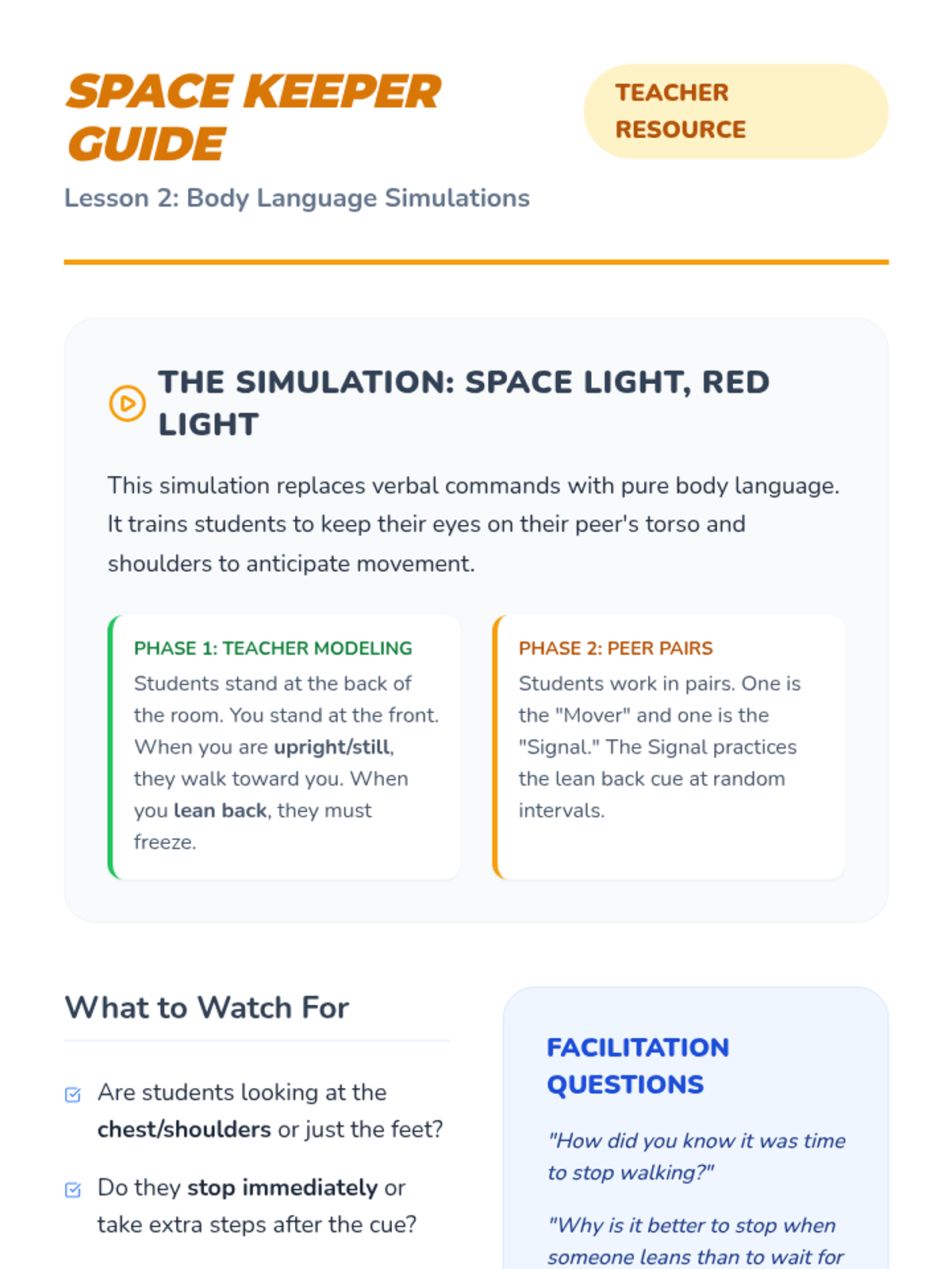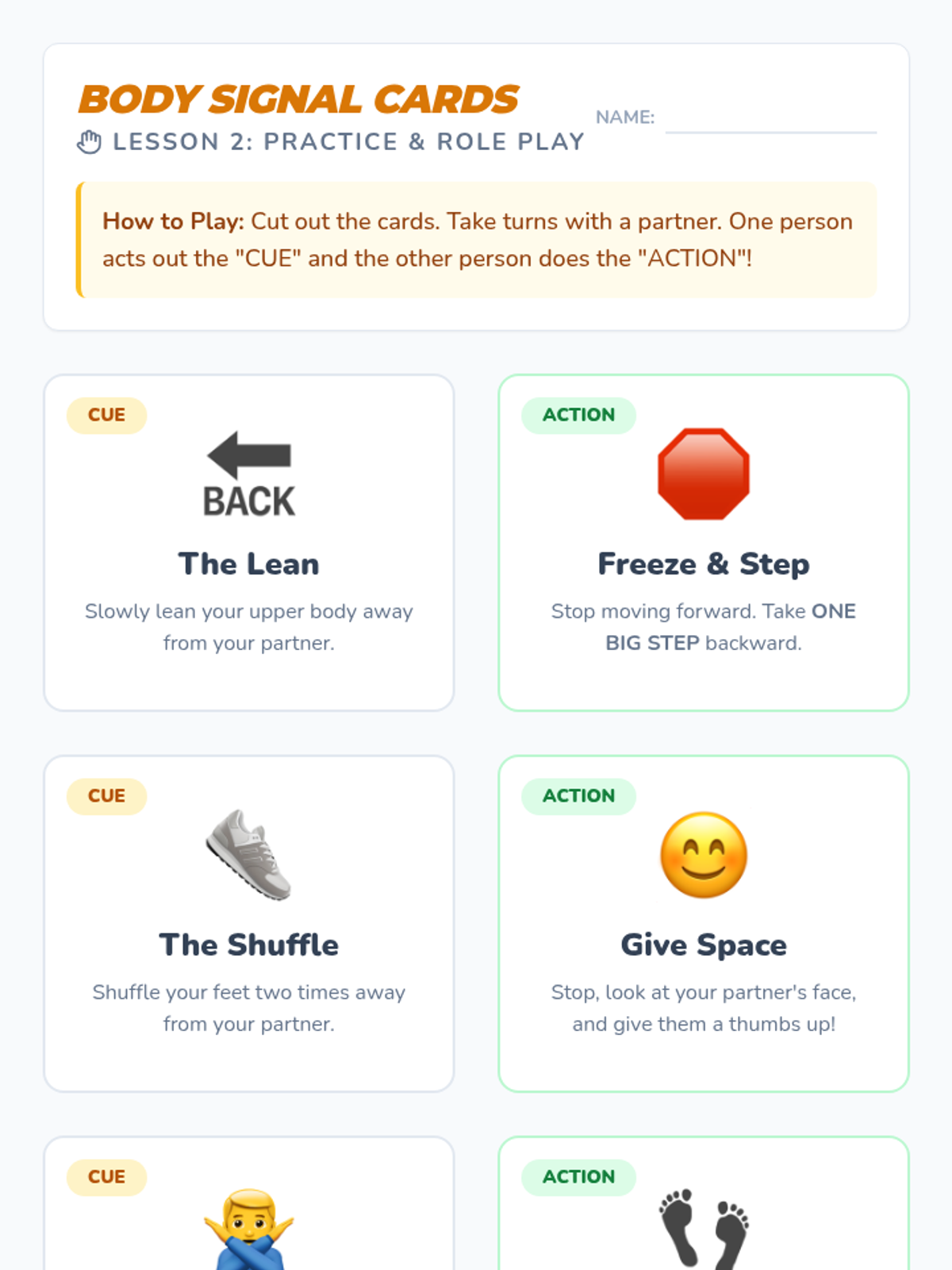 Students focus on specific body language cues like leaning back or stepping away as signals to stop or give space.