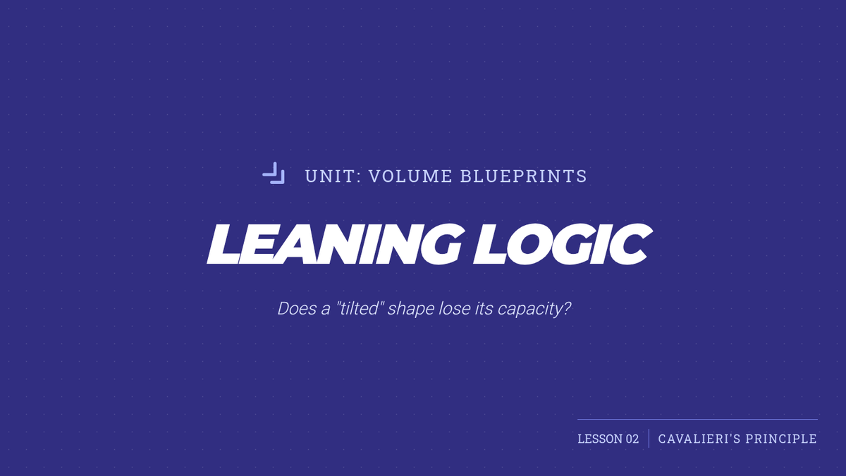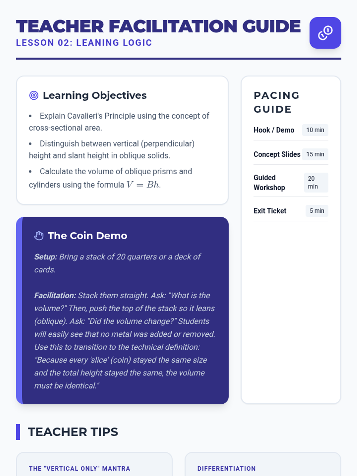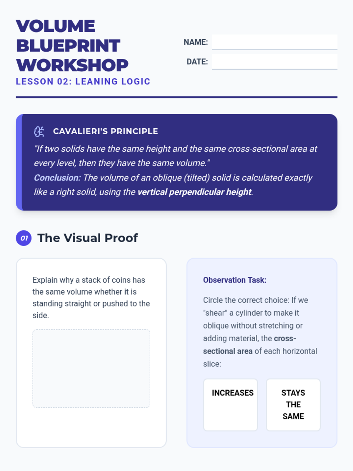 Students use stacks of objects to conceptualize Cavalieri's Principle, proving that shearing a solid maintains its volume, and apply this to oblique figures.